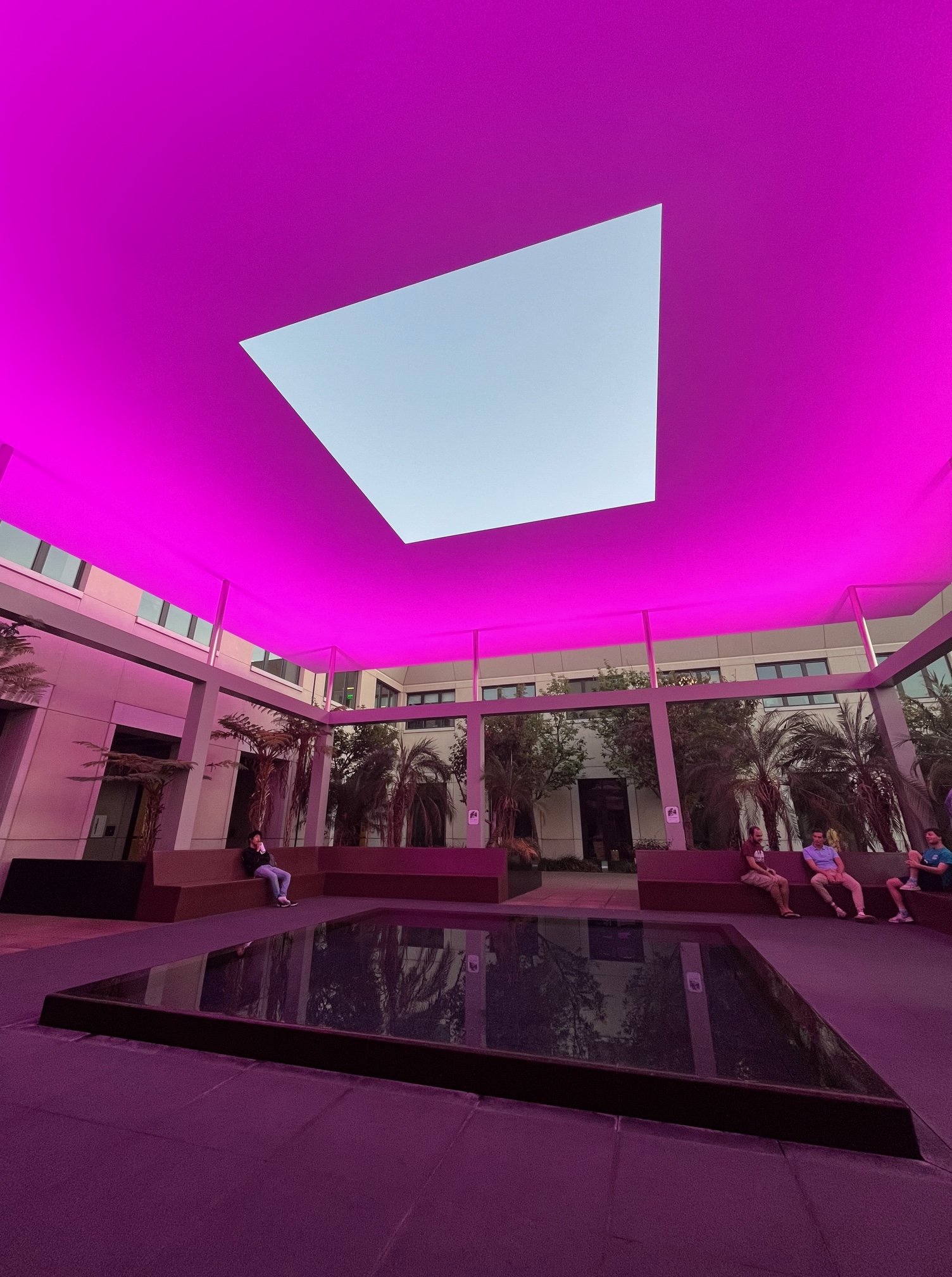 The premise of the Skyspace is simple, but incredibly effective. Within the courtyard is a metal canopy with a square hole cut in the middle, giving you a view of the sky through the canopy. Benches surround a reflecting pool in the middle of the courtyard. It’s a lovely place to sit anytime of the day, but the real draw are the light “shows” at sunrise and sunset, when the whole canopy is bathed in changing colors that create a vivid contrast between the artwork and the framed sky. The evening show starts 25 minutes before sunset and continues for an hour, and shouldn’t be missed.
