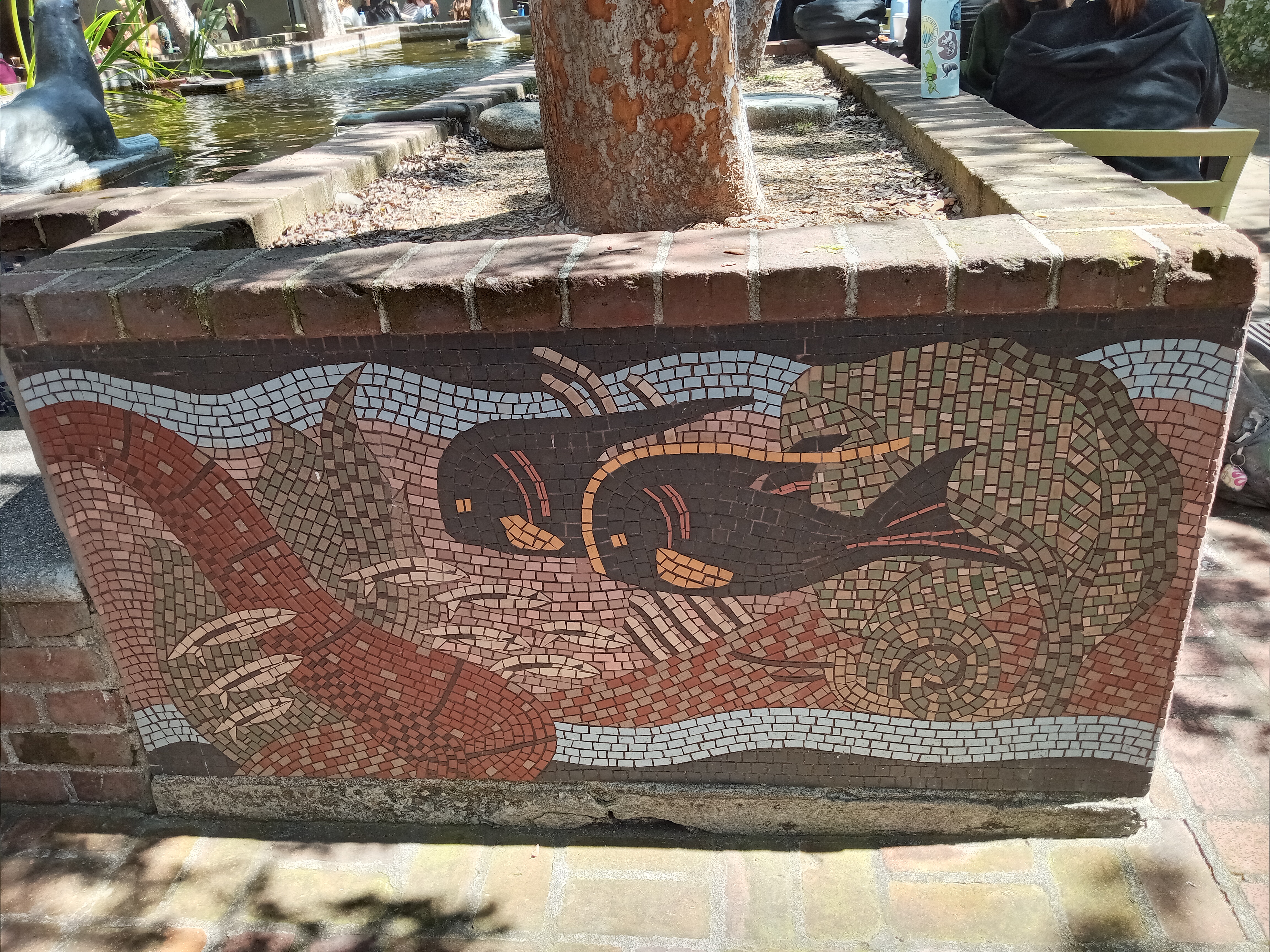 Entering from the corner of 9th and Columbia, the main student commons will be on your right, with a little cafe with outdoor seating. Poke around inside the building and you’ll find a wonderful shady courtyard with seating for the coffee shop, which will be crowded with students on any day during the semester. The highlight of the courtyard is a koi fountain in the center adorned with a pair of sea lion fountains (turned off when we visited, but still cute) and an elaborate and beautiful tile mosaic of marine life around the base.