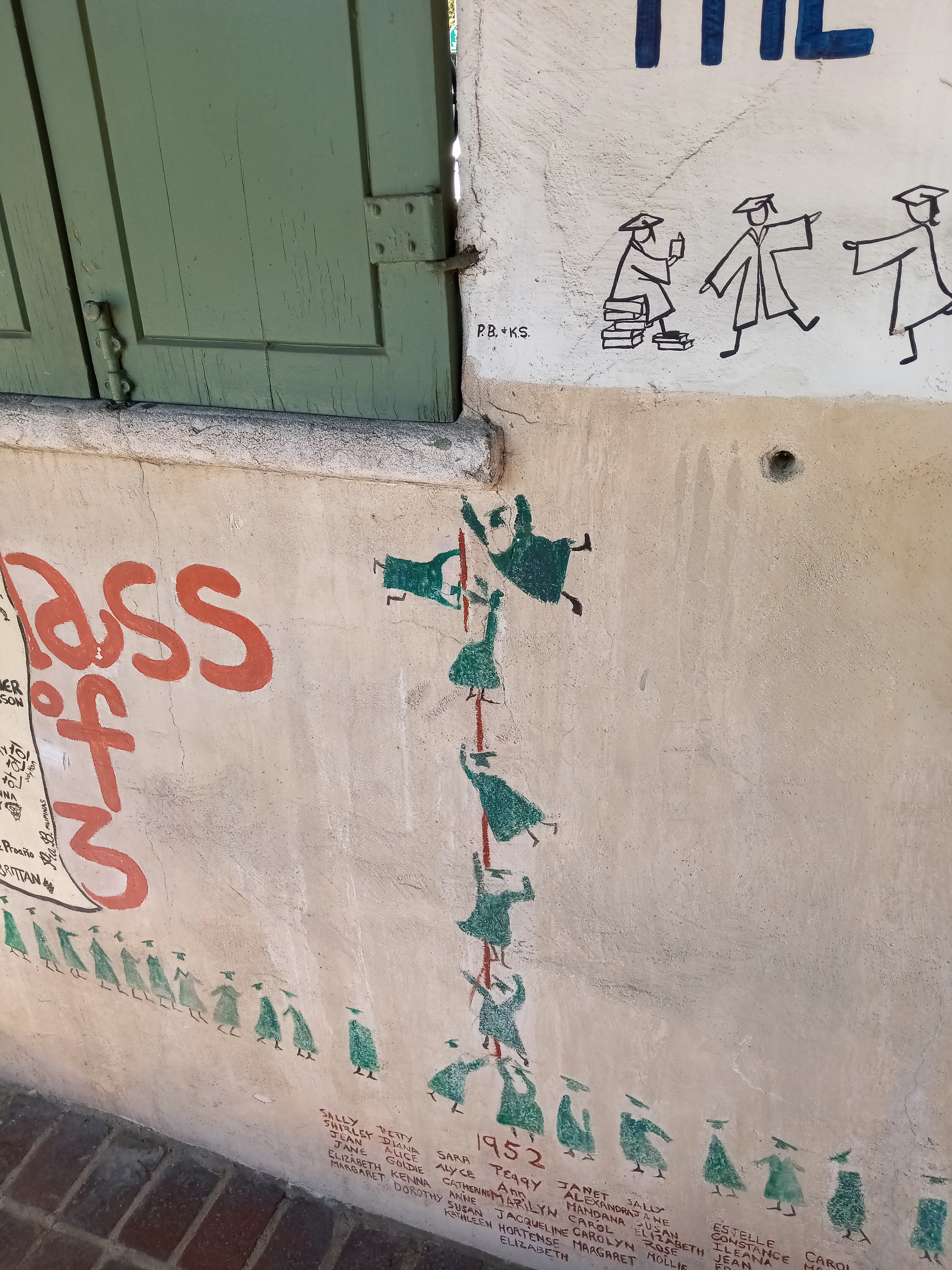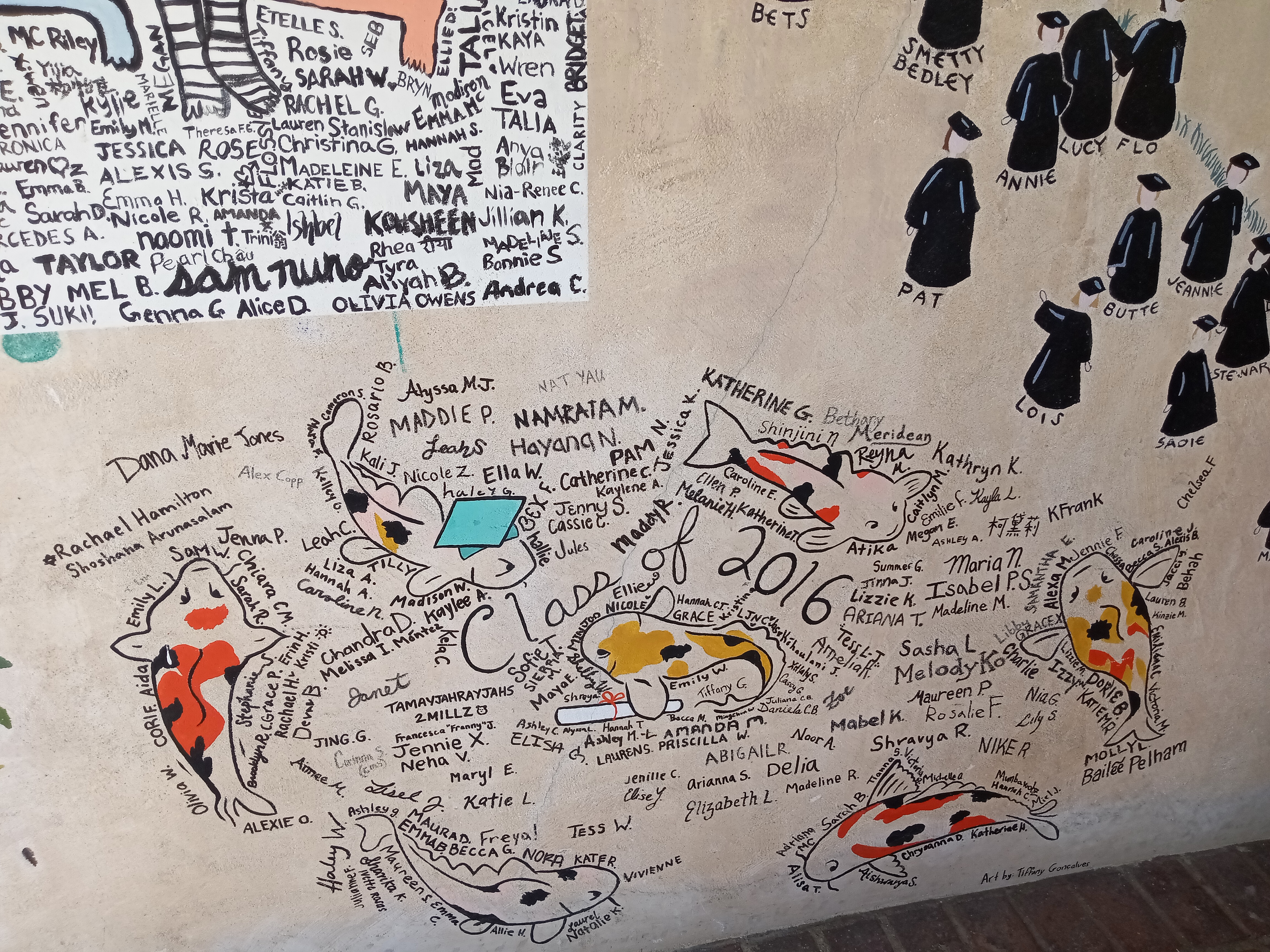 Returning to the quad and continuing north, the grassy lawn gives way to a rose garden, with a trellis marking the path out of the northern edge of campus. At the gate is a unique feature, a wall covered in farewell messages from graduating classes of Scripps College students, dating back to the founding of the school. The designs can be quite elaborate and you can even get a sense in changing tastes in art over the decades, not to mention that a lot of them are quite creative and funny.