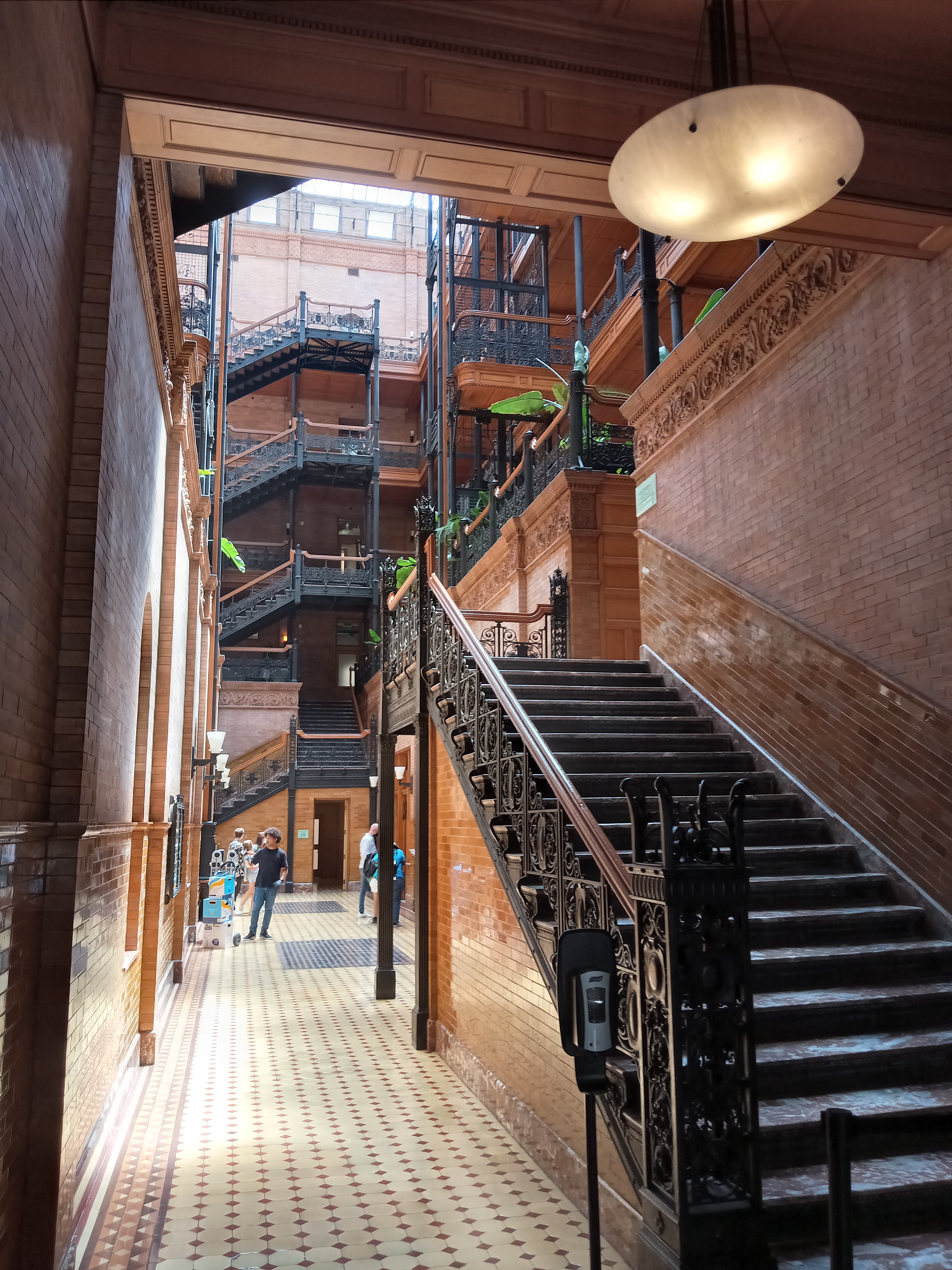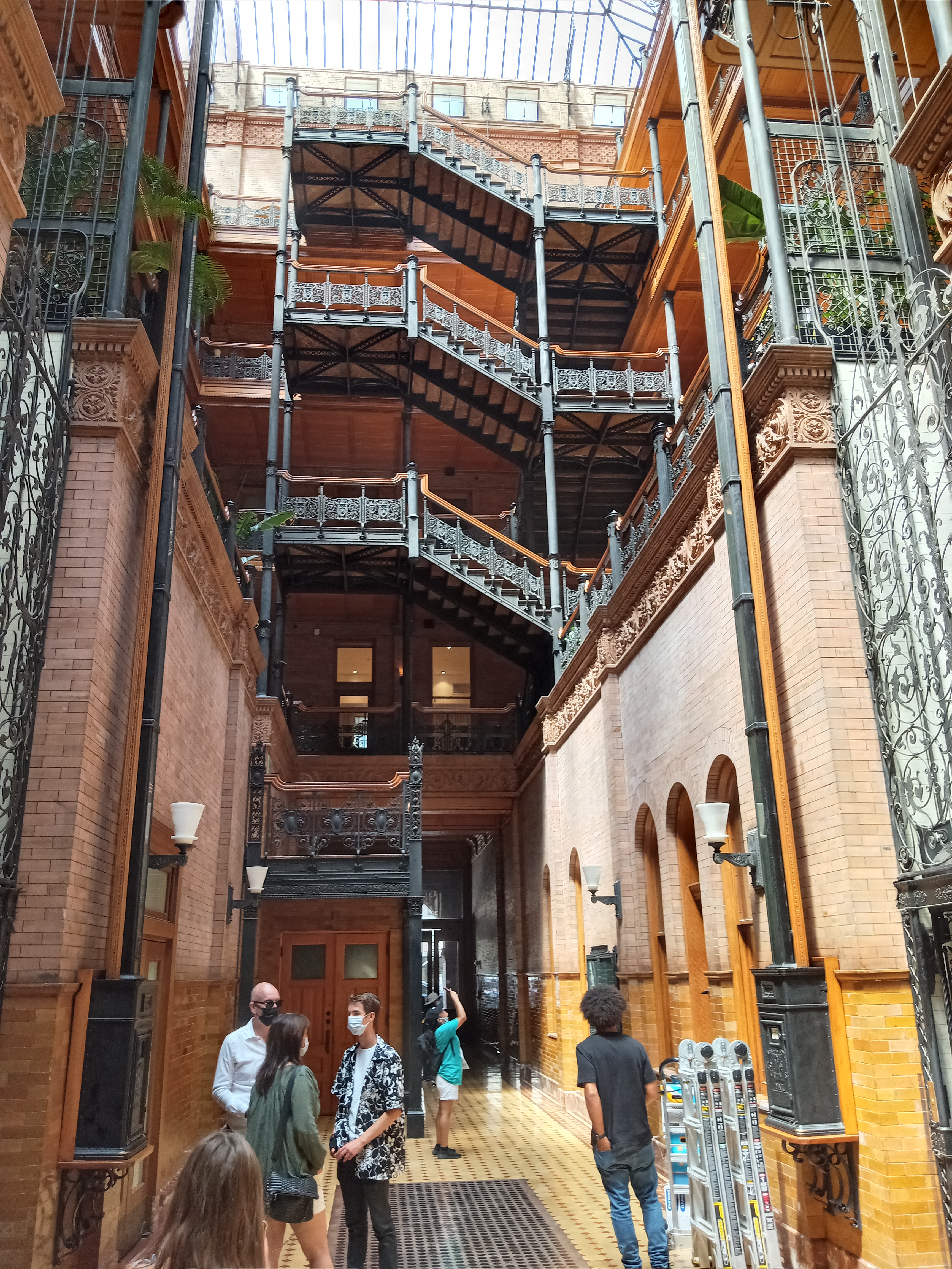 Heading south down Broadway will take you into the historic district, with its numerous old movie palaces and century-old office buildings. The Bradbury Building, at the corner of 3rd & Broadway, is the most famous such structure, with its stunning interior court illuminated by a massive skylight and gorgeous Victorian architecture. It’s still a functioning office building, so visitors aren’t allowed past the ground floor, but it’s still worth the look. Generally it’s only open during weekday office hours, with very limited weekend hours.