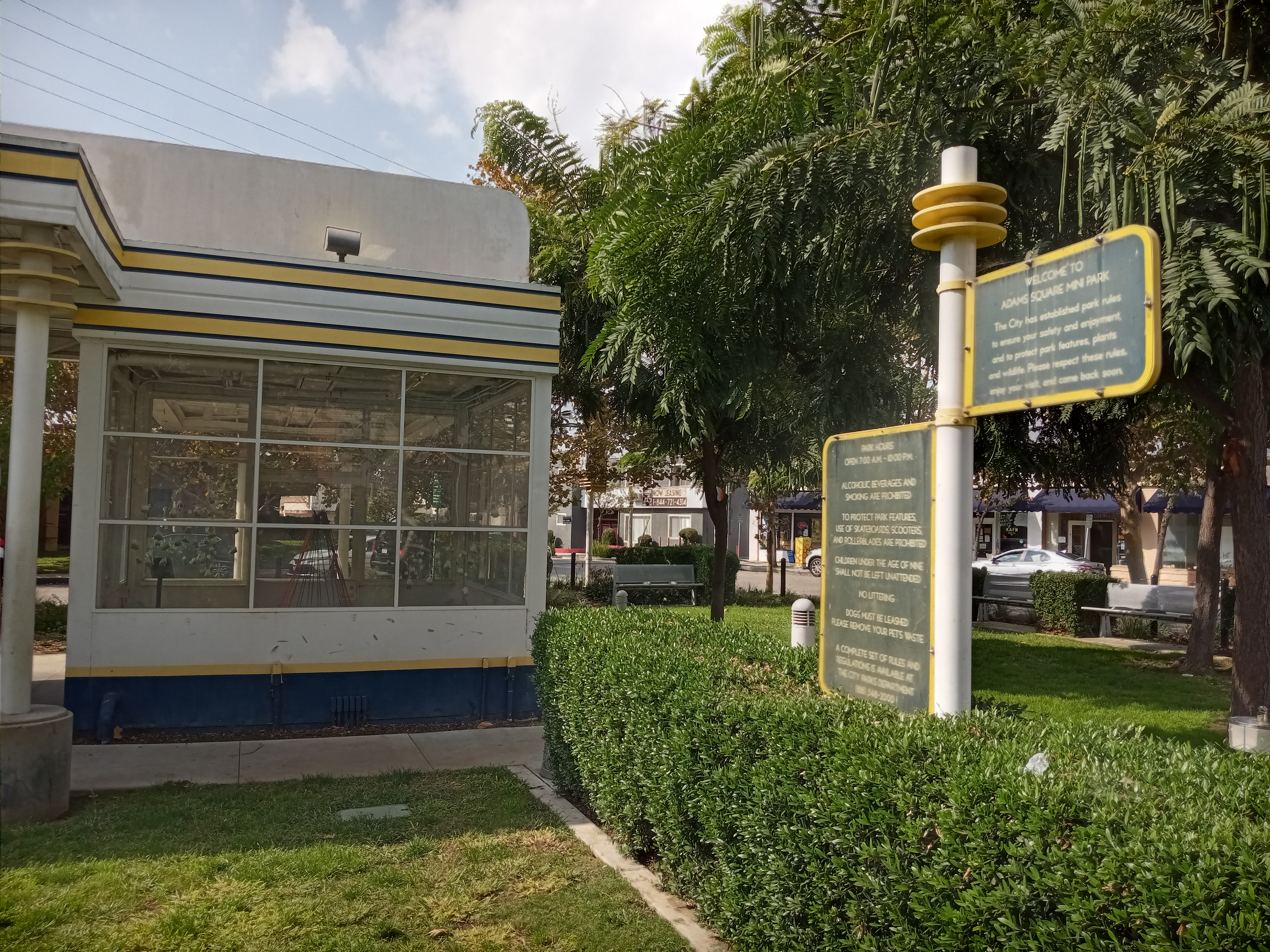 It also reveals the real highlight: Adams Square Mini Park, just across the street from the coffee shop. Built on the site of a former gas station, the 1930s streamline moderne gas station building was actually preserved and incorporated into the park, a rare example of such thoughtful historic preservation. The building now serves as a community gallery as well as a picnic shelter, with a nice playground sitting nearby. Take a moment to relax and enjoy the neighborhood before heading on your way.