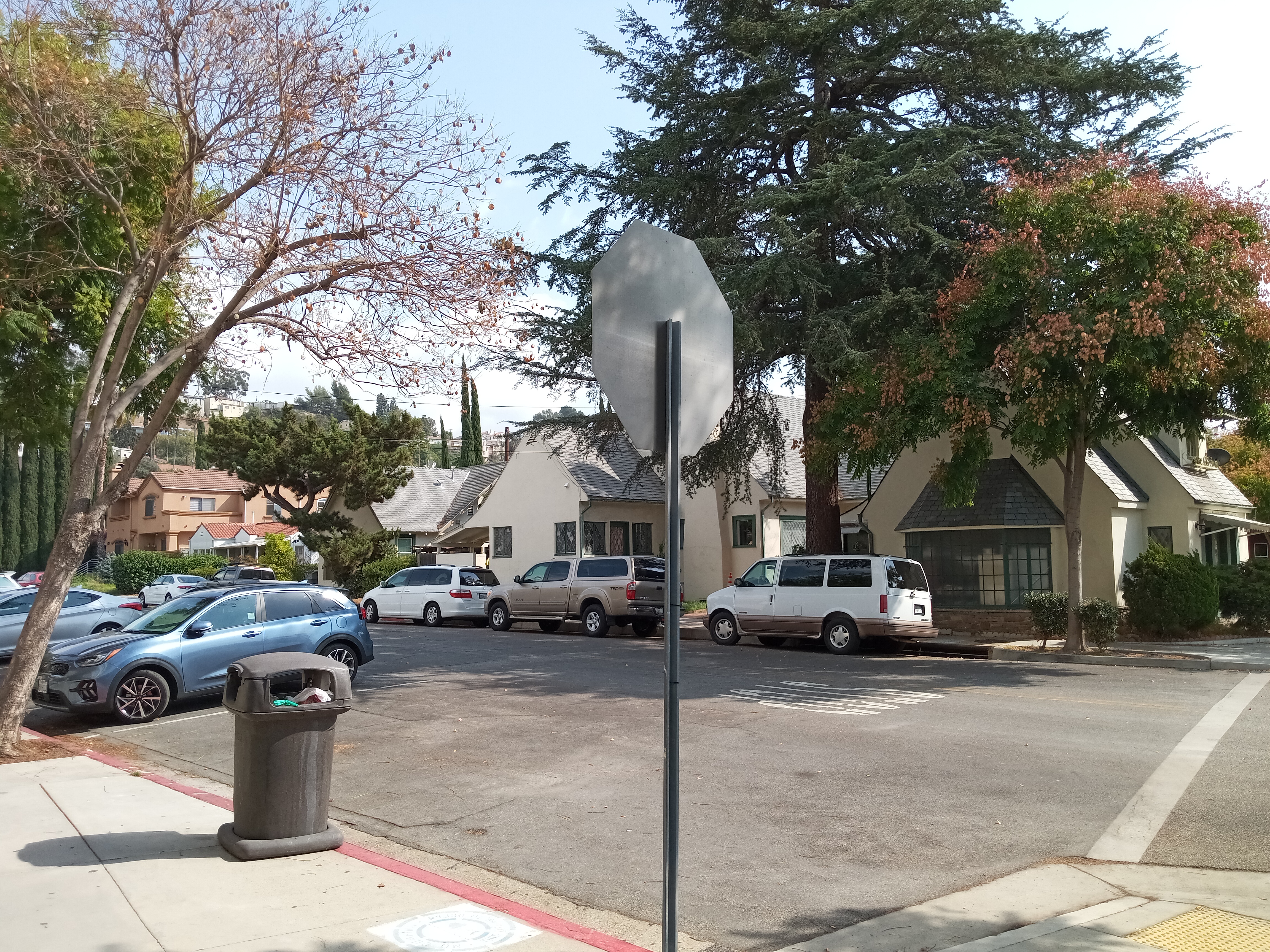 The intersection of Chevy Chase and Adams is dominated by a branch of the Glendale Public Library, held in a snazzy Art Deco building, with a nice little pocket plaza sitting just across the street. However, the real charm is found up Adams, walking up towards the hills to the south. After passing a few houses, Adams Street makes a very sharp curve, revealing a tiny commercial area with a small grocer and a coffee shop. (A surprising claim to fame for this little business district is the location of the original Baskin-Robbins, in the small, now-empty triangular building at 1130 South Adams.)