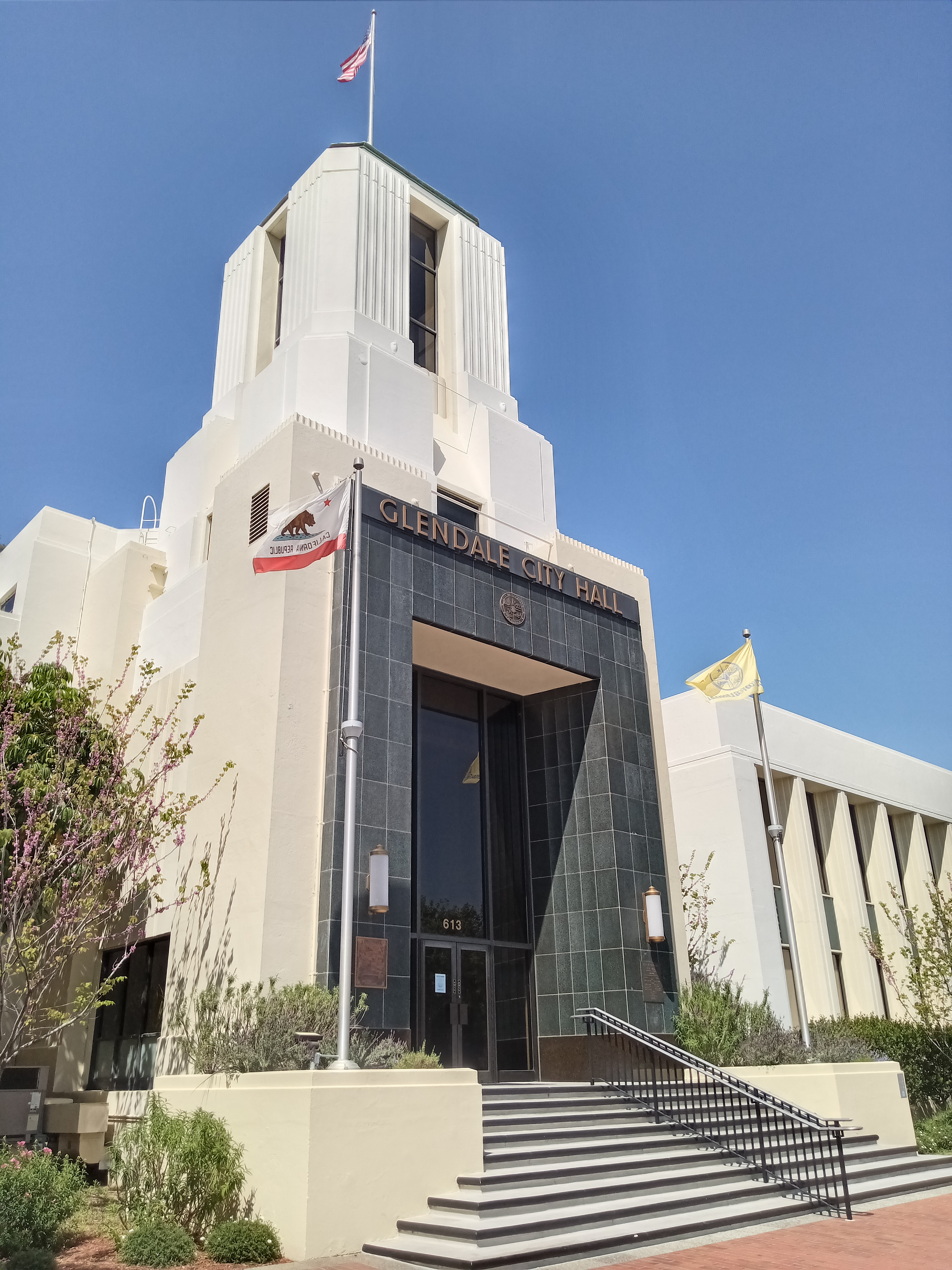 Glendale Civic Center: Located on Broadway five blocks east of Brand, Glendale’s city hall is a classy Art Deco building with a lovely looking tower facing the street. However, the far more interesting civic building is the Municipal Services Building, a 1960s modernist structure that is suspended in the air. Situated on the corner of Broadway and Glendale Avenue, this white concrete building is built on four pylons, allowing the visitor to walk through a nice courtyard plaza underneath.