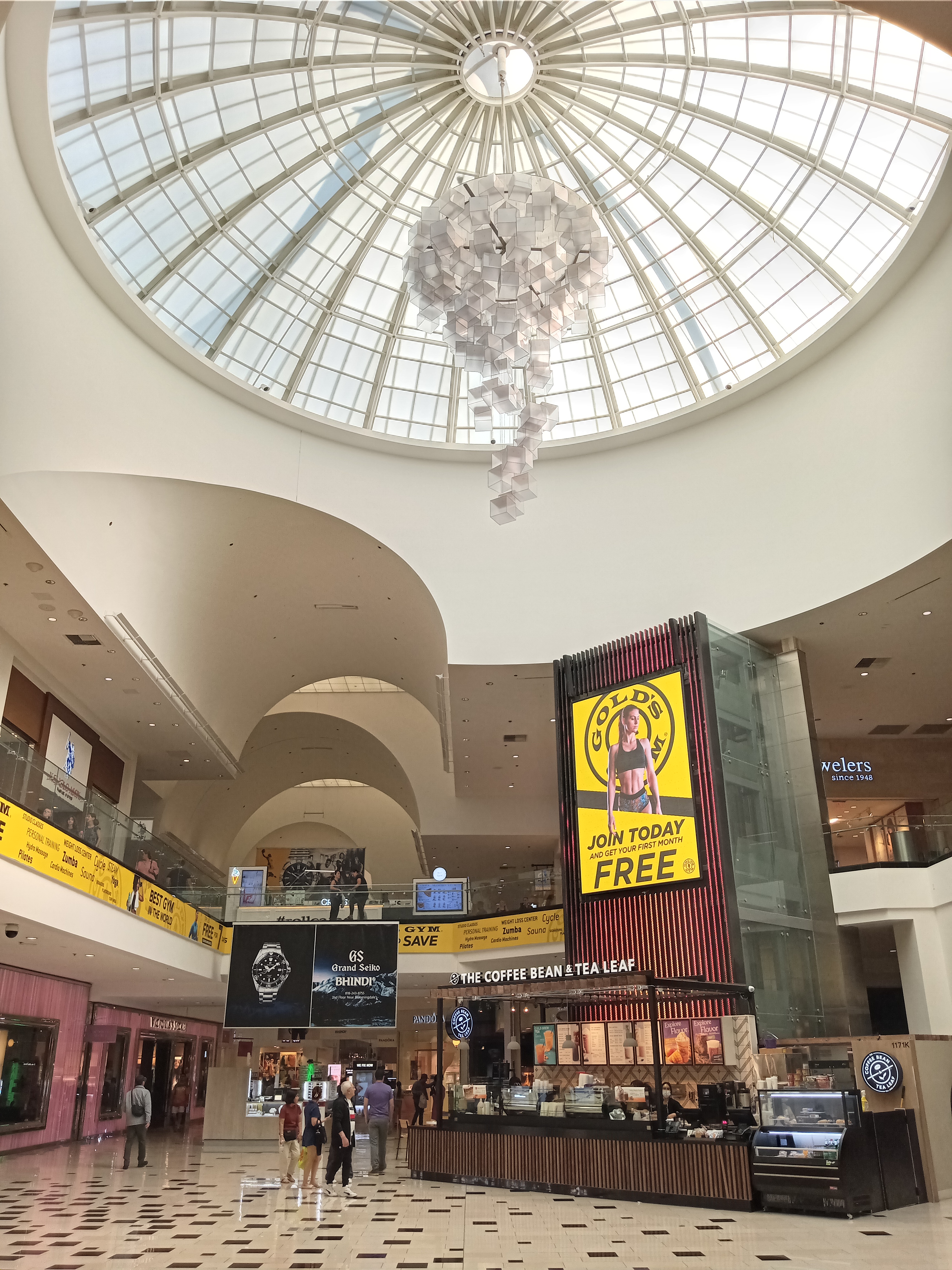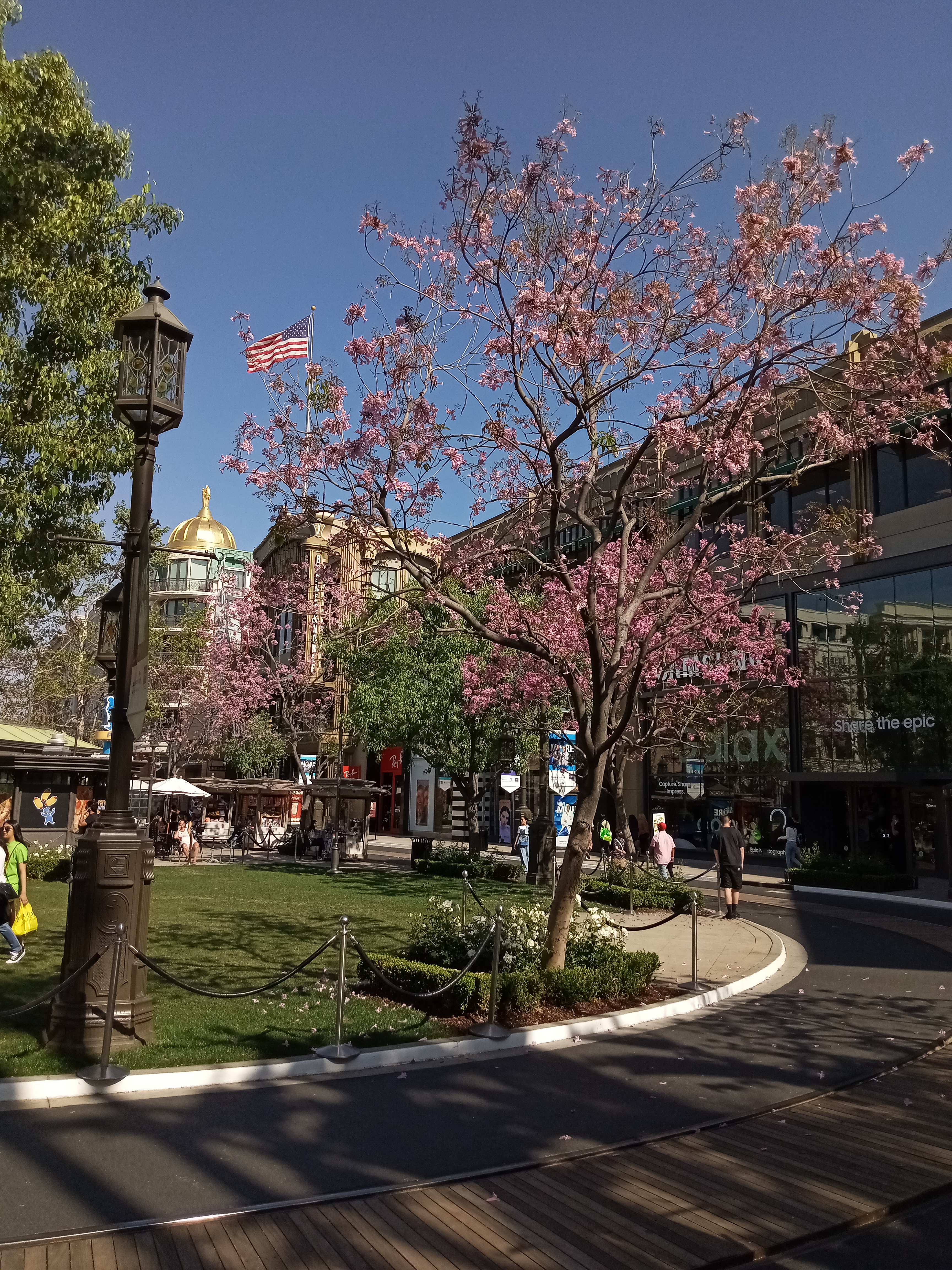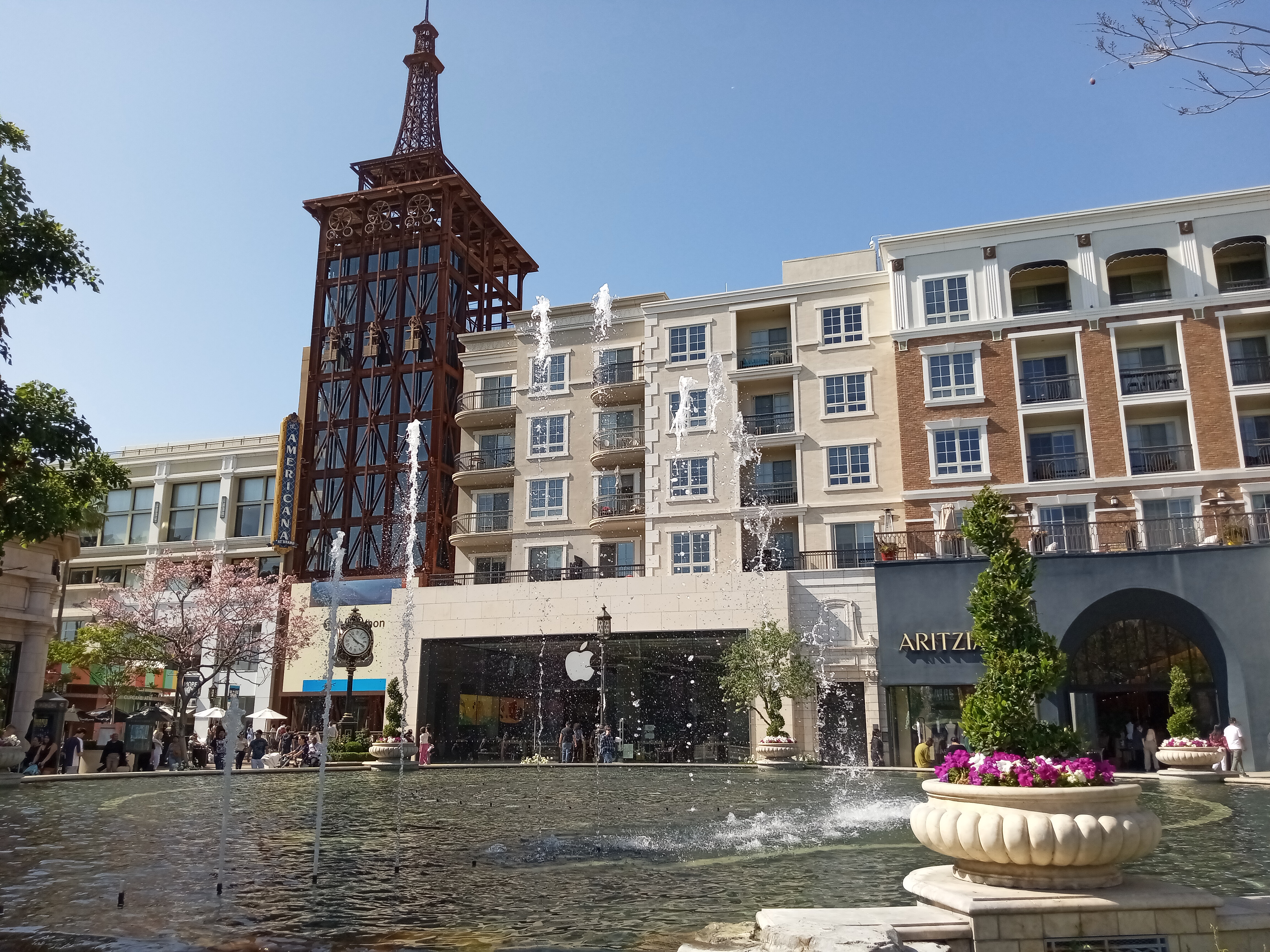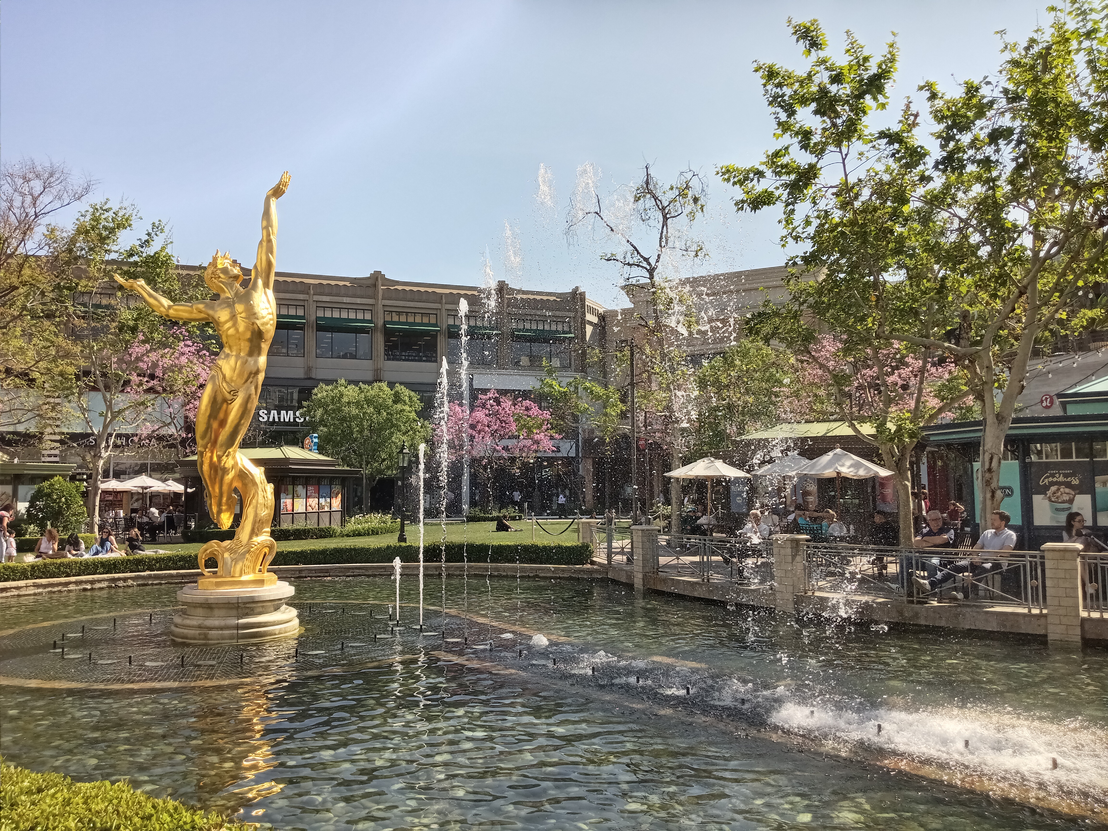 The Americana, on the other hand, is emblematic of the trend of outdoor “lifestyle centers” that were popular in the late ’90s and 2000s, with their town squares and attempts at creating a simulacrum of traditional urban development. The Americana is just a particularly gaudy example, brought to you by Rick Caruso of The Grove (and more recently, failed mayoral run) fame. There are various architectural flourishes throughout, although the references seem somewhat disjointed and jumbled, drawing from Art Deco, Neoclassical, and vaguely industrial architecture. The centerpiece is the dancing fountain, where jets of water shoot into the air around a golden statue. On busy days, you’ll likely see a trolley—much like the one in The Grove—looping through the mall.