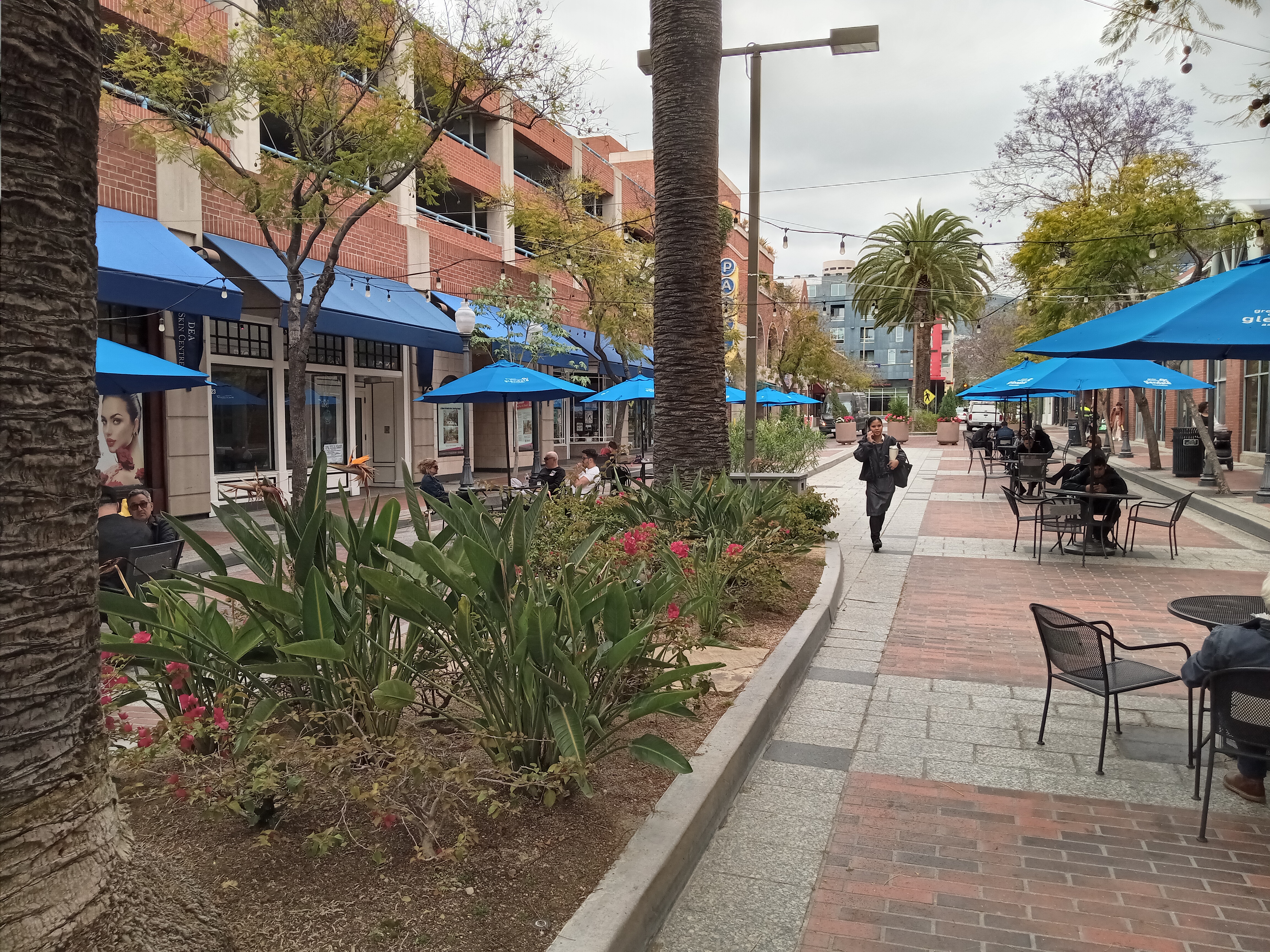 On your way back to Brand, you can also check out the nice pedestrian plaza on Artsakh Avenue just north of Broadway. Here, the middle portion of the block is given over to pedestrians, with some dining tables and planters in the middle of a quiet shopping center.
