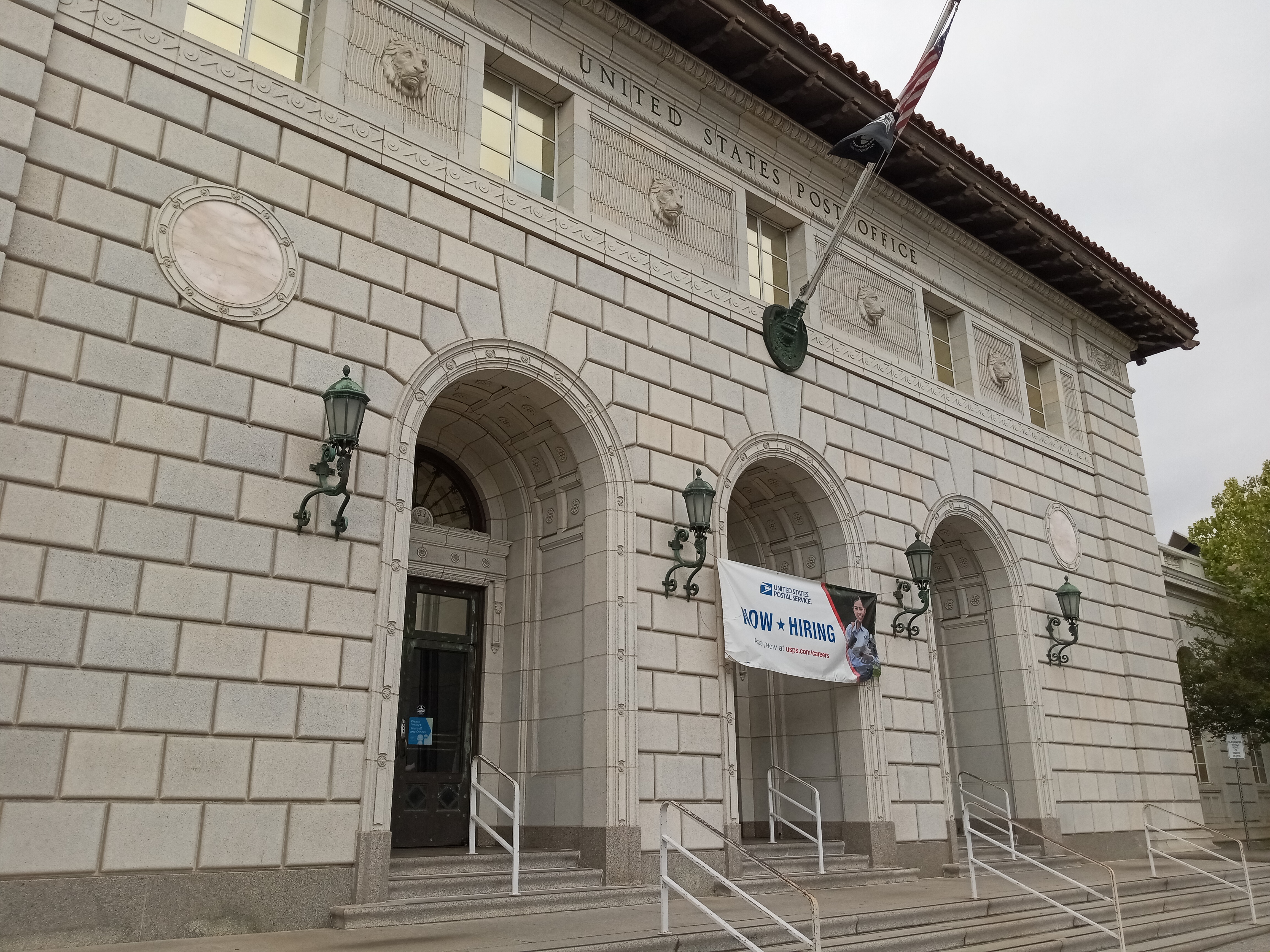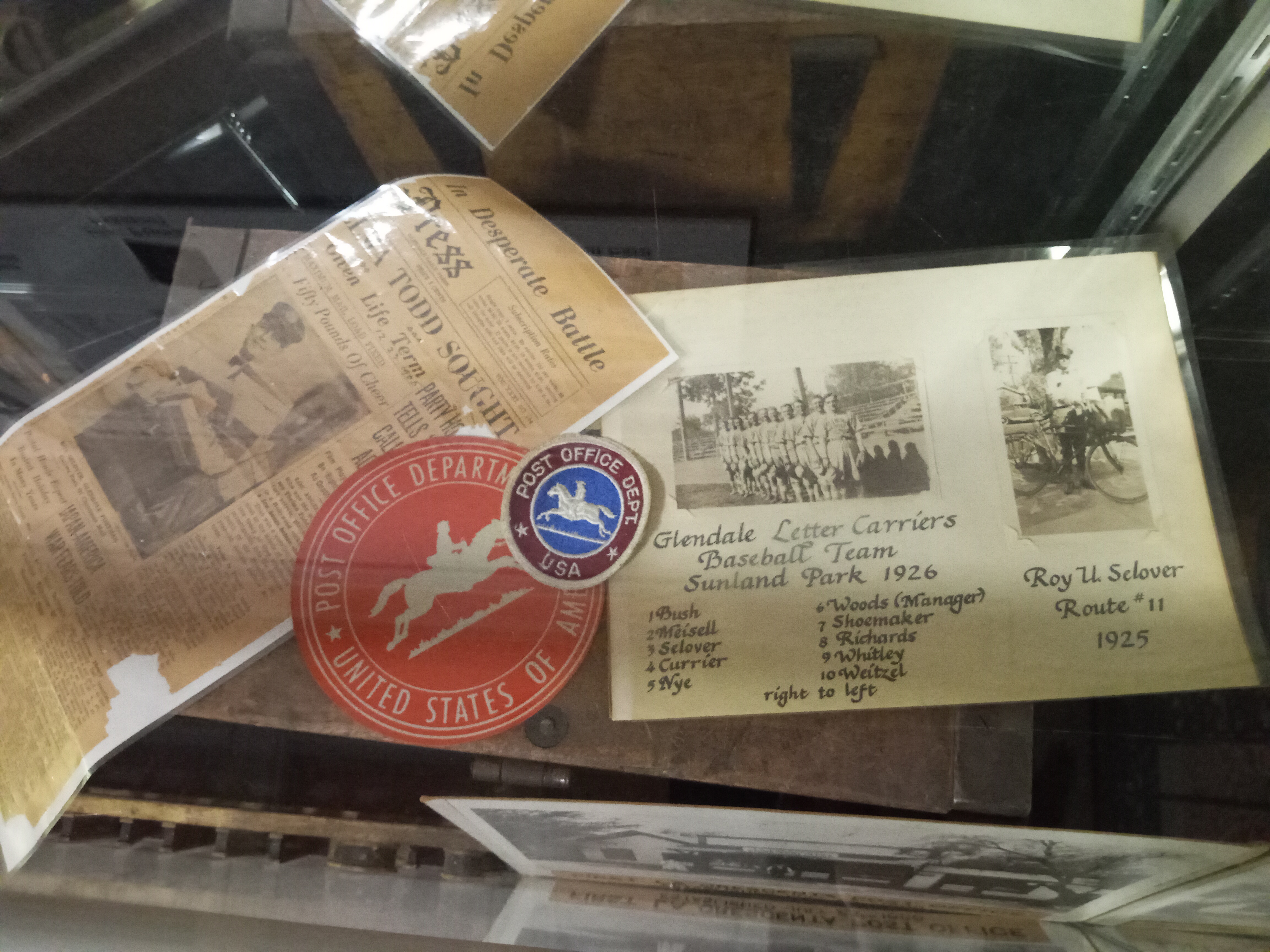 Another nice civic building to check out is the main post office, which sits on the north side of Broadway halfway between the civic center and Brand. It’s a handsome Italianate building, with an impressive lobby of arched windows and lovely flourishes. But the best part is if you go through the closed door to the passport center, you’ll find a pair of display cases full of historic postal service artifacts from the Glendale area, including old mailbags, postman hats, photographs, and old letters.
