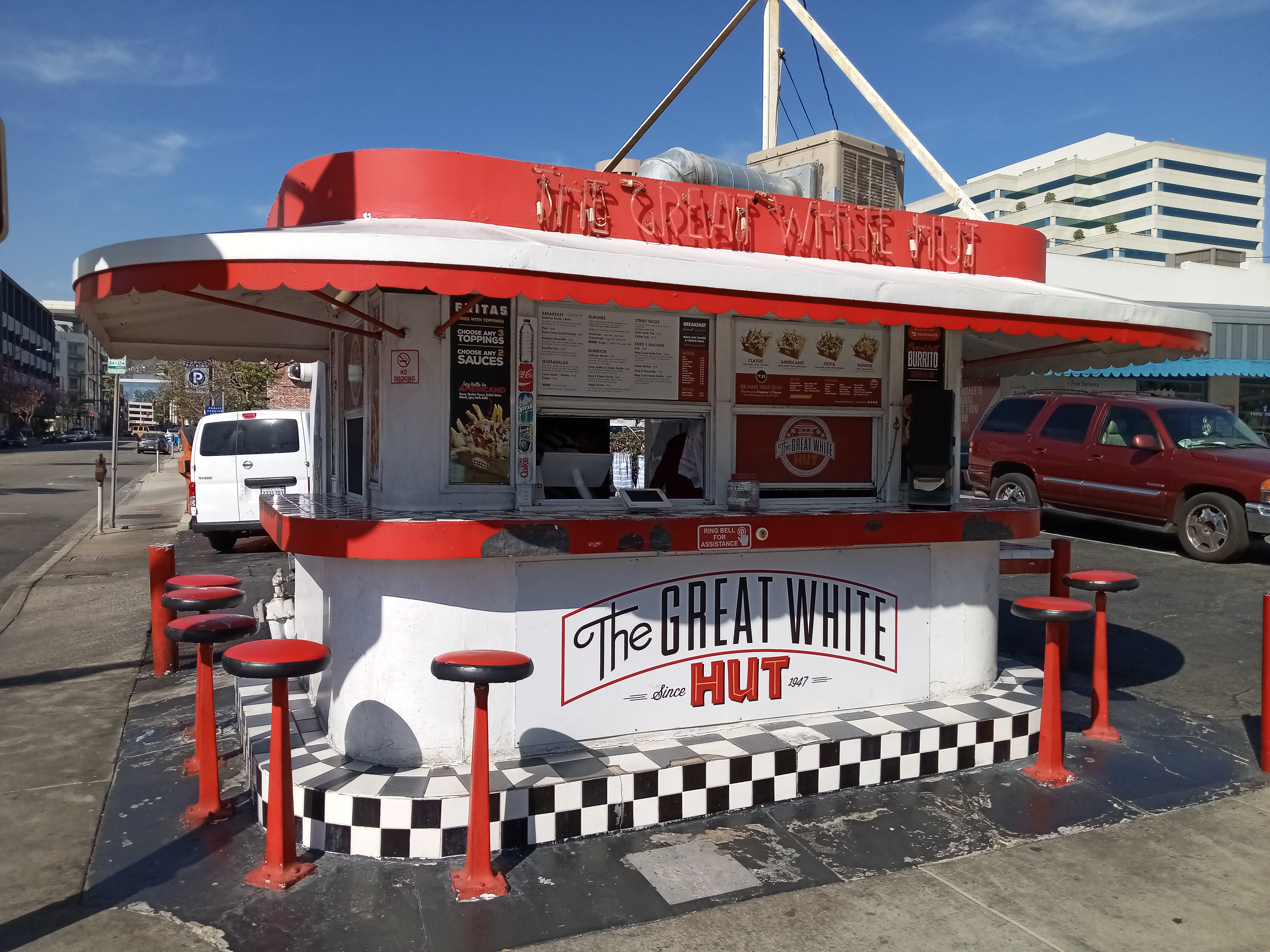 A couple other notable eateries sit within a block of Porto’s. Directly across Brand is the Carousel Restaurant, an extremely popular sit-down Middle Eastern restaurant specializing in Lebanese food. And on California Avenue just behind Porto’s is the original location of Great White Hut, a 1950s burger stand held in an eye-catching red and white stand on the corner. The burgers here are marvelous, but the loaded fries are the real highlight.