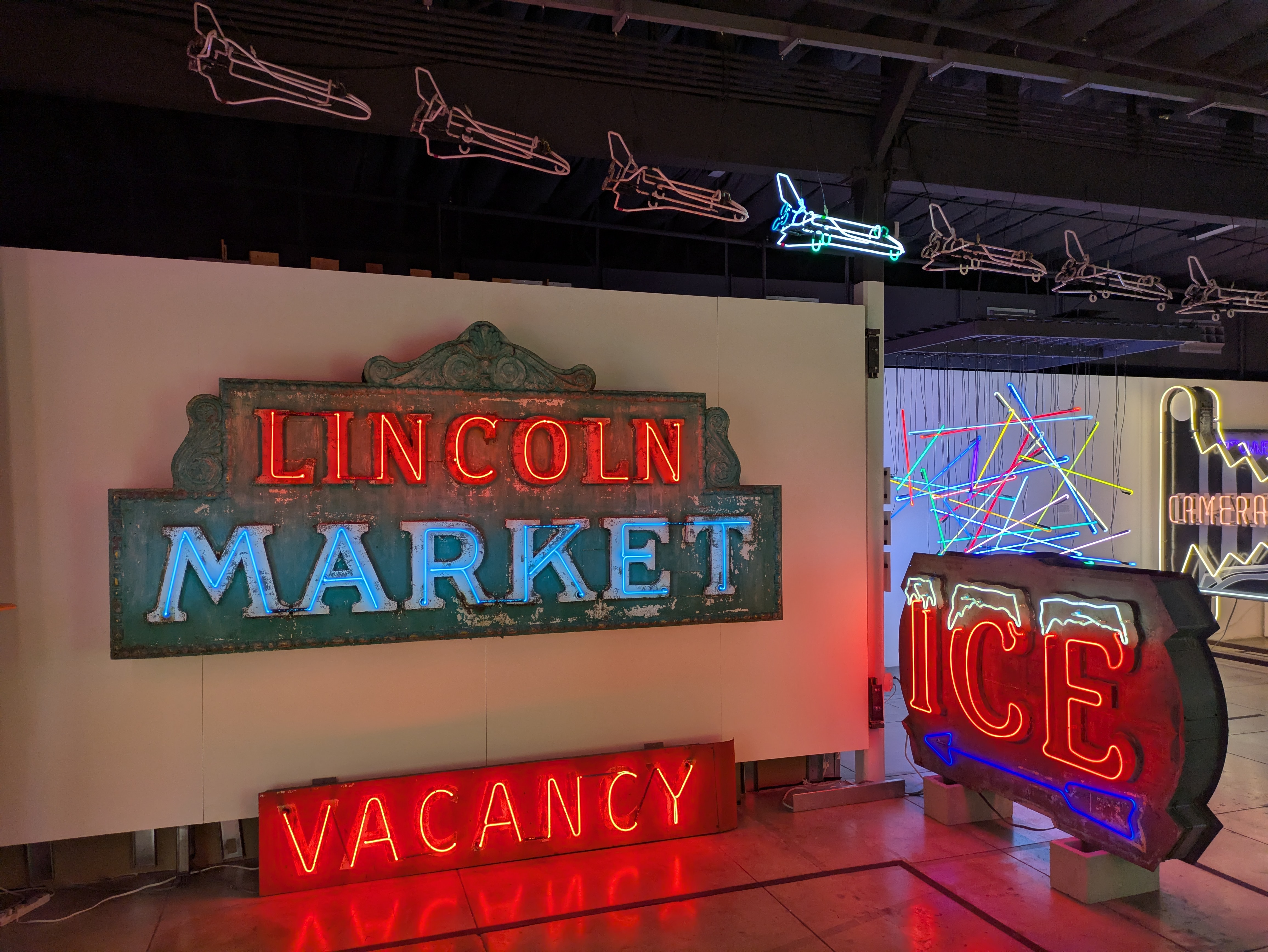 Mixed in with the historic signage are some more recent works, like my personal favorite: an animated neon space shuttle suspended from the ceiling, which you can watch “swoop” down and see its rocket blasters fire up. There are also more experimental works in a small gallery in the back: colorful koi fish swimming in front of a triptych, jellyfish suspended in the air, and plasma tubes that you can only view under supervision from the gallery attendant. The museum is small, but packs a lot in, making the price of admission (normally $10) well worth it. MONA is open Thursdays through Sundays; see the website for current hours.
