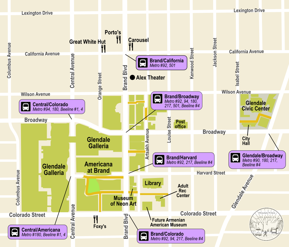 A bunch of frequent Metro bus routes pass through Downtown Glendale, most of them stopping at the intersection of Brand and Broadway. The #92 and #94 both come up Brand Blvd from Downtown L.A., with the 92 continuing up to San Fernando while the 94 splits off west to North Hollywood. The #180 cuts east-west across town, taking East Broadway and South Brand on its way between Pasadena and Hollywood. And the #501 express bus between Pasadena and North Hollywood swings down from the 134 freeway to make a stop here as well. Glendale also sits in a Metro Micro zone shared with much of Northeast L.A., including Eagle Rock and Highland Park.