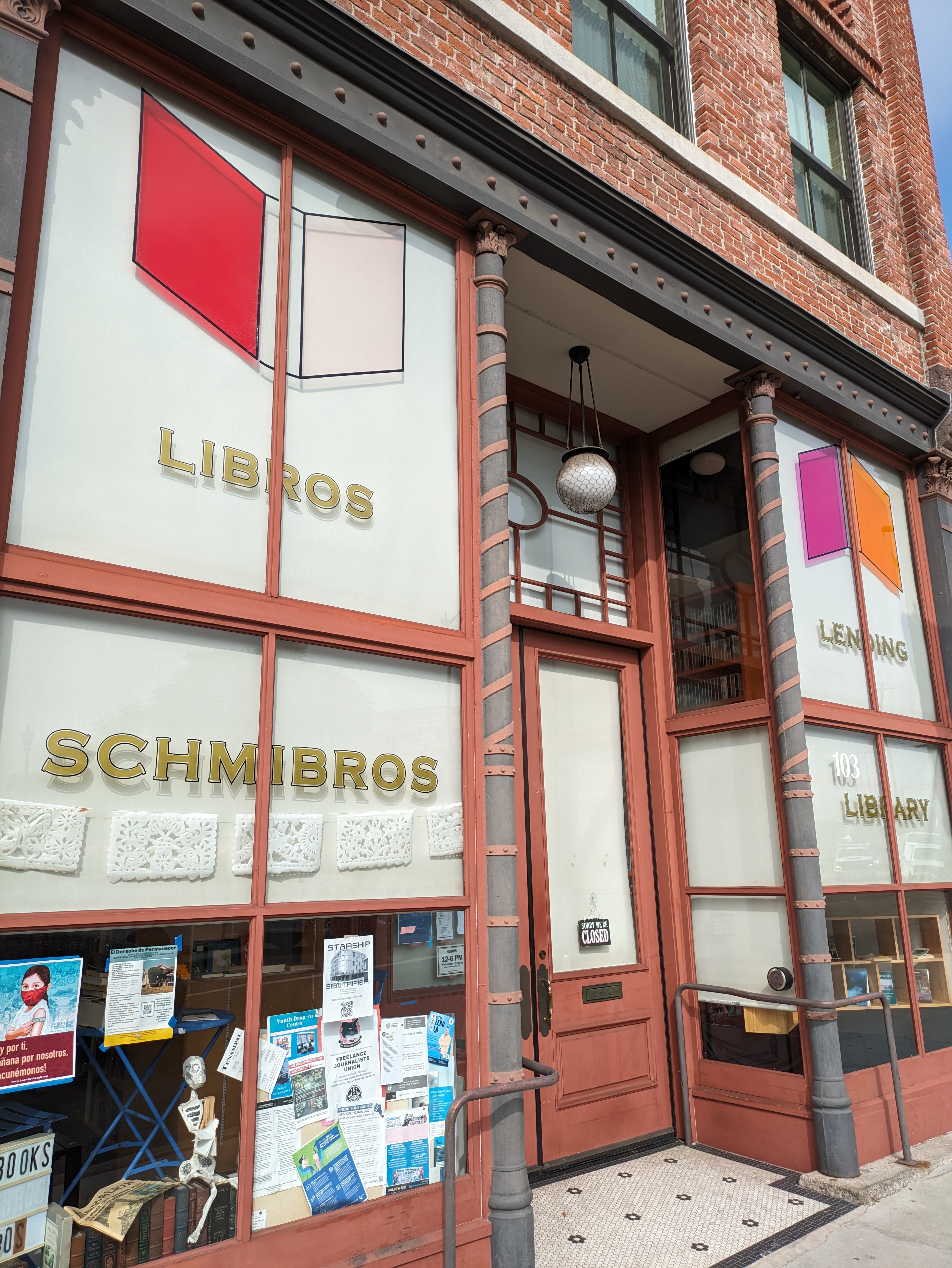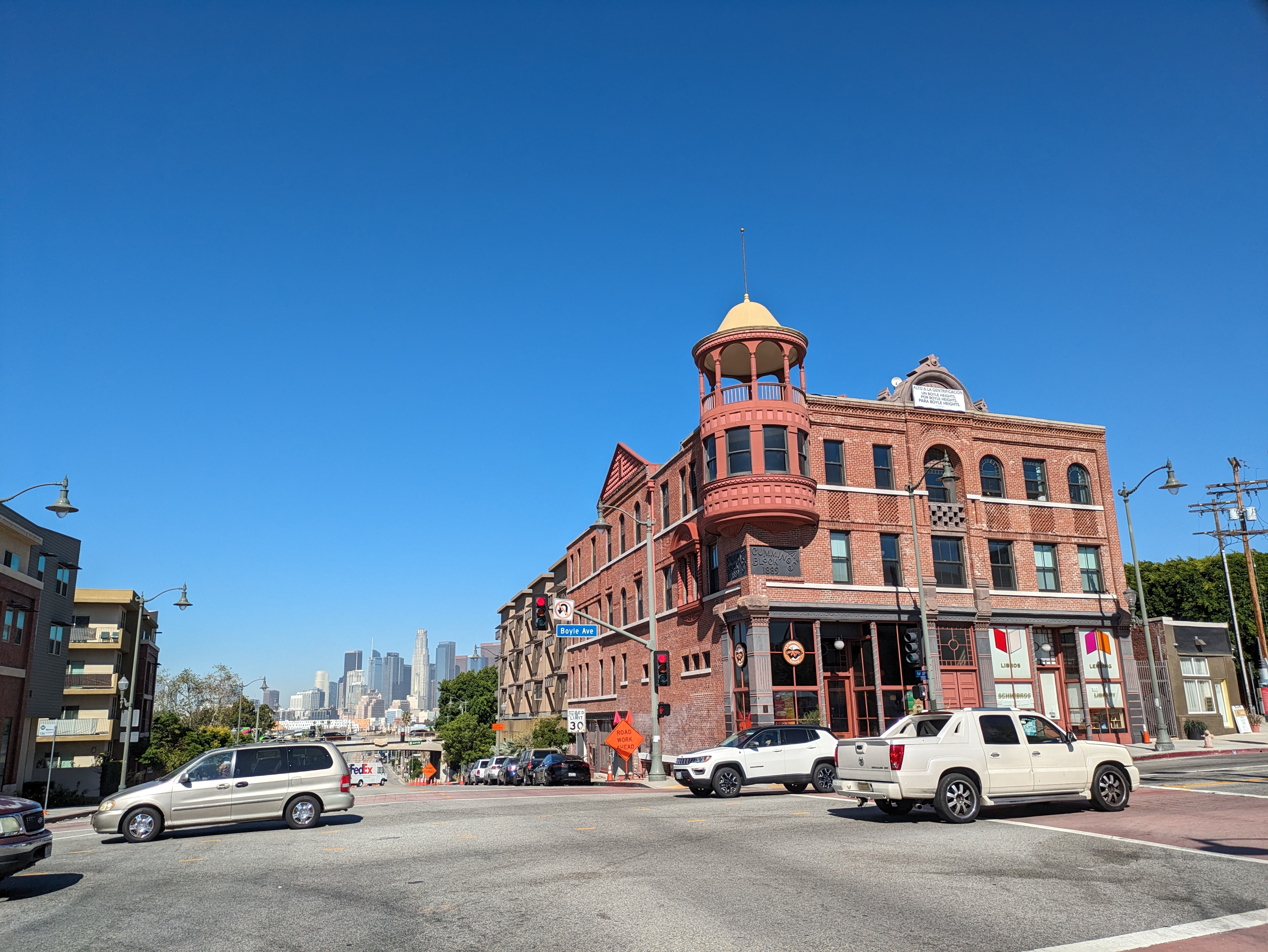 Across Boyle Avenue from Mariachi Plaza is the former Boyle Hotel, a stately red-brick building dating back to the 1880s. It has become a neighborhood landmark, with its corner turret framing what has become an iconic view down 1st Street of the downtown skyline. Today the building holds affordable housing, with two notable businesses facing Mariachi Plaza: a very pleasant location of La Monarca Bakery (101 N Boyle Ave) that makes for great people watching, and Libros Schmibros (103 N Boyle Ave; Wed-Sun 12-6pm), a non-profit lending library that provides free books and serves as a lovely community event space, with author readings, movie screenings, and a children’s storytelling hour.