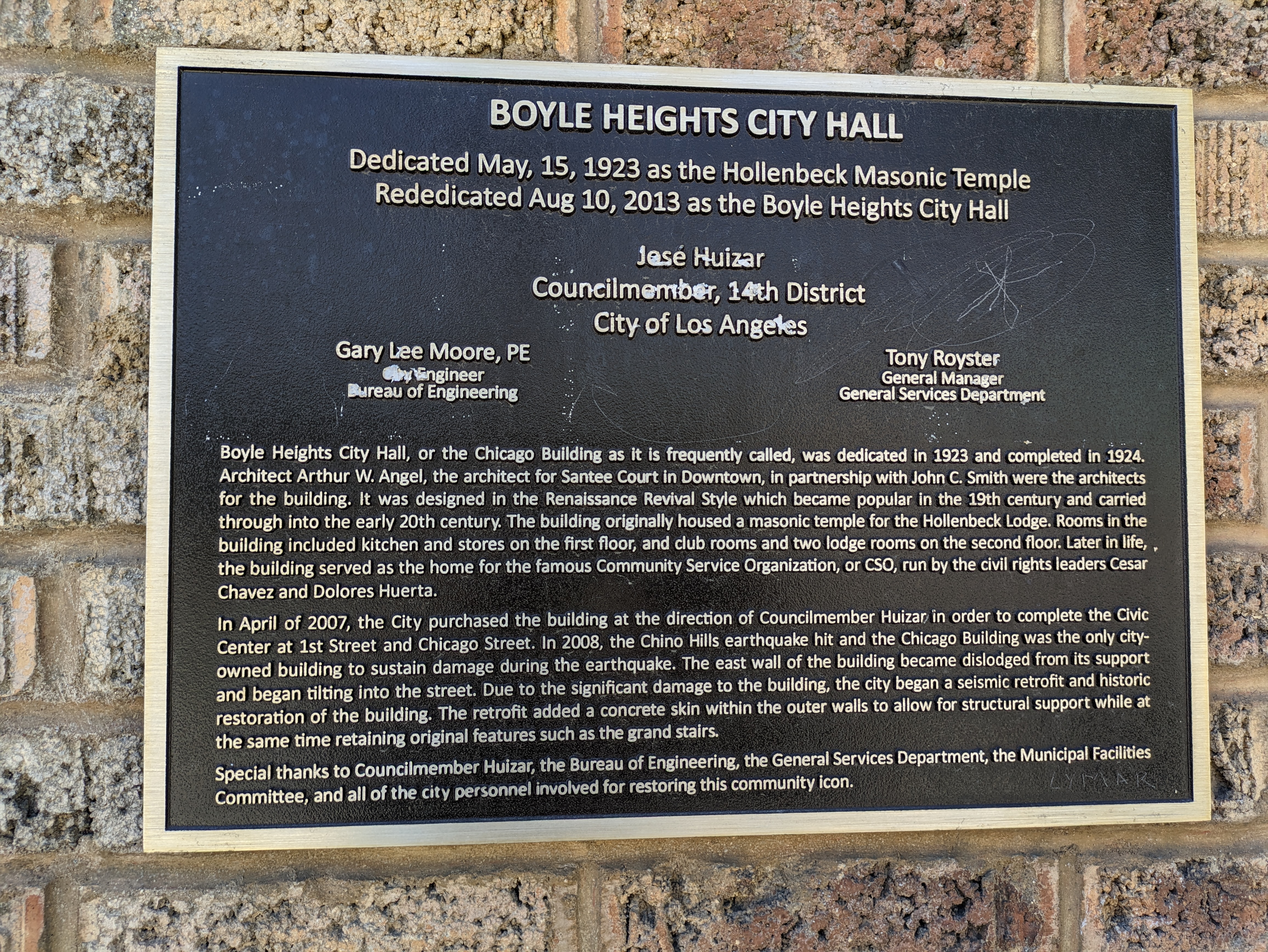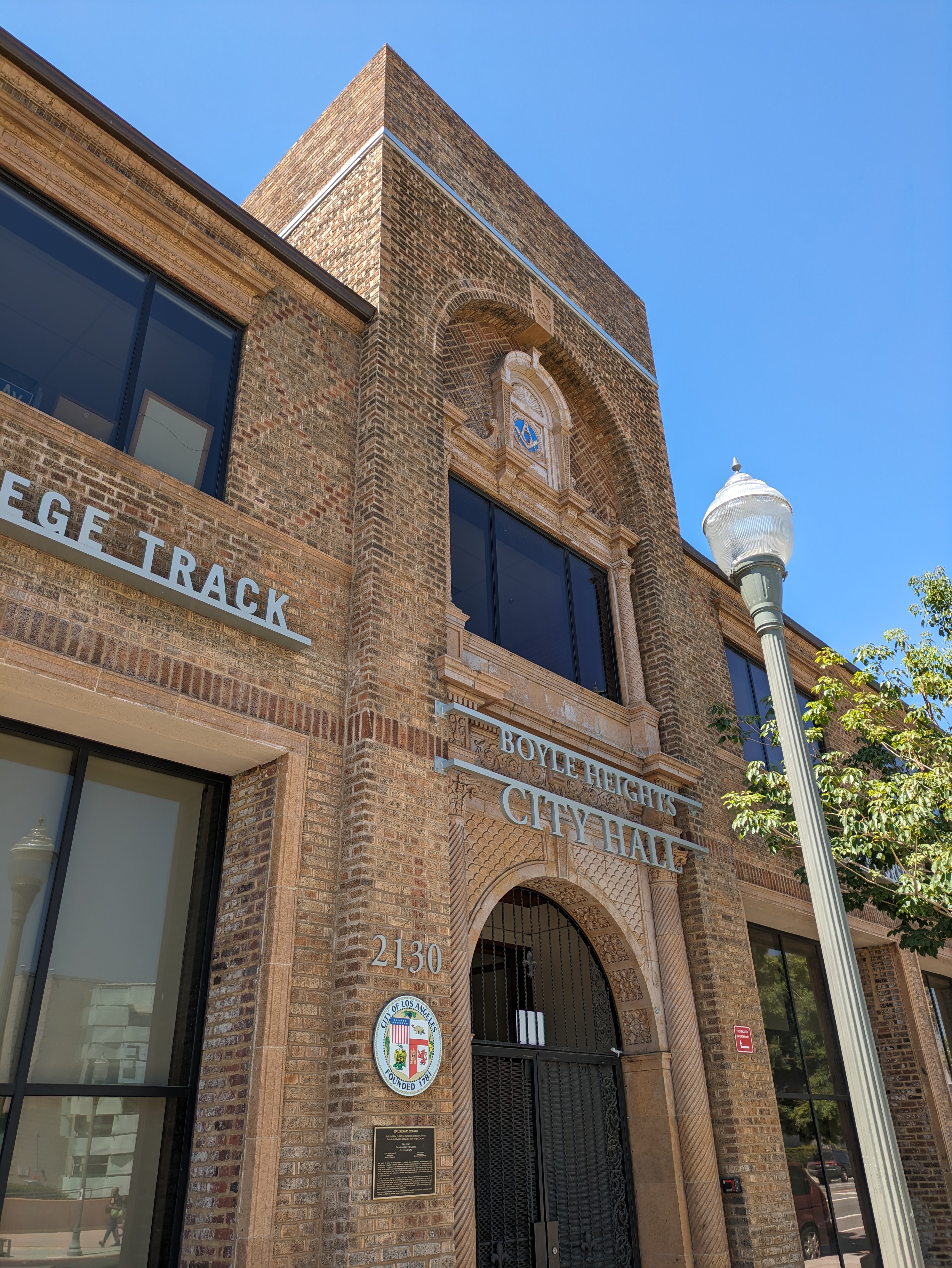 A couple blocks further east, the two-block stretch of 1st Street between Cummings Street and Chicago Street serves as Boyle Height’s civic center, with a post office, a police station, a branch of the Los Angeles Public Library, and Boyle Heights City Hall (2130 E 1st St). The city hall is a historic building, built in the 1920s as a Masonic temple and serving as a meeting hall over the decades, most notably housing the headquarters of the Community Service Organization, a Latino civil rights group that was briefly headed by Cesar Chavez before he and Dolores Huerta founded the National Farm Workers Association.