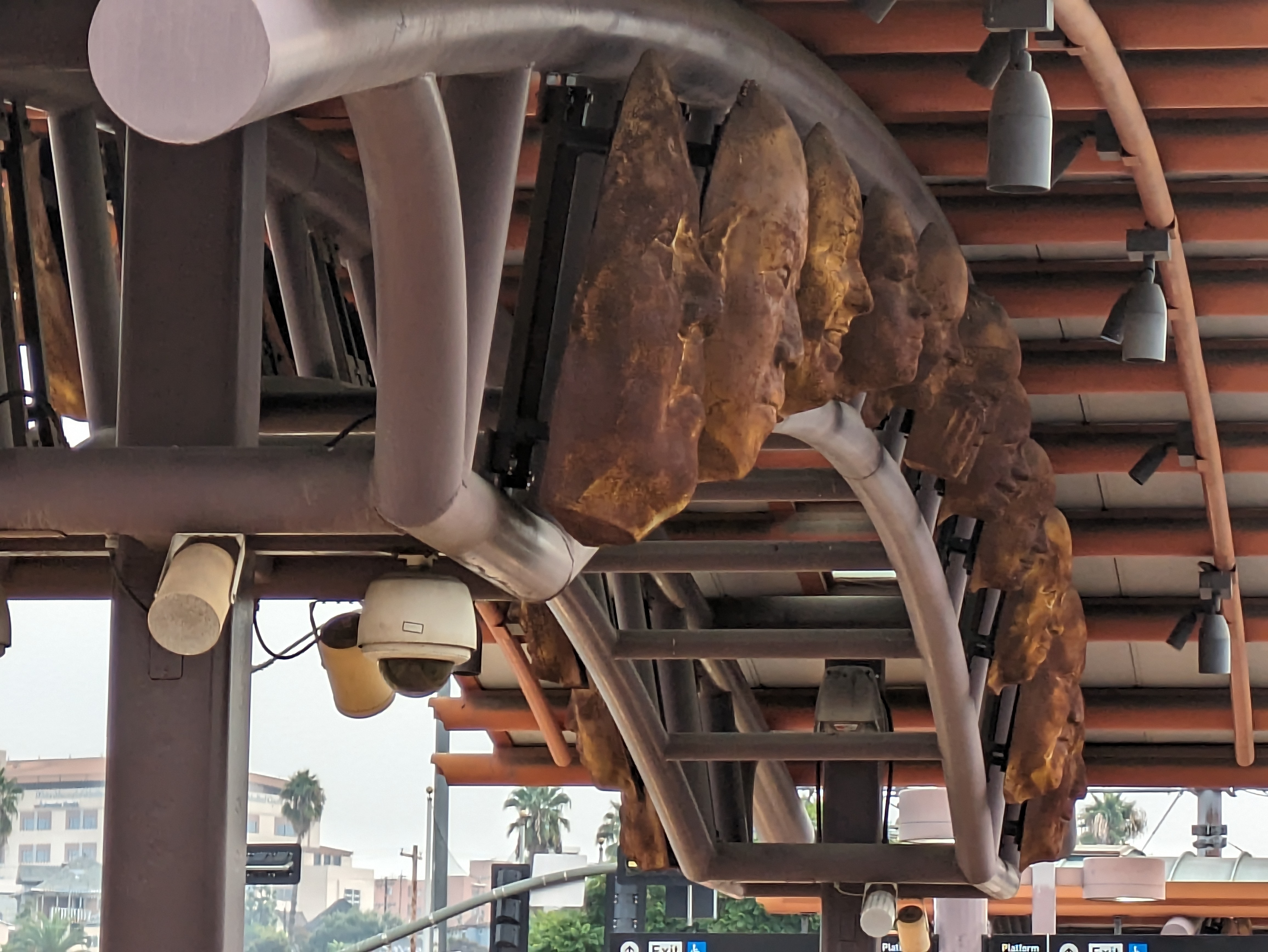 The first stop after crossing over the L.A. River, Pico/Aliso sits in the flats along the river at the foot of Boyle Heights proper. The station has a rather striking but surprisingly hidden piece of public art, tucked in the underside of the canopy over the platform. Look up, and you’ll see About Place About Face, a series of cast-iron molds of people’s faces, based on images of real people from the neighborhood. A prominent high school sits across the street from the station, while on the other side sits one of Boyle Height’s most important cultural institutions.