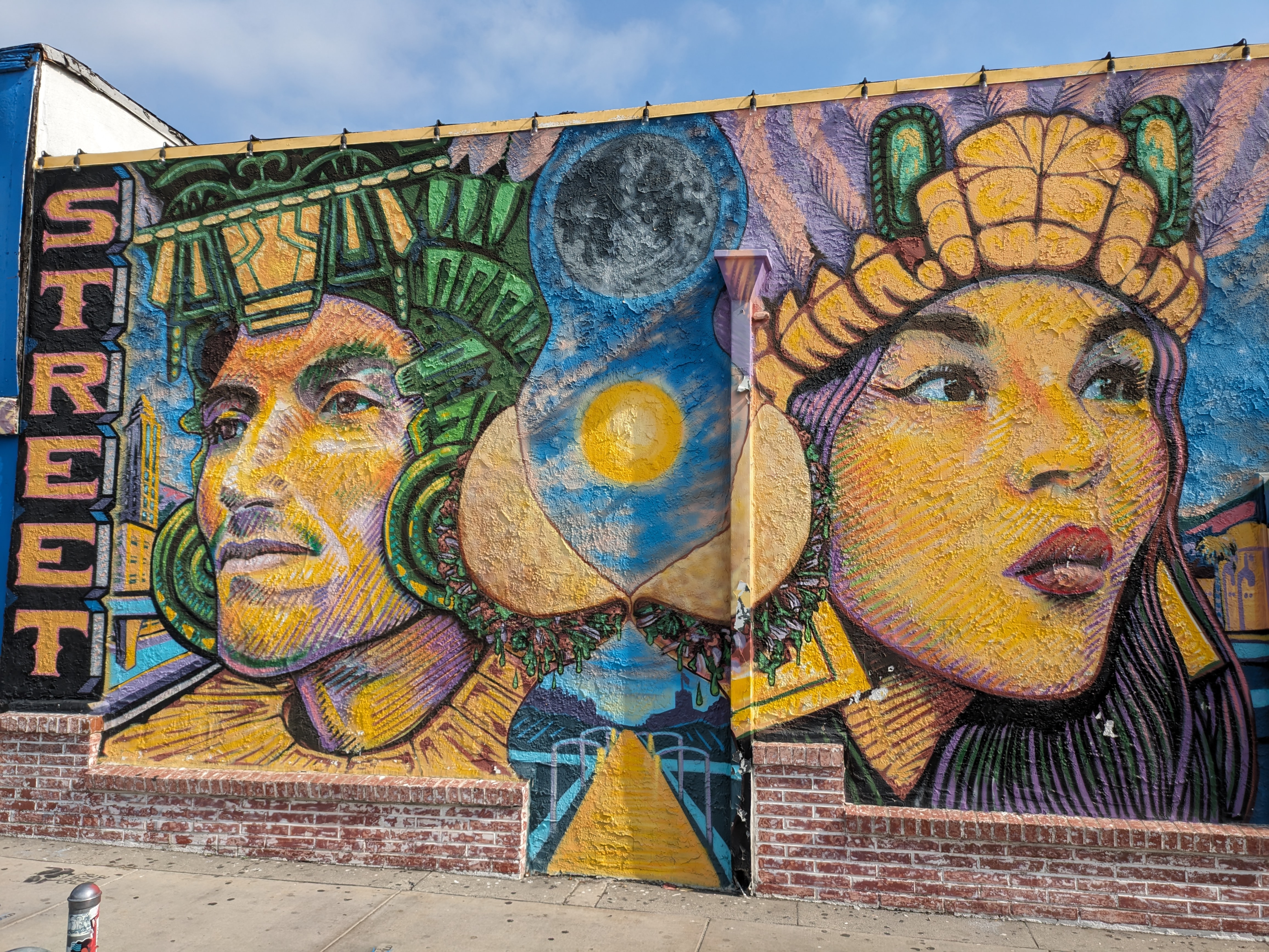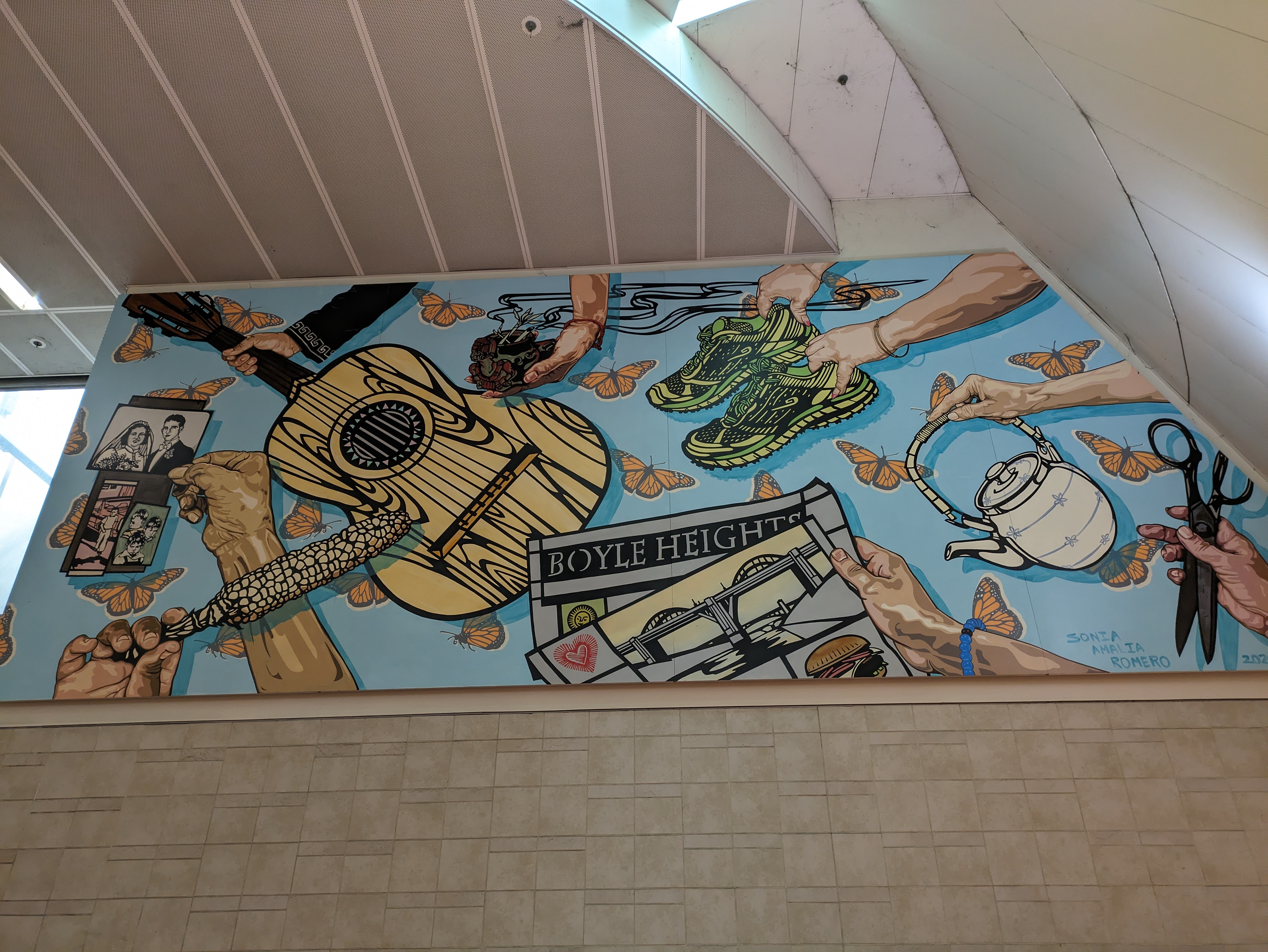 As 1st Street begins to climb uphill, the Metro line continues through a tunnel below Boyle Heights, making its first underground stop at Mariachi Plaza. The station is spacious and airy, and almost never crowded. On your way up, stop and admire the lovely mural Hecho a Mano in the concourse, which depicts objects of personal significance—a guitar, family photographs, marigolds, a protest sign—being held aloft amidst a backdrop of monarch butterflies. As you make it to the surface, the station entrance is adorned with a colorful shell-shaped awning.