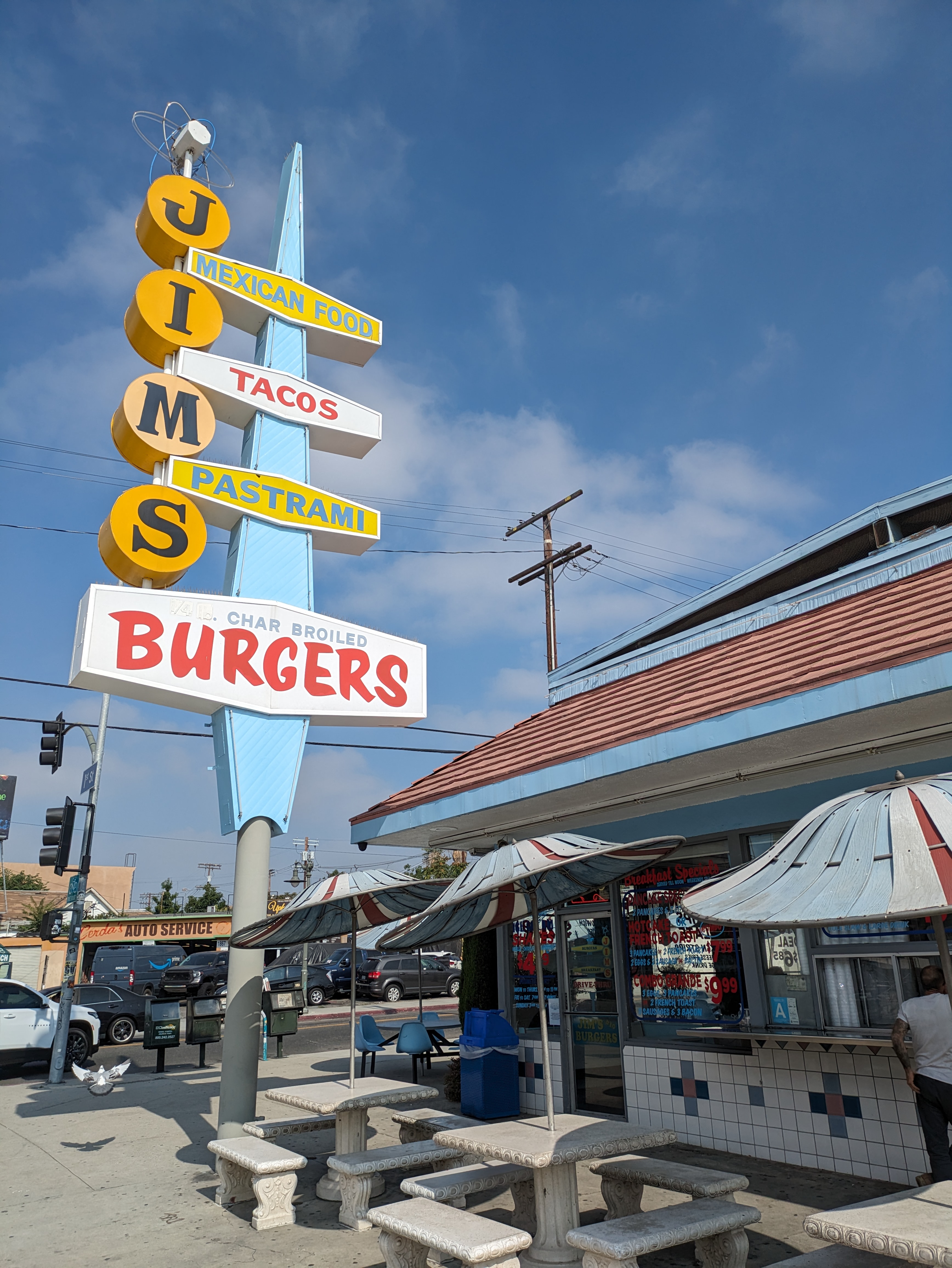 Just east of Mariachi Plaza on the north side of 1st is Espacio 1839 (1839 E 1st St; Thu-Sat 12-7pm, Sun 12-6pm), a cool gift store and community radio studio that sells lots of fun books, t-shirts, and accessories made by local artists celebrating Boyle Heights and Latinx culture. Just a block further down the street is the long-standing burger joint Jim’s Burgers (1901 E 1st St), which is instantly recognizable from its iconic neon sign.