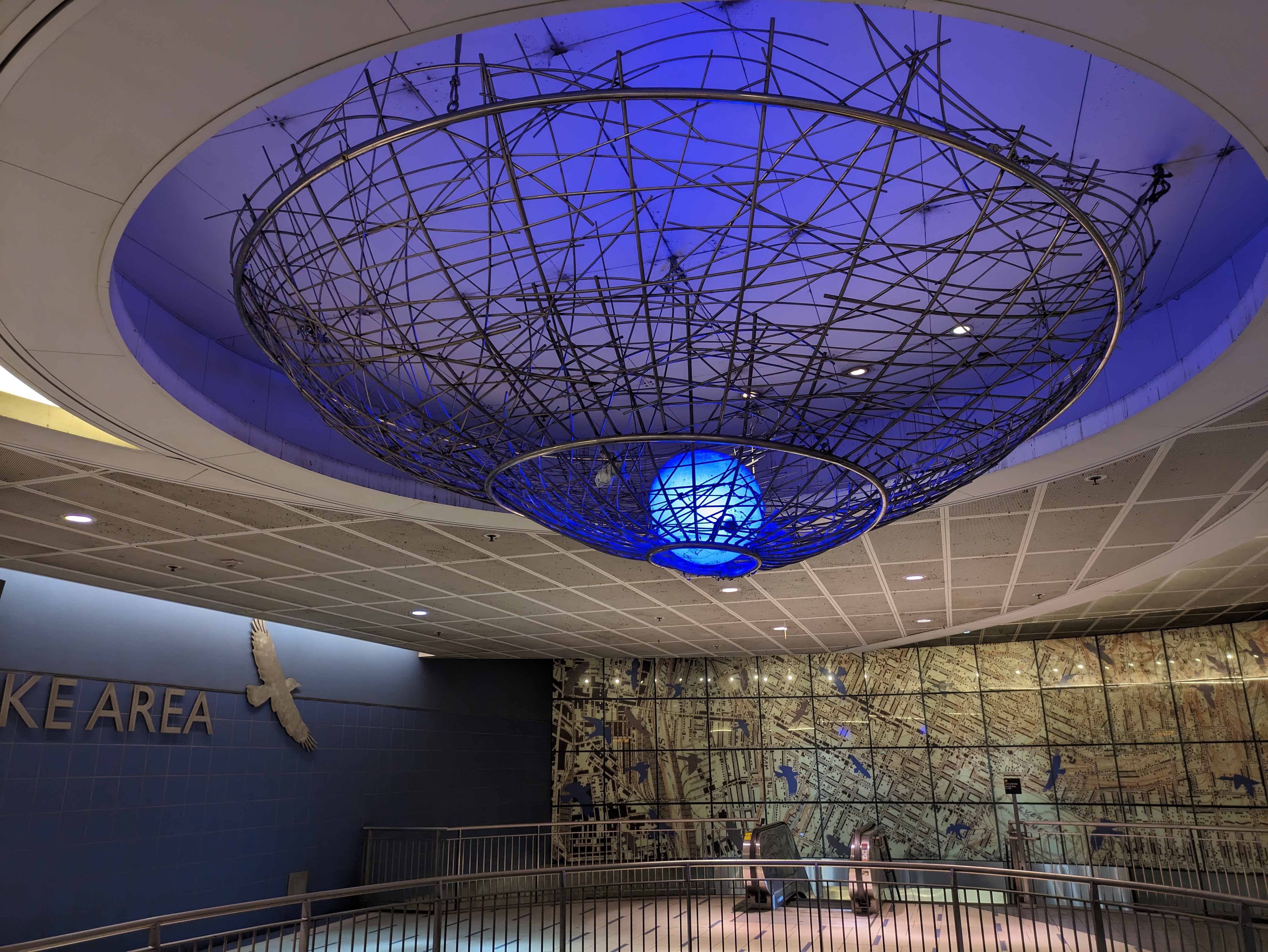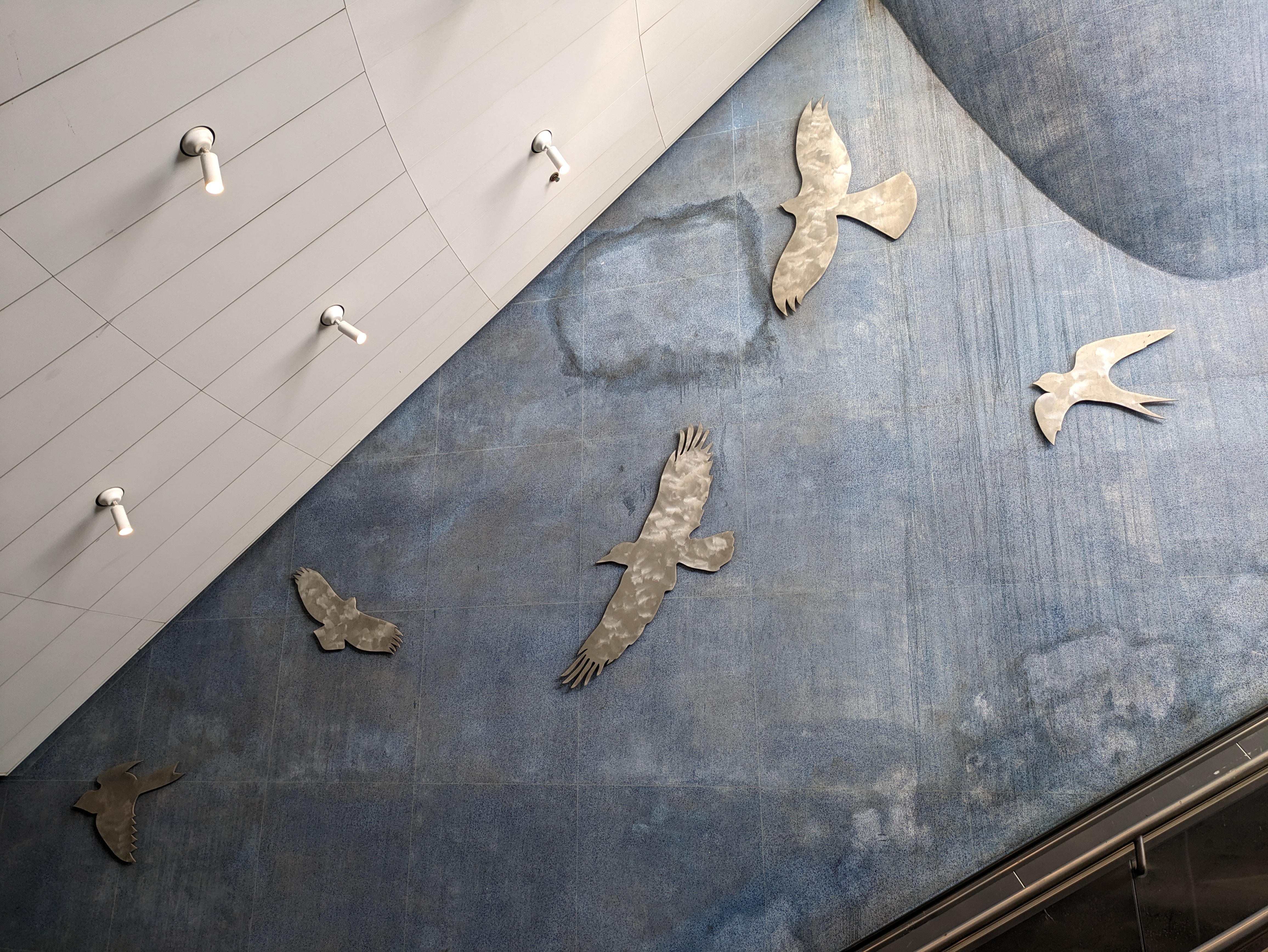 Soto station, at the intersection of 1st and Soto, is the second underground station beneath Boyle Heights. Where Mariachi Plaza is warmly lit, Soto is illuminated in a cool blue. The art installation here, Landings, is a bird-themed work that depicts silhouettes of birds throughout the station, with quotes alluding to migration and travel. The most striking aspect of the art piece is a giant, wire sculpture bird’s nest suspended above the escalators, with a glowing blue egg held in the center. Above ground, the station structure is marked by a white tower, also illuminated in blue at nighttime.