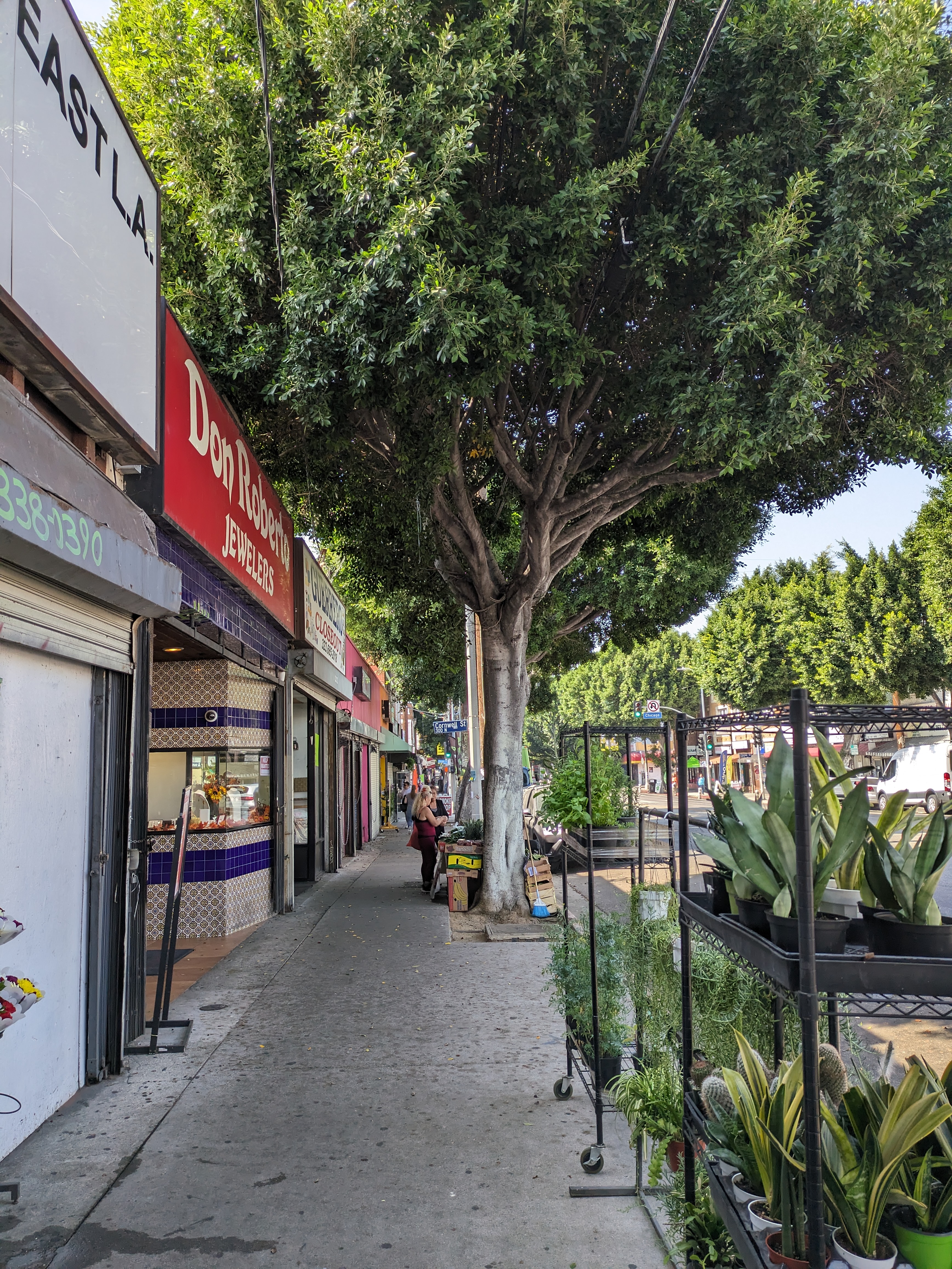 Heading a few blocks north up Soto will bring you to the bustling intersection of Soto and Cesar Chavez Avenue. 1st Street may be the neighborhood’s civic and cultural corridor, but Cesar Chavez is definitely the main commercial district of Boyle Heights, with lots of activity throughout the day. The several blocks on either side of Soto are particularly active, with lots of local businesses packed together along crowded sidewalks lined with shady ficus trees.