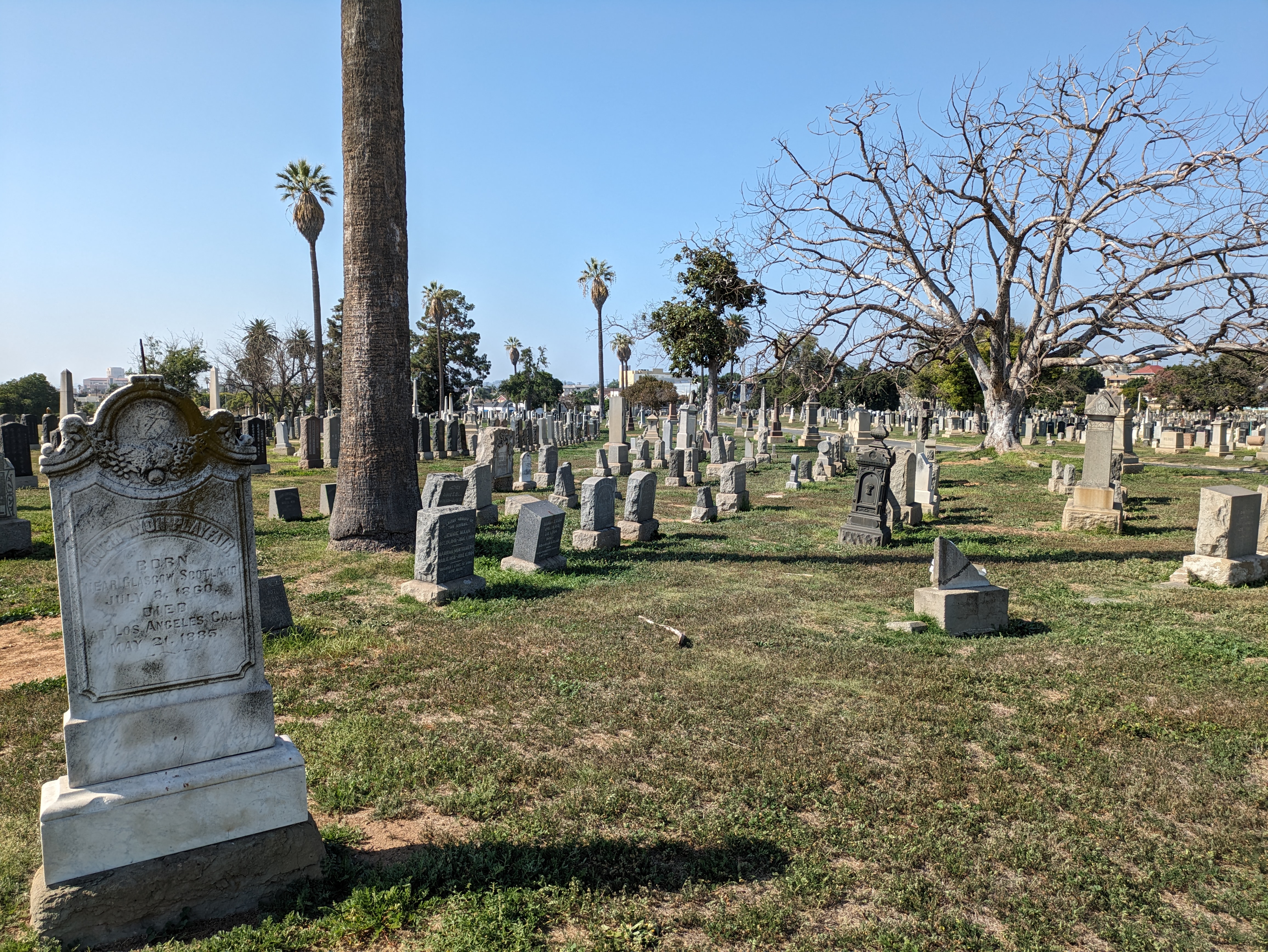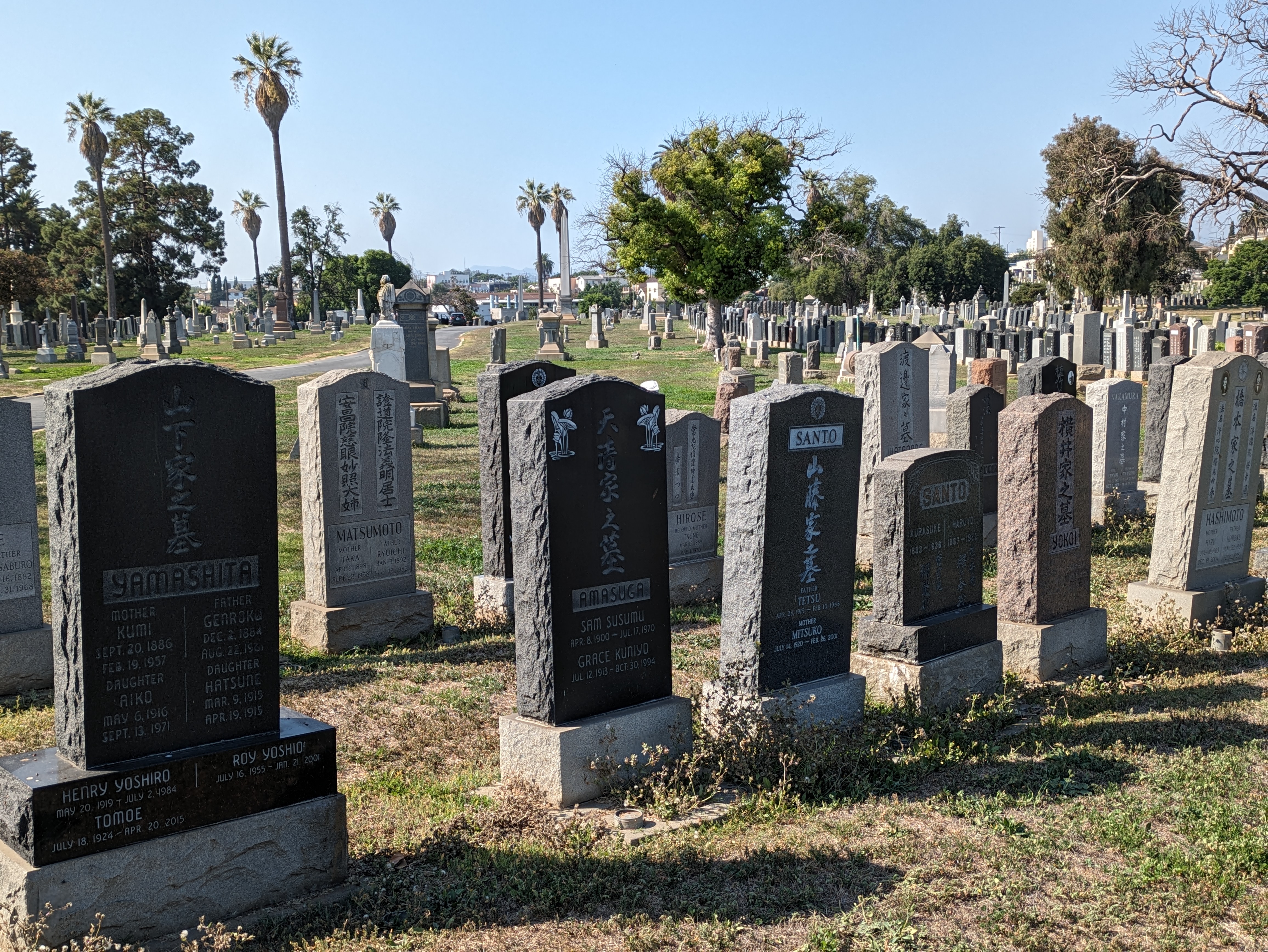 Walking another half-mile up 1st Street and turning left onto Evergreen Avenue will bring you to the entrance of Evergreen Cemetery. Dating back to 1877, it’s the oldest private cemetery in the city, as well as the oldest nondenominational one. It’s also one of the largest, with over 300,000 internments in its nearly 150-year-long history. Evergreen is notable for having never banned people based on race or ethnicity, though it did maintain segregated sections for much of its history. Indeed, one of the first sections you will encounter upon entering the cemetery is a large Japanese section, a touching reminder of Boyle Heights’ once-prominent Japanese community.
