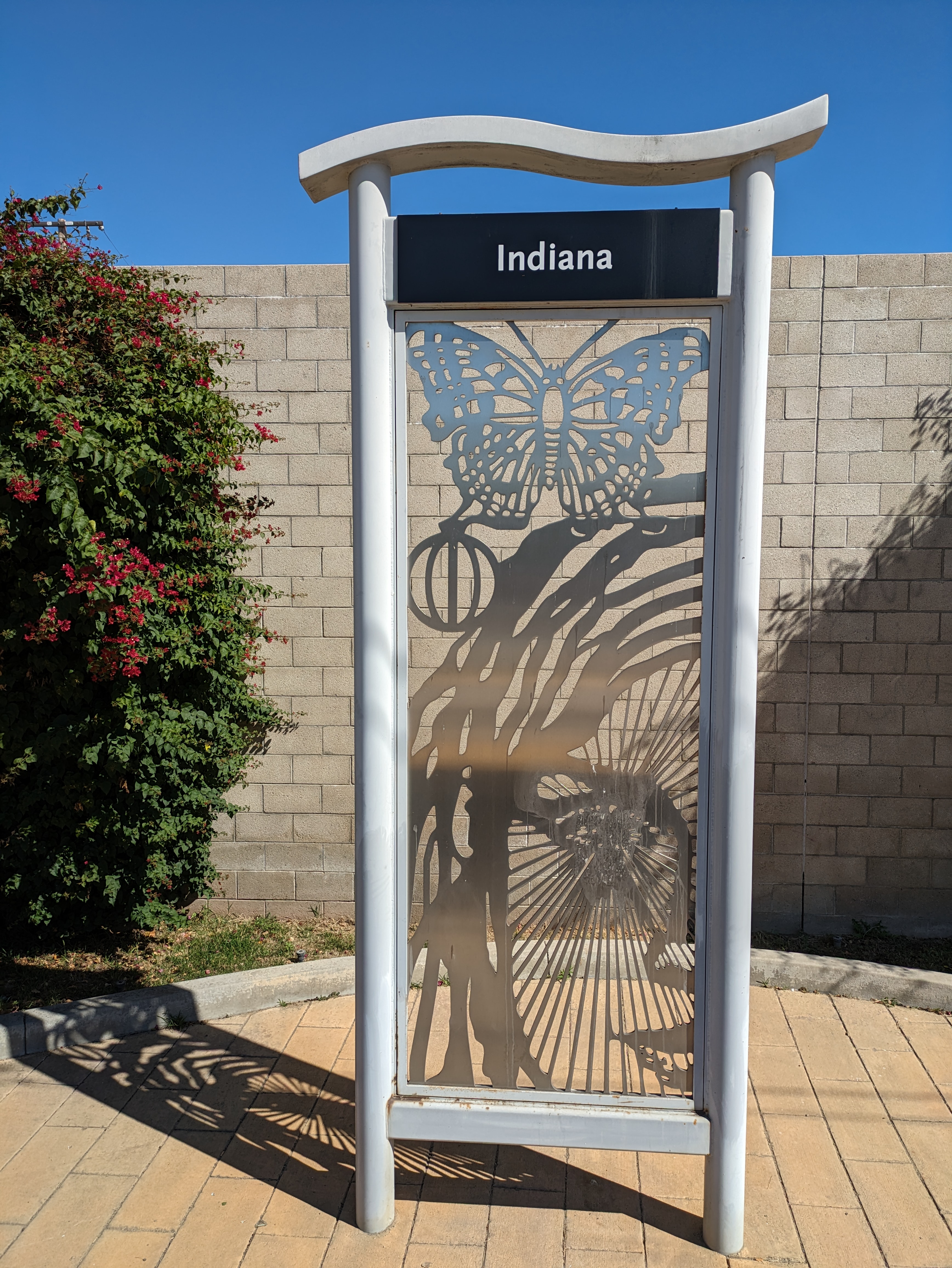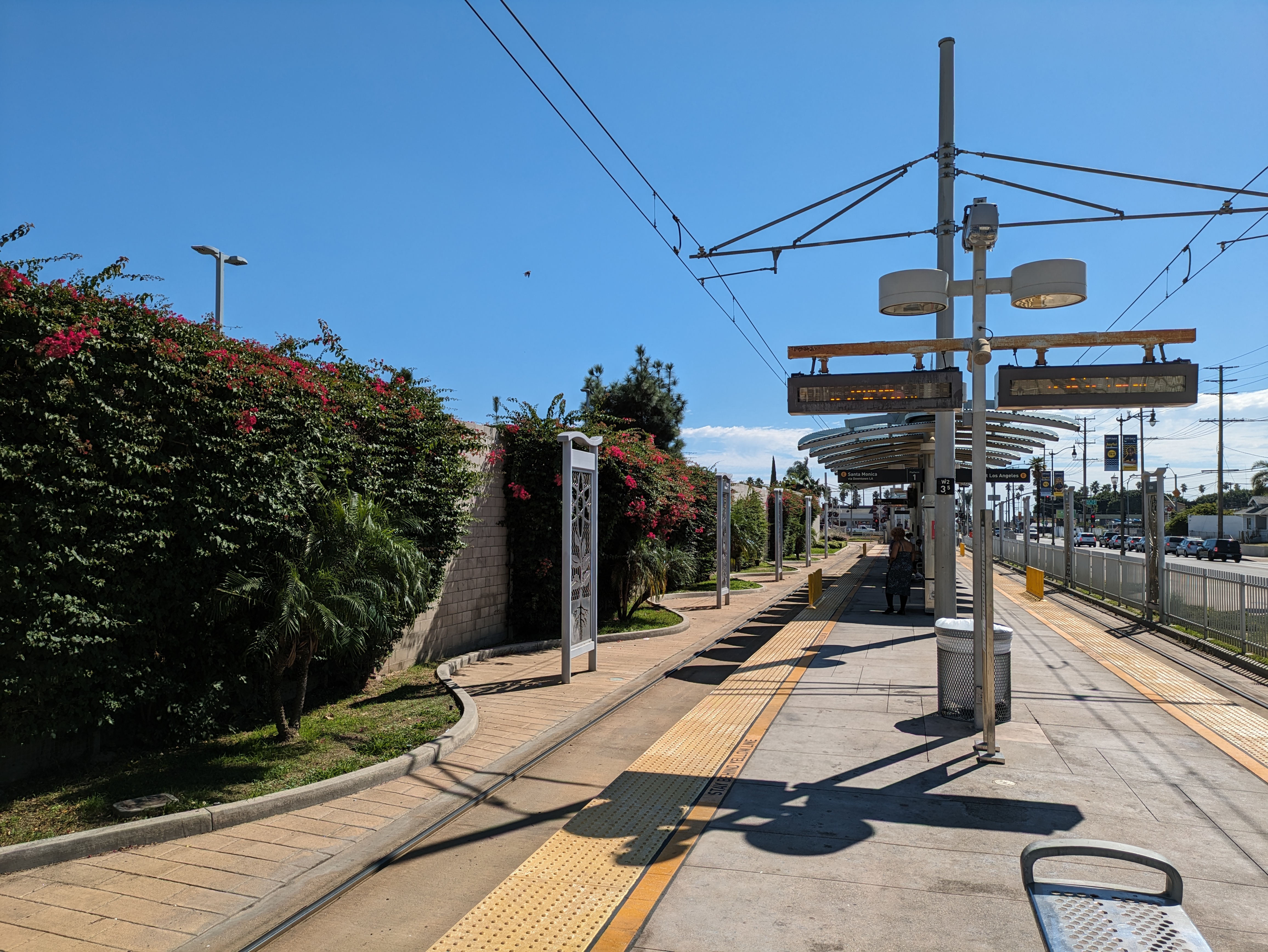 The Metro line resurfaces at 1st and Lorena, passing El Mercado before turning onto Indiana Street and making its last stop in Boyle Heights before continuing down 3rd Street into East Los Angeles. Indiana station has one artwork, Syncretic Manifestations, a set of steel-cut panels crafted in the style of papel picado. The artwork is actually best admired in the late afternoon, when the sun casts its light through the panels, projecting the shadows onto the backing wall and throwing their images into stark relief. The wall behind the station also supports a bunch of dense bougainvillea hedges, much to the delight of many nesting sparrows.