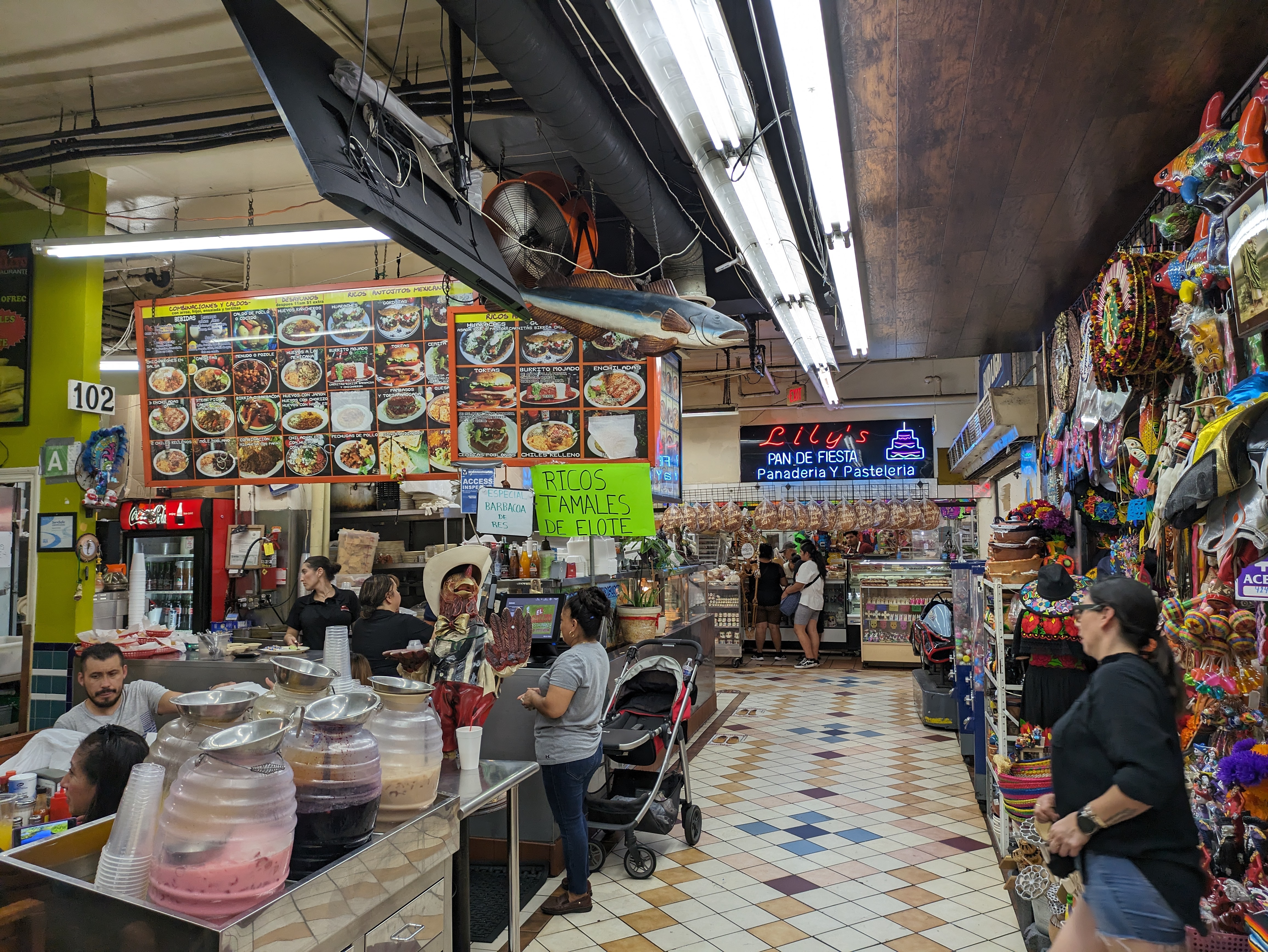 The back of the ground floor opens up onto the parking lot in the back, with a pair of entrances that are graced by elote and agua fresca stands. This is a popular spot for people to catch their breath and relax in the shade for a bit. The lot also holds a large depiction of the Virgin of Guadalupe, which becomes the focal point of a lively celebration of the feast day of Our Lady of Guadalupe every December, also known as Las Posadas. Especially on the weekends, El Mercado is a thriving, active space, with vivid colors and music and bustling crowds, truly embodying the harmony of a Mexican marketplace.