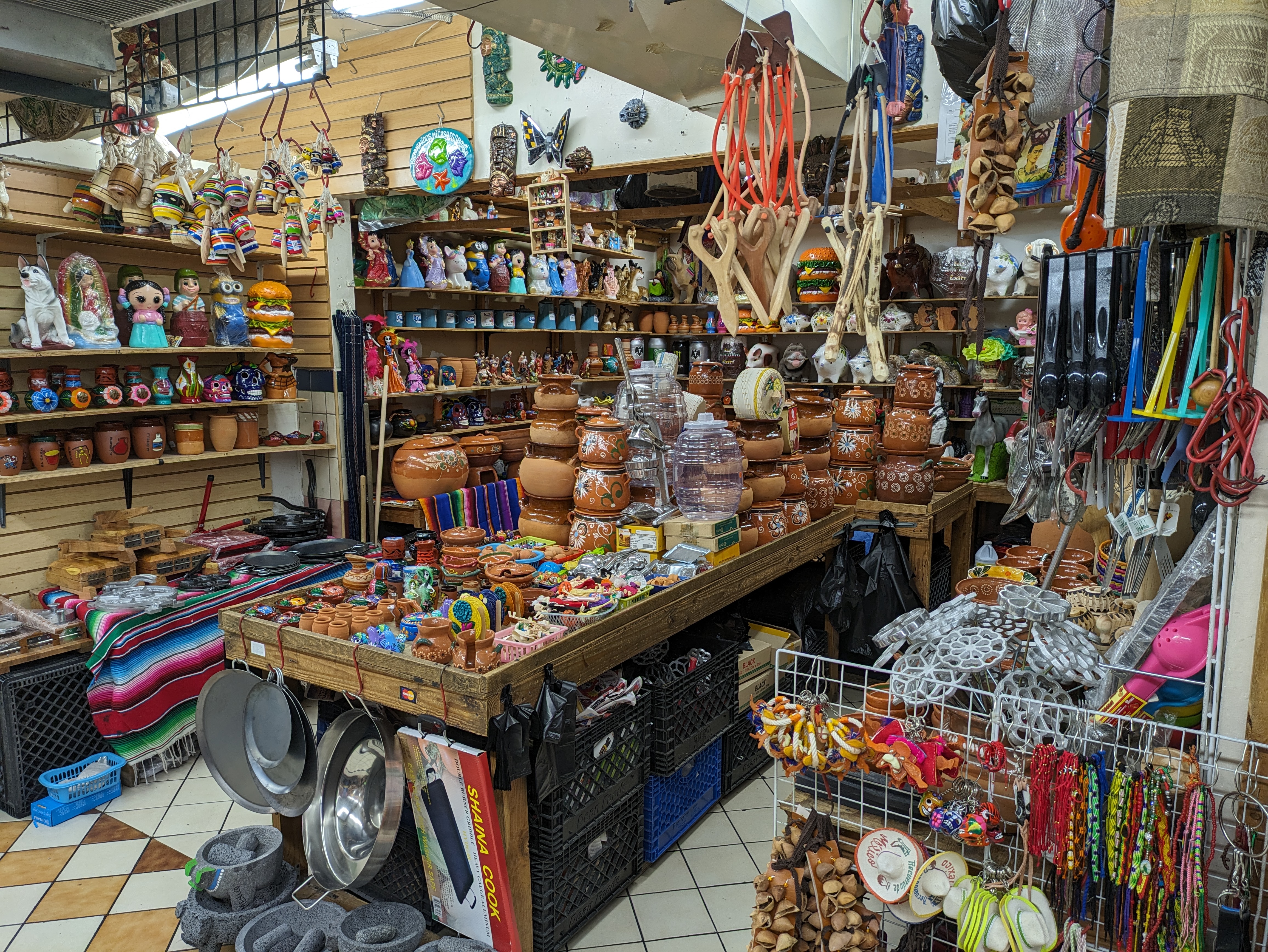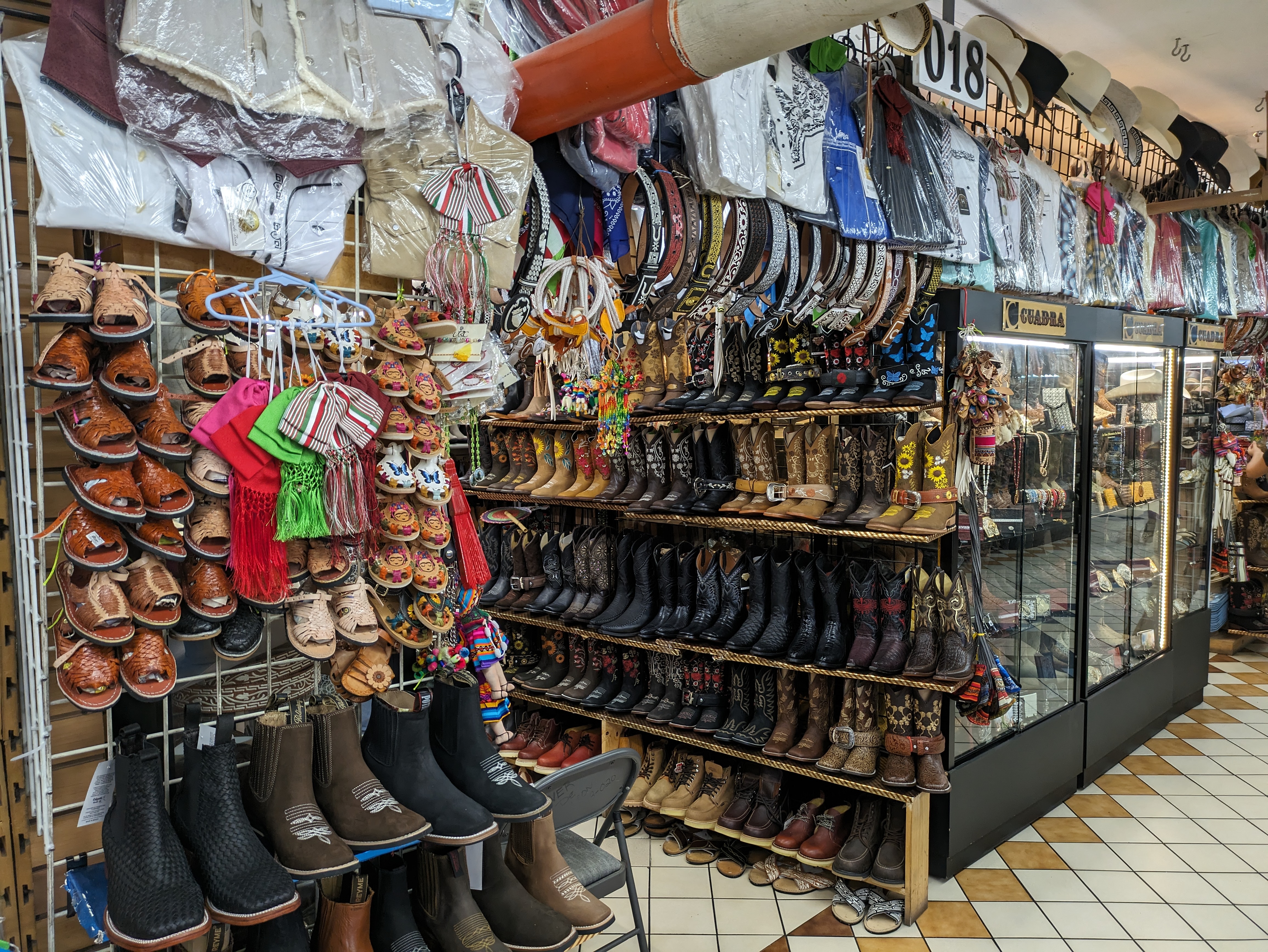 If you continue further down to the floor below, you’ll be hit by the strong smell of leather. The ground floor is home to most of the shops selling Mexican memorabilia and accessories, with rows upon rows of leather boots and belts, jewelry, charro outfits, baleros (a barrel shaped toy that resembles the kendama toy), muñecas, guitars and accordions, ceramics, religious figures, and white outfits for children completing their first communion.