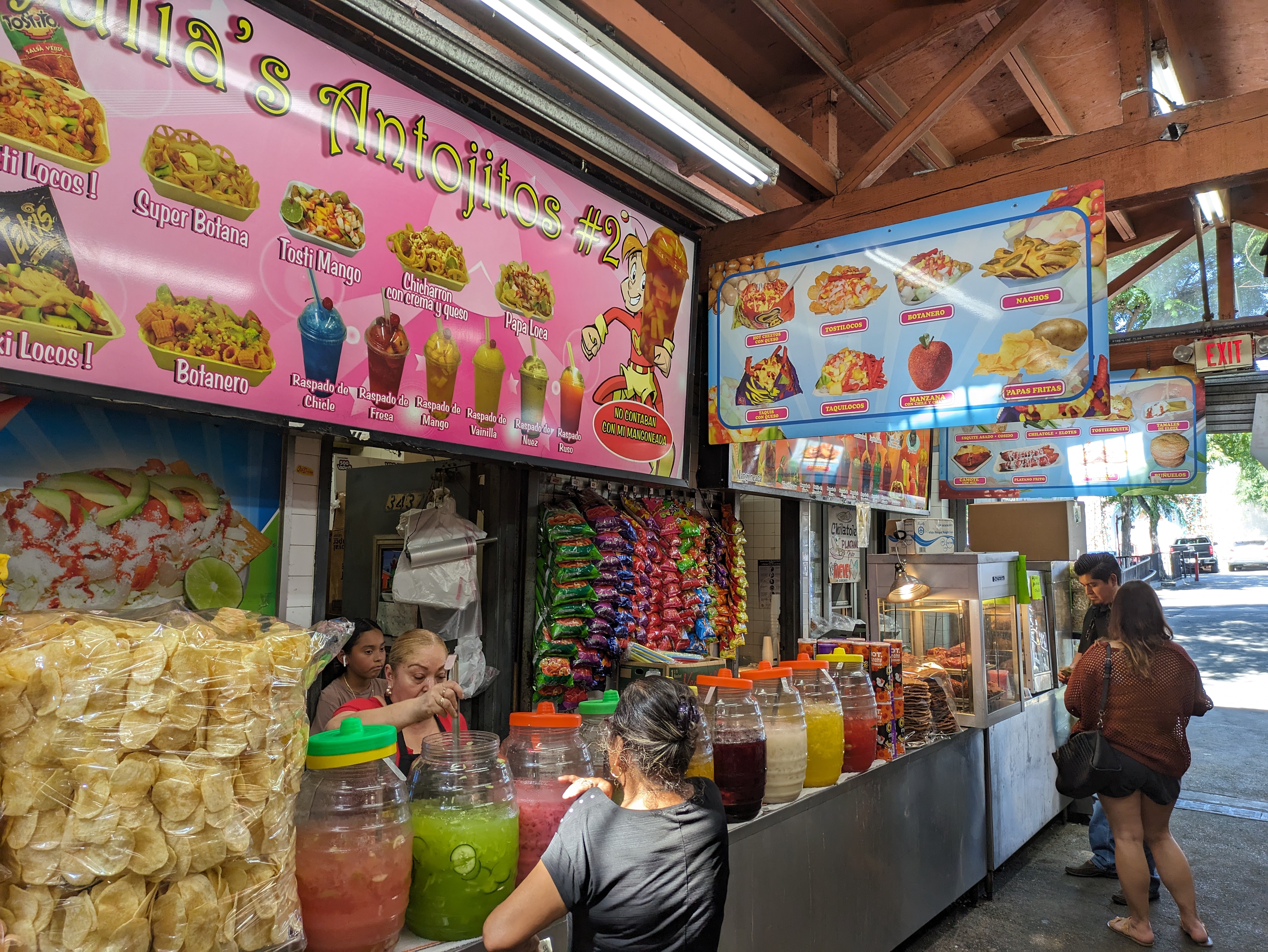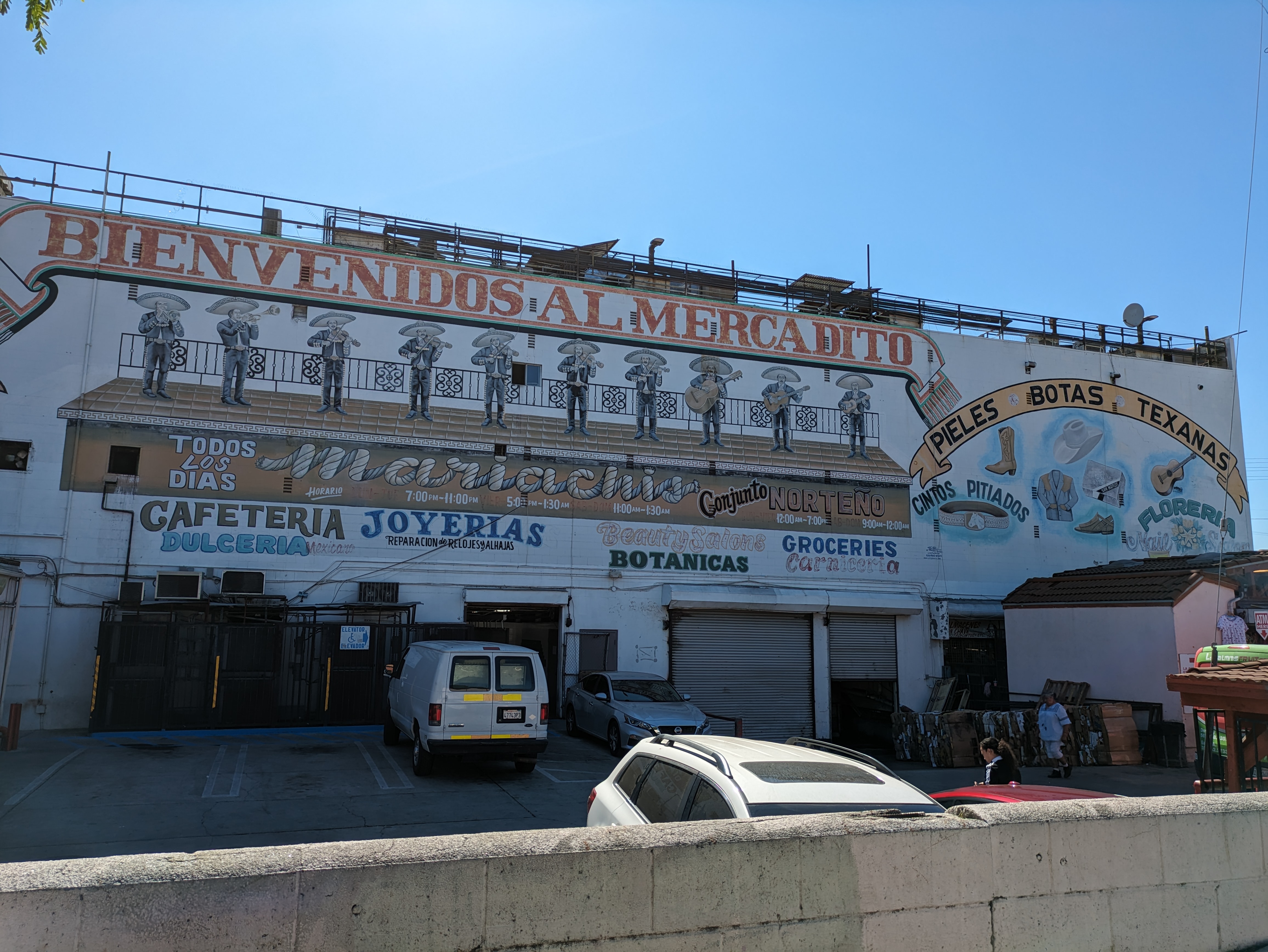 A block west down 1st is the popular El Mercado de Los Angeles (3425 E 1st St), endearingly known as El Mercadito. It closely resembles a traditional Latin American marketplace, selling goods and delicious treats as well as hosting entertainment and just generally being a cool hangout spot. The pedestrian entrance from 1st Street is a nondescript stairwell on the corner of the building; the stairs heading up used to lead to a popular mariachi restaurant on the top floor, but the restaurant has been closed since the pandemic. Take the stairs down to enter the Mercado.