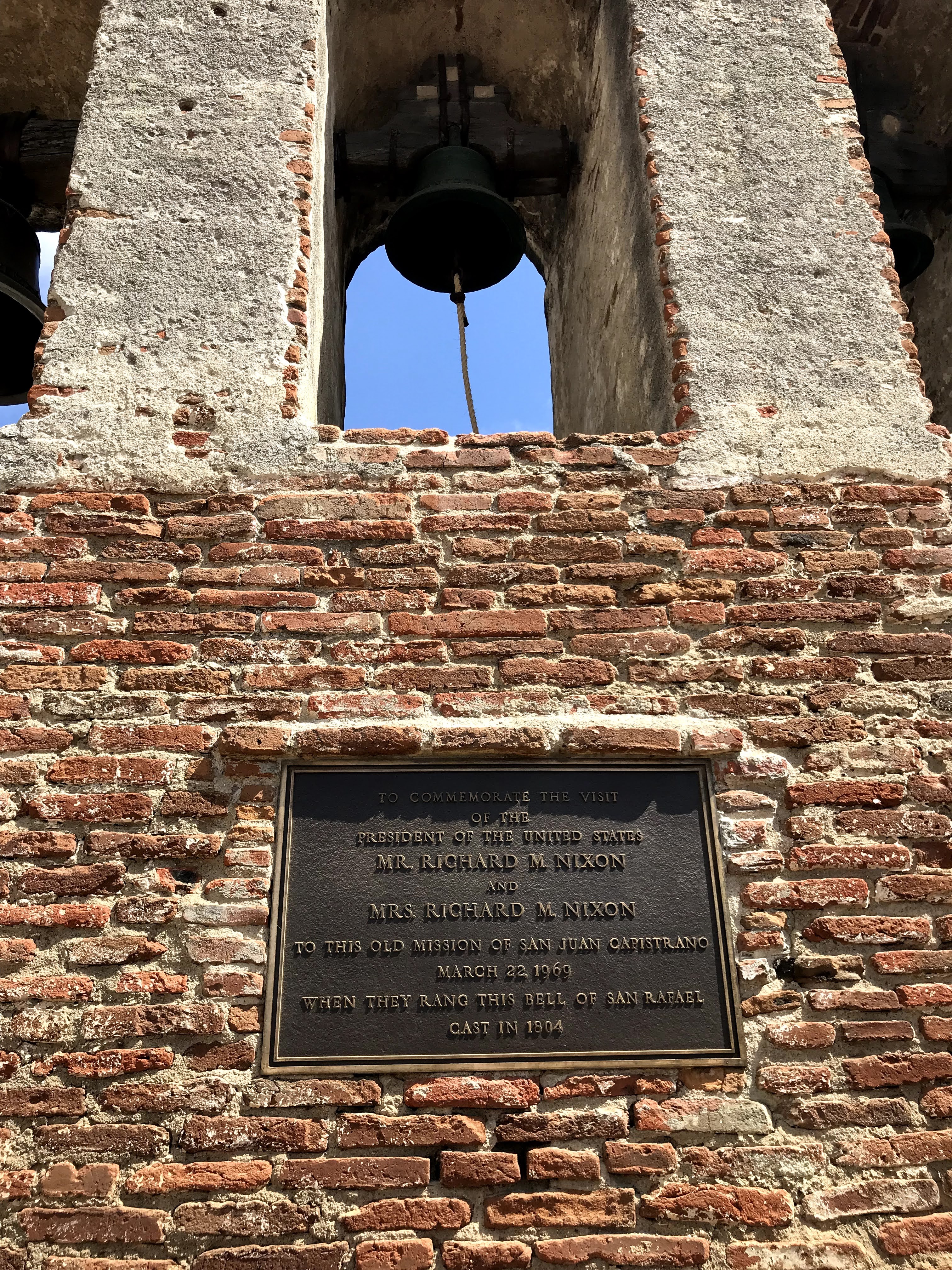 Next to the ruins of the church is an ironic detail. Adjacent to a statue of Junipero Serra and below a set of mission bells is a plaque embedded in the wall commemorating the 1969 visit of then-President Richard Nixon and his wife. Nixon was born in Orange County, and after resigning in the wake of Watergate, he would settle just down the road in San Clemente. In spite of his disgraced departure from the presidency, the plaque remains to this day, a testament to how popular Nixon remained in Orange County.
