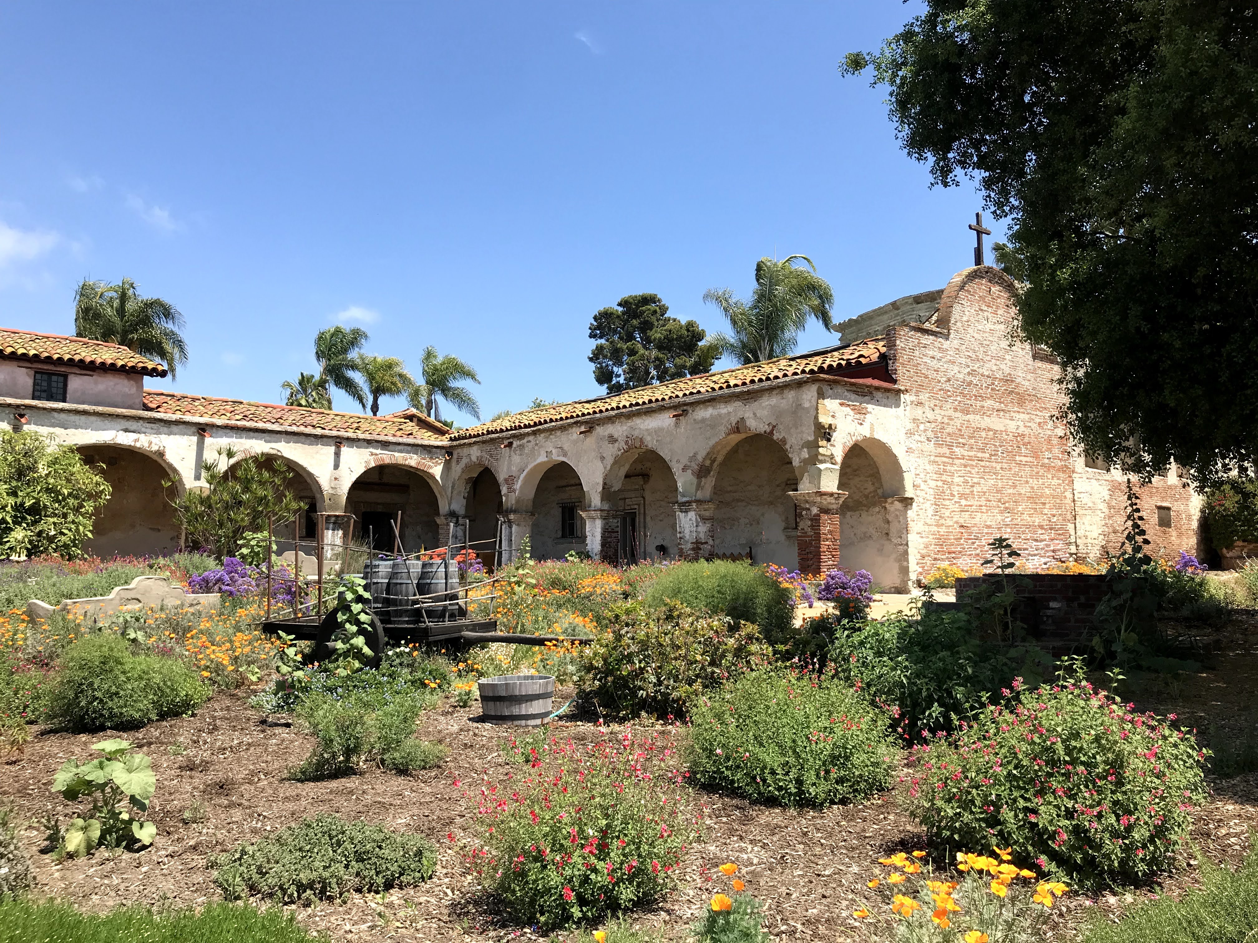 The main part of the mission surrounds a large, grassy courtyard, with another koi-filled fountain in the middle. On the side next to the cemetery is the Serra Chapel, still a functioning church. It’s a surprising feature in the middle of this popular tourist attraction: a quiet sanctuary of dim candle light, where you can sit in one of the pews, surrounded by immaculate paintings and statuary in reverent silence. Just behind the Chapel is a cemetery and a tranquil little brick courtyard with a burbling fountain behind the mission bells. The other rooms of the mission complex all hold exhibits explaining life in the mission. One display shows the typical schedule of a missionary, which makes you realize how harshly regimented their days were. A particularly interesting historical exhibit sits in the very back corner, where you’ll find the ruins of the outdoor kitchen, wine vats, and industrial areas of the mission.