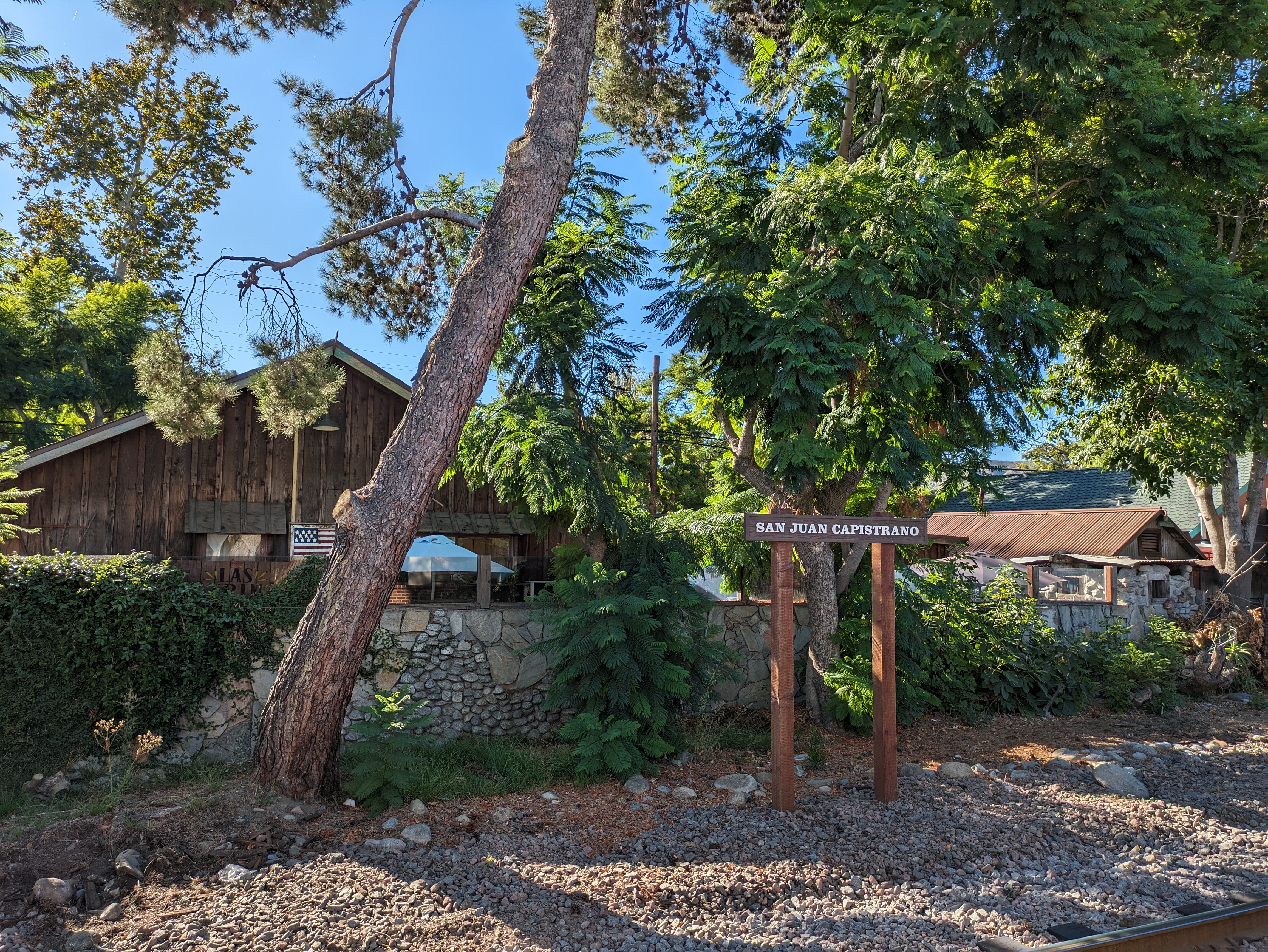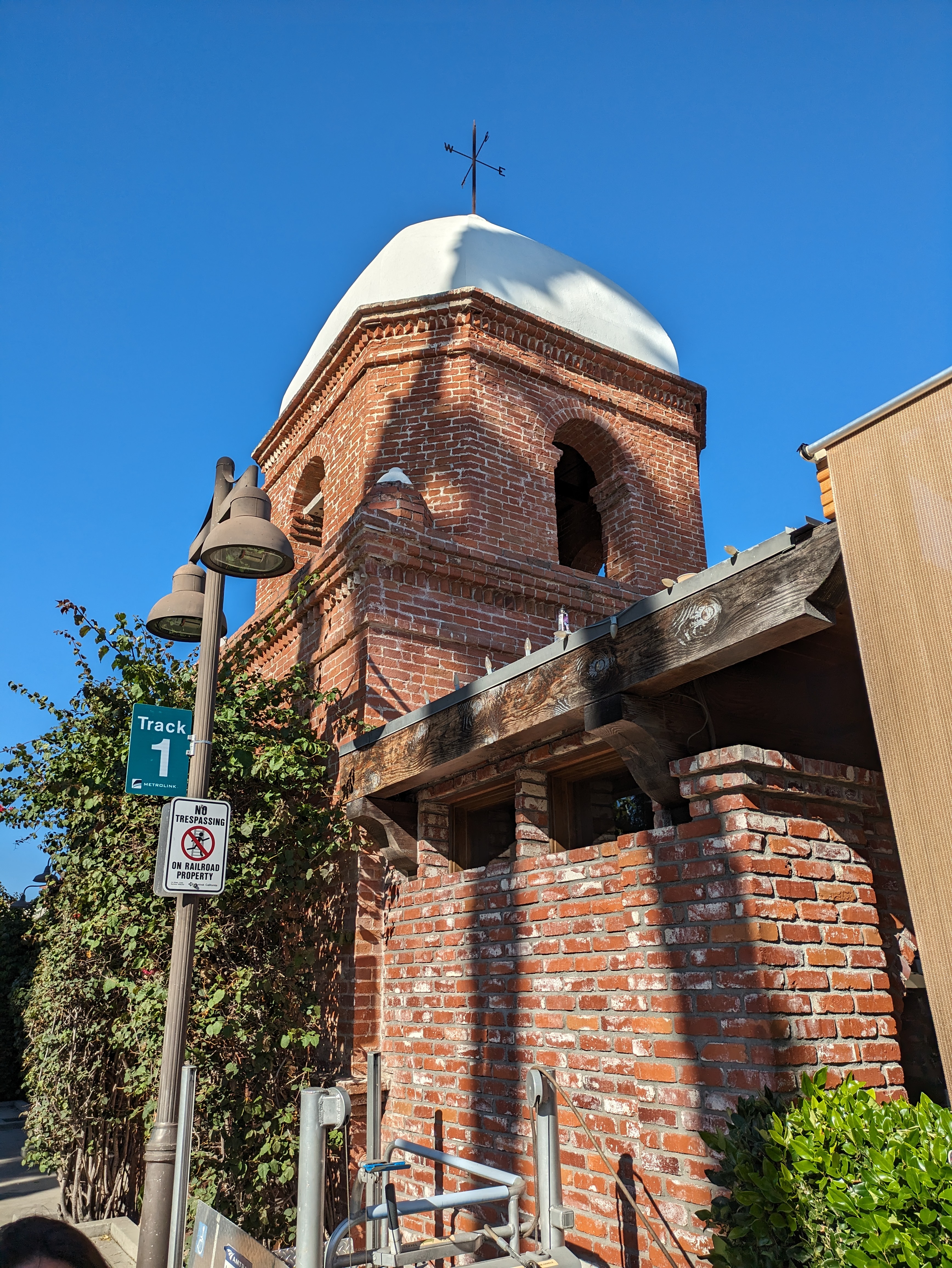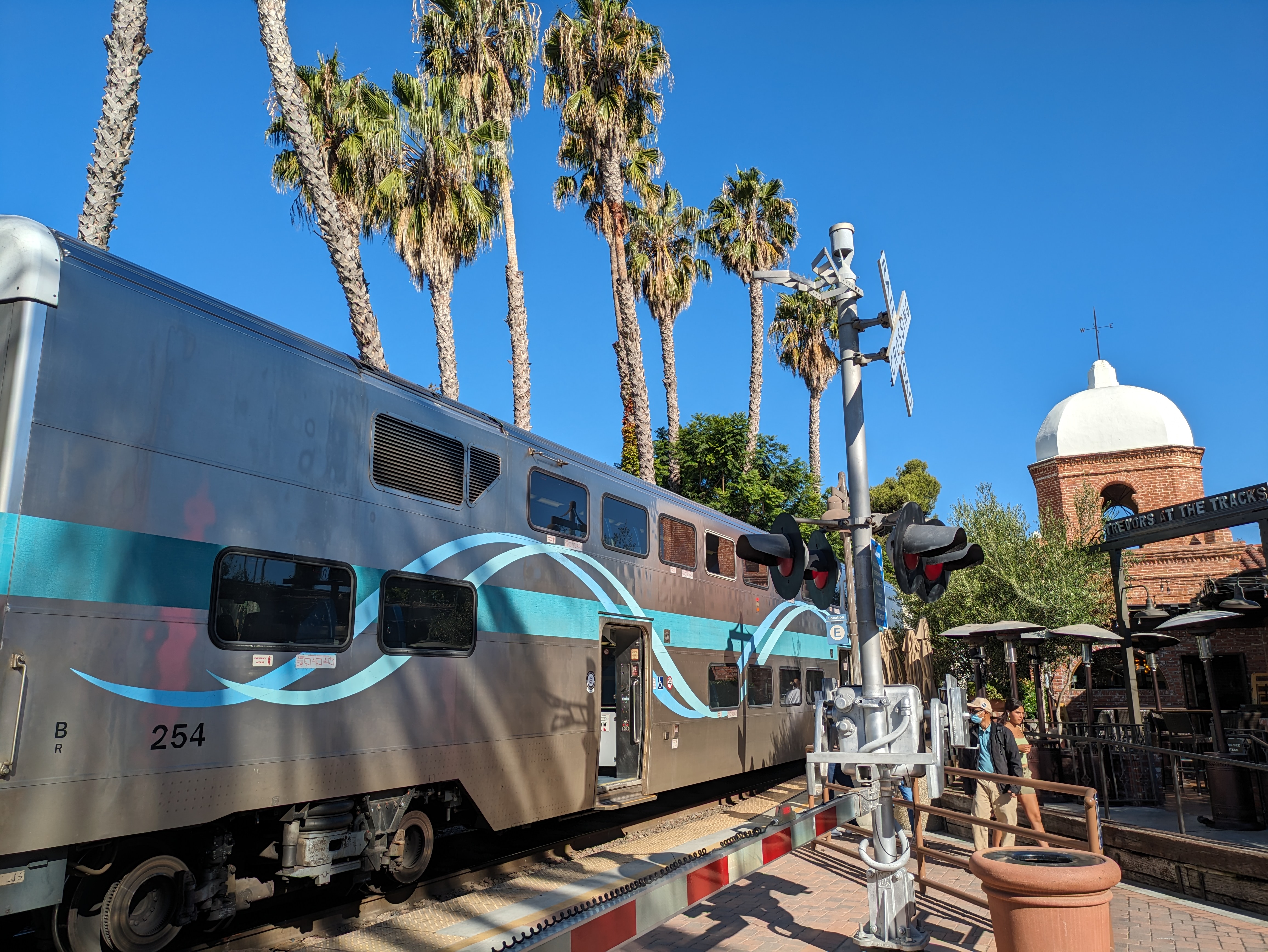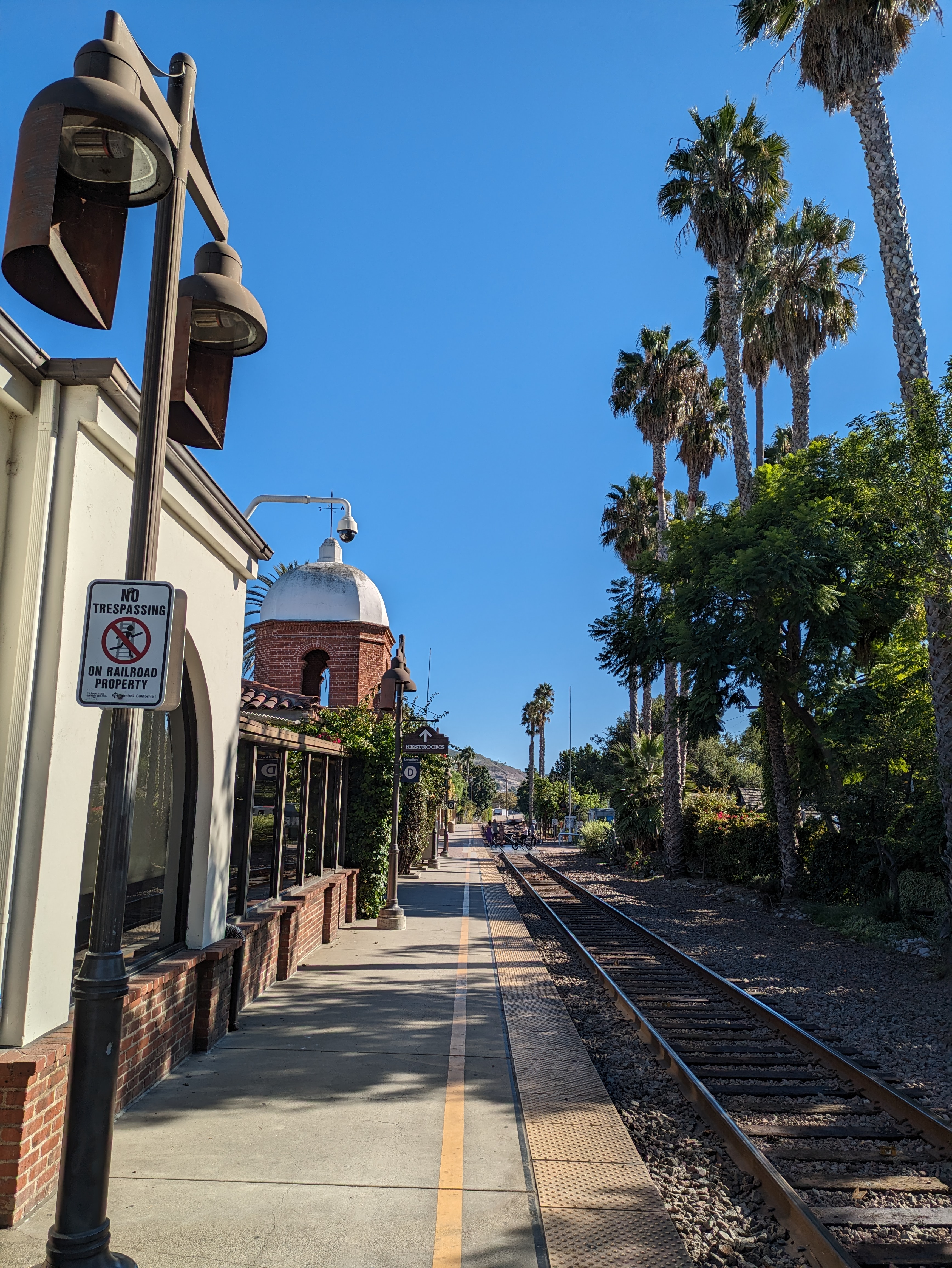 San Juan Capistrano charms you as soon as you step off the train. The old station (now a restaurant), the Capistrano Depot, is a beautiful old brick building built in Mission Revival style, with a domed tower on one corner overlooking a restaurant patio. The platform stretches up to a pair of boxcars, which hold the Amtrak ticket office, while tall trees across the tracks shelter the station from the neighborhood beyond. A busy pedestrian crossing across the tracks sits in the middle of the platform, and each train that stops here creates a brief flurry of activity and noise: the crossing bell starts dinging, the gates go down, the approaching train blares its horn before slowing to a stop, where it blocks the crossing. People flow out, gather around the train, some waving at the passengers still on board, and then the train takes off, the gates go back up, and all goes peaceful once again.