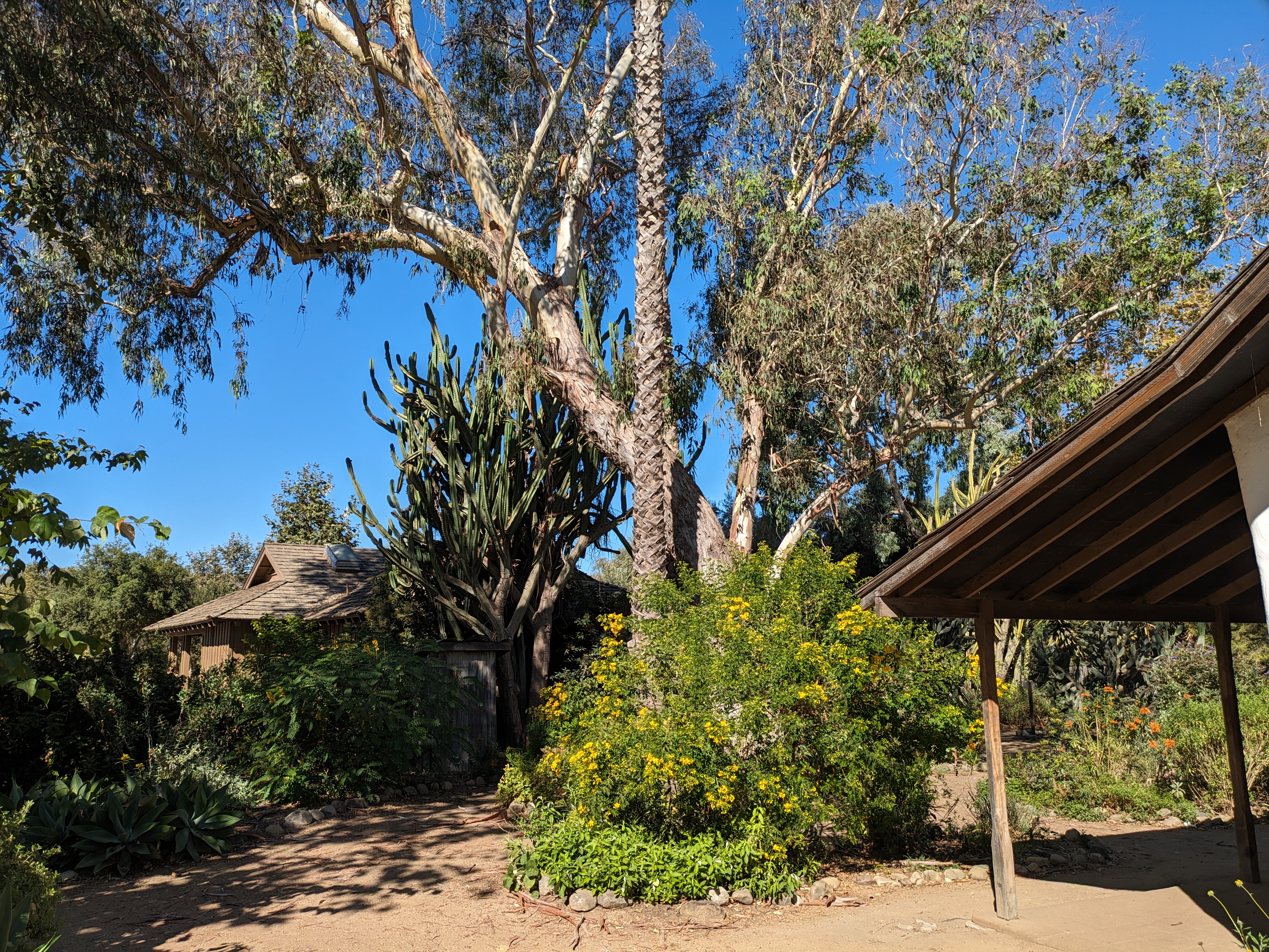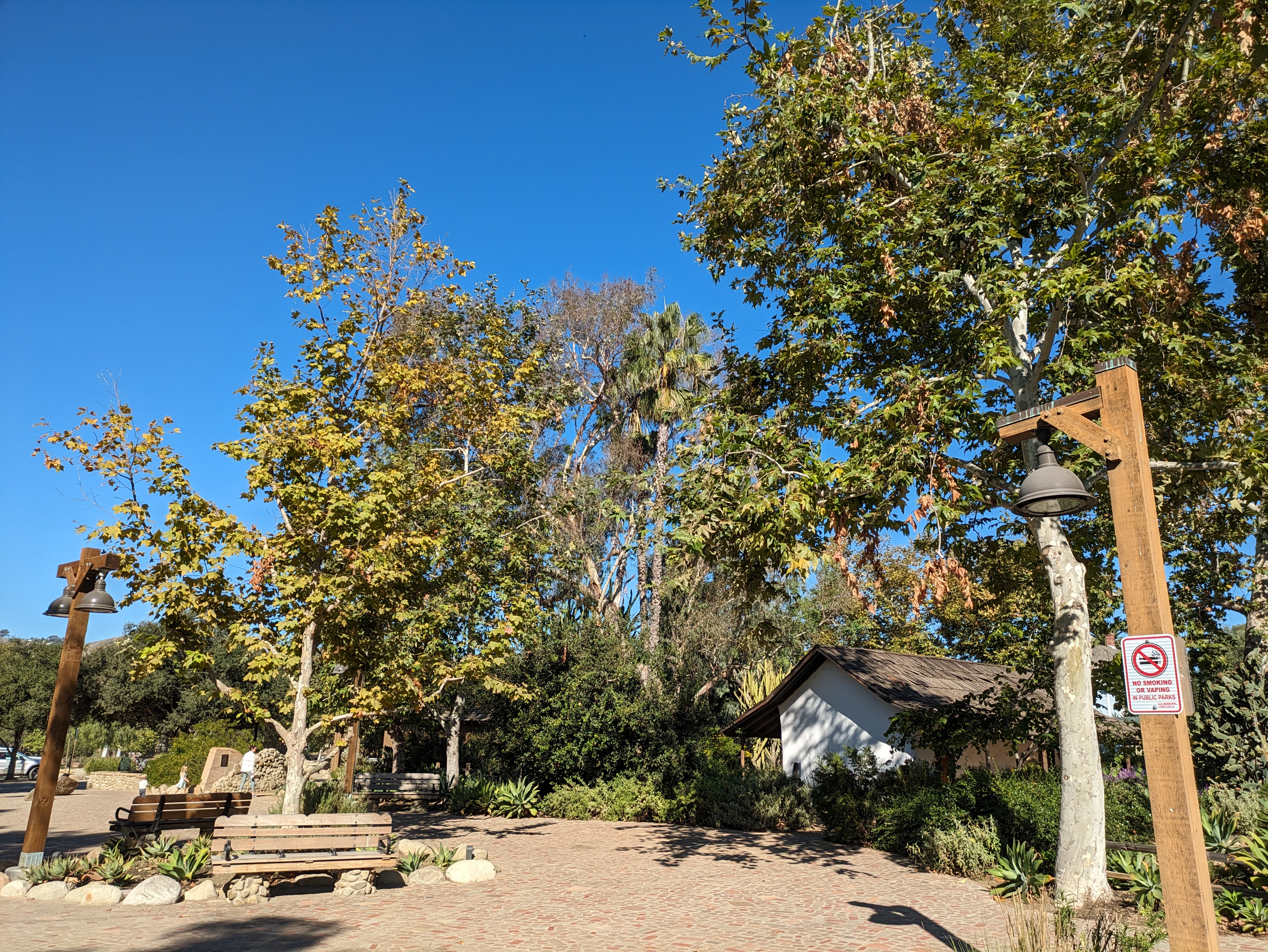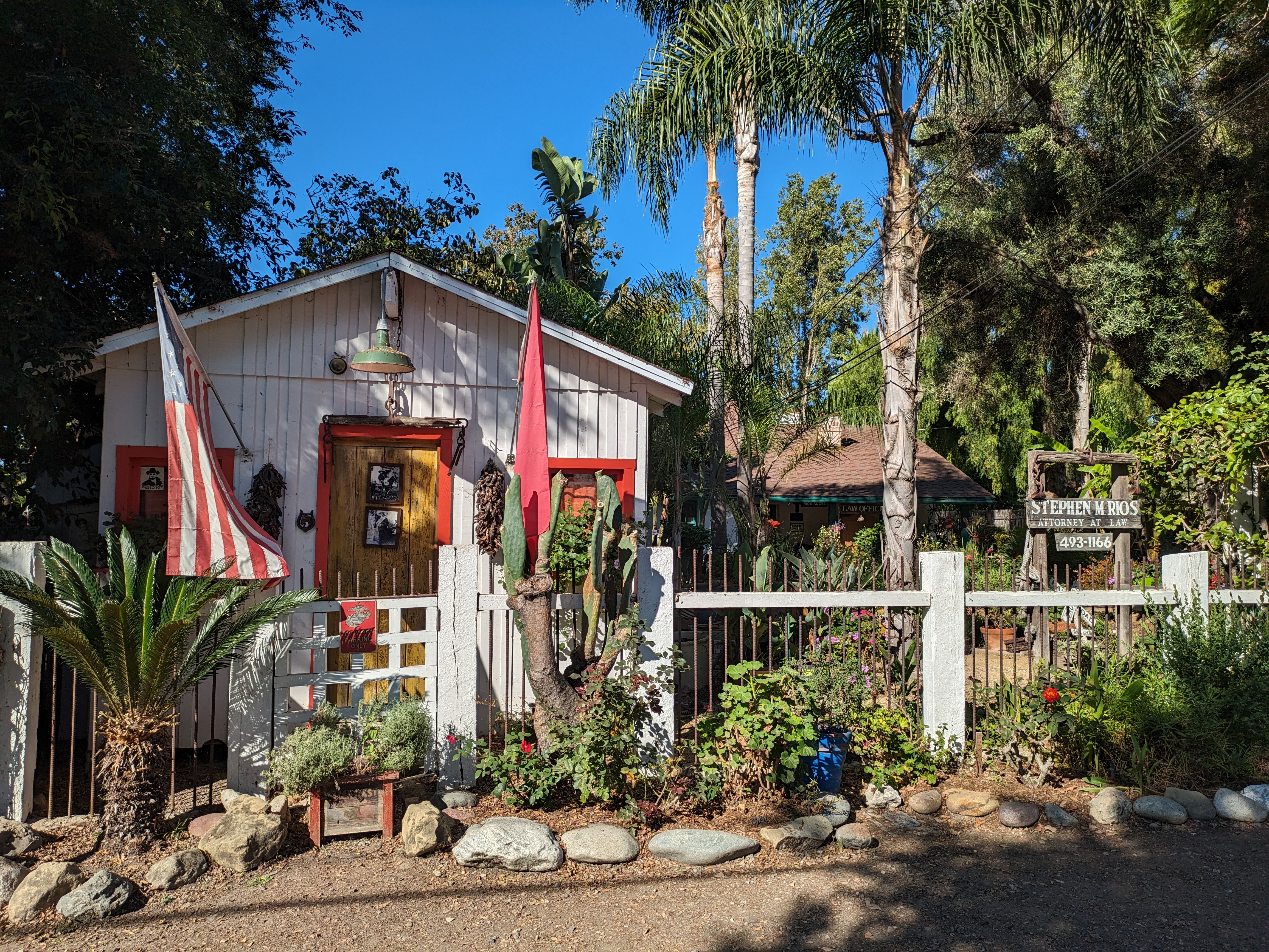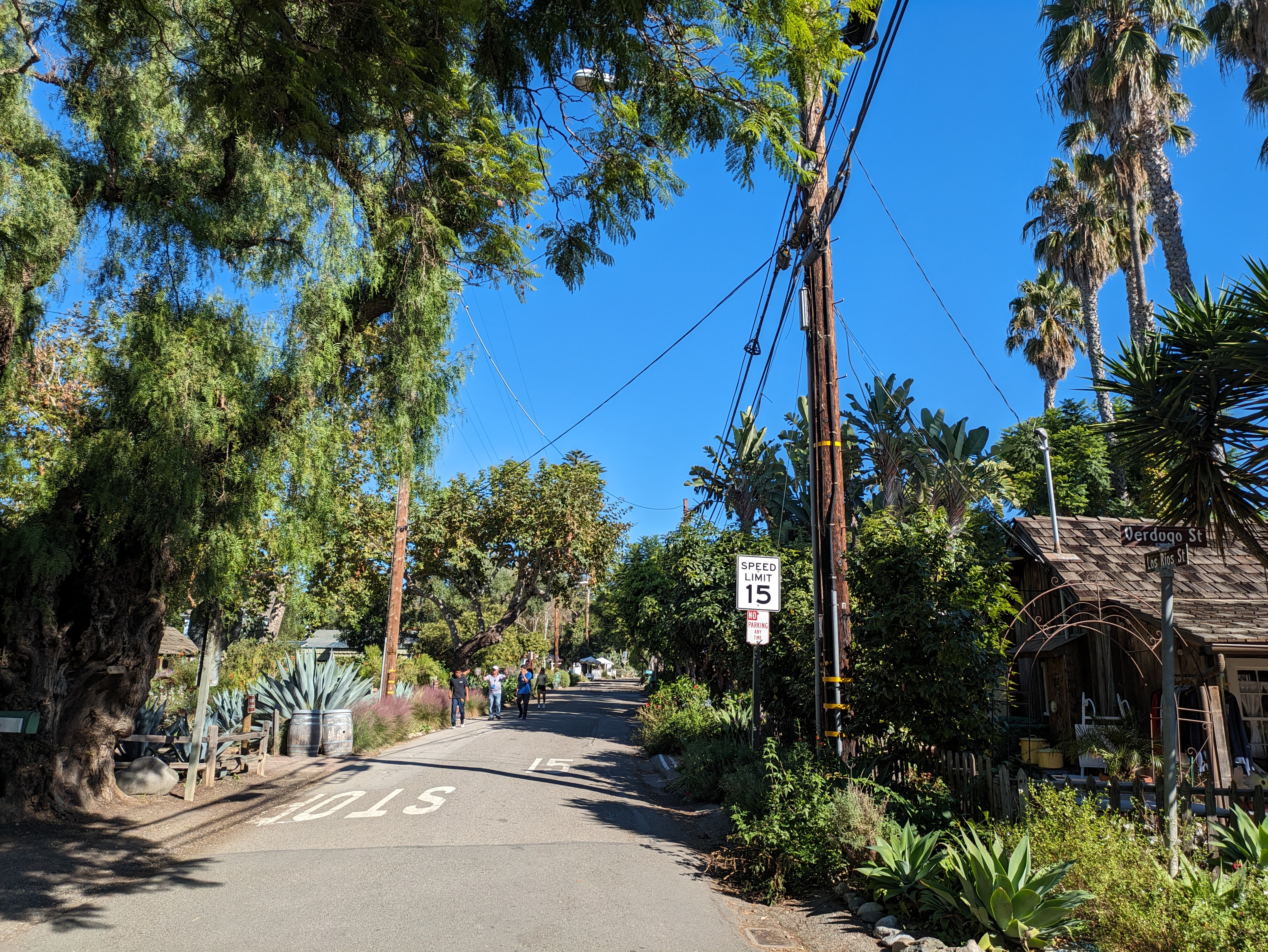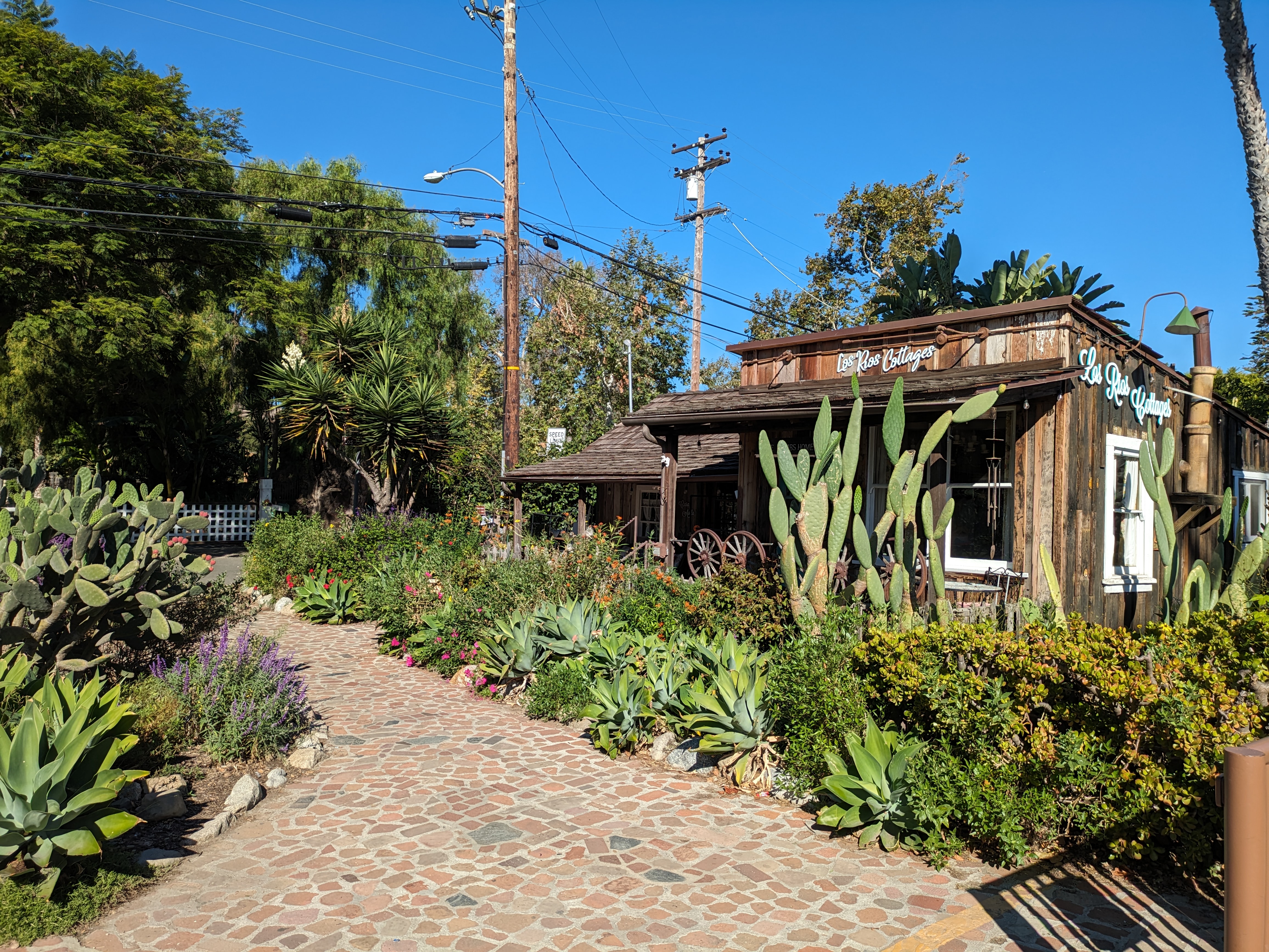 Once this brief cacophony surrounding the train vanishes, you can start to appreciate the pedestrian scale of your surroundings. On the other side of the tracks from the platform is a small but welcoming plaza that leads into the Los Rios Historic District, easily the most charming part of San Juan Capistrano. Los Rios Street is a shady residential street lined with lovely old houses draped in willows, eucalyptus, and palm trees. Indeed, Los Rios is the oldest continuously inhabited residential neighborhood in California, with people having lived here since the late 1700s. The street itself is very calm, with pedestrians free to walk down the middle, parting for the occasional car.