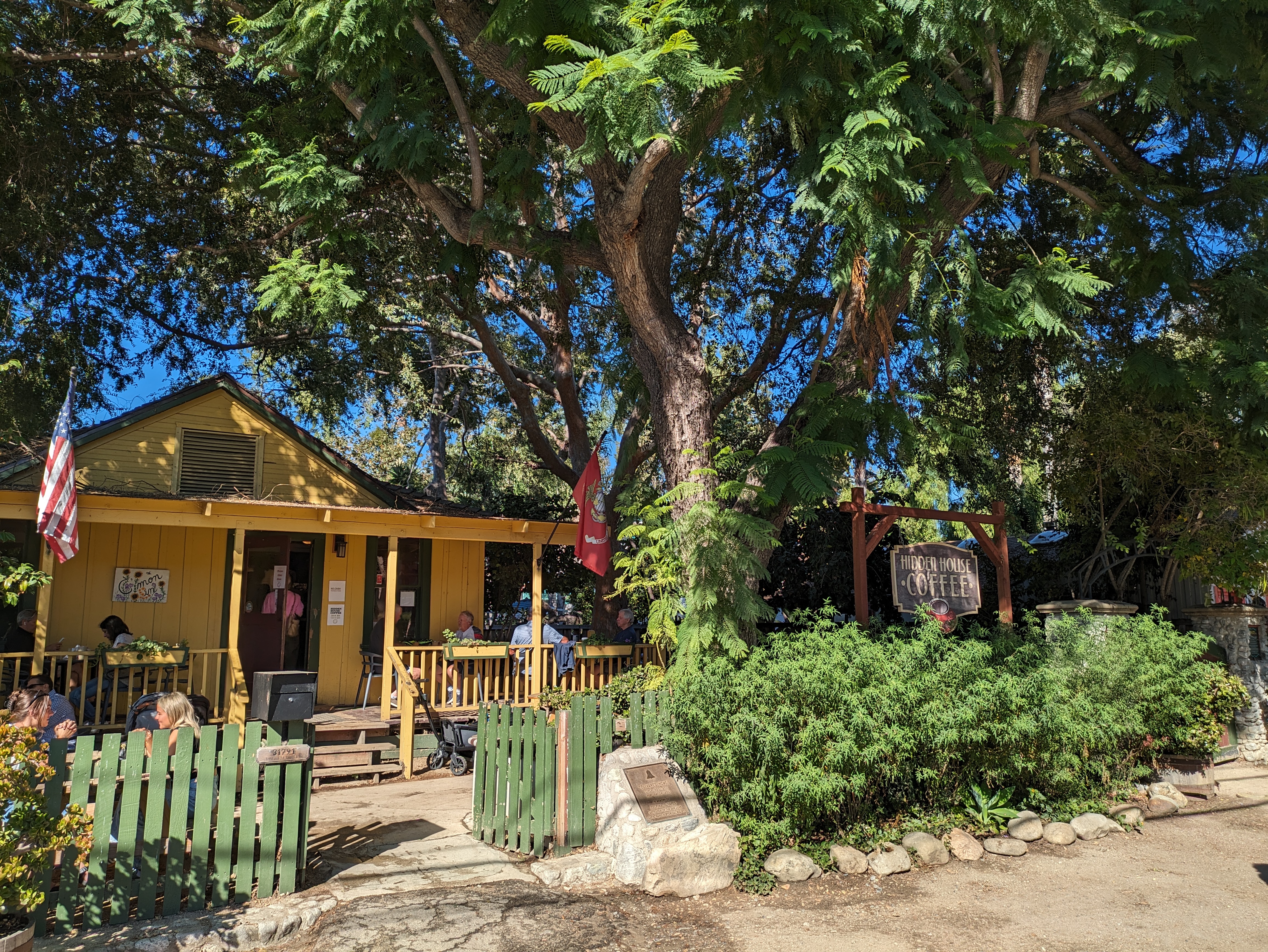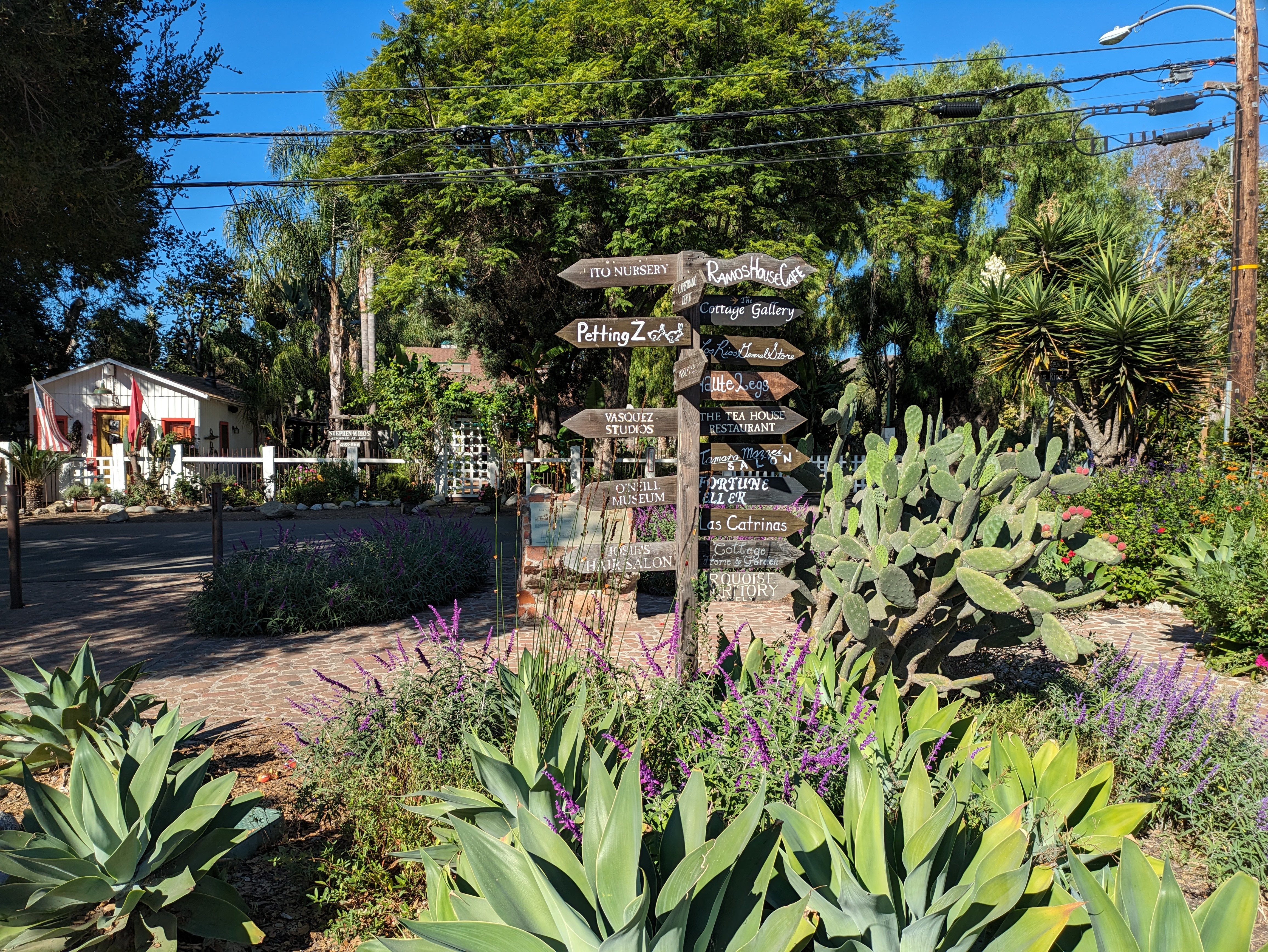 Along the street, the various houses have been converted to hold cafes, shops and galleries, often with quirky, old-fashioned signs to draw people in, alongside lush planting beds of succulents, palms, and colorful flowers. At one spot along the street, the twisting trunk of an oak tree is adorned with a little wooden sign that reads, “Old Mr. Tree, Circa 1800.” Directly across from the train station is charming Hidden House Coffee, which is always popular and has plenty of tables out front in the shade, and is a great place to start if you need a pick-me-up before walking around the neighborhood.