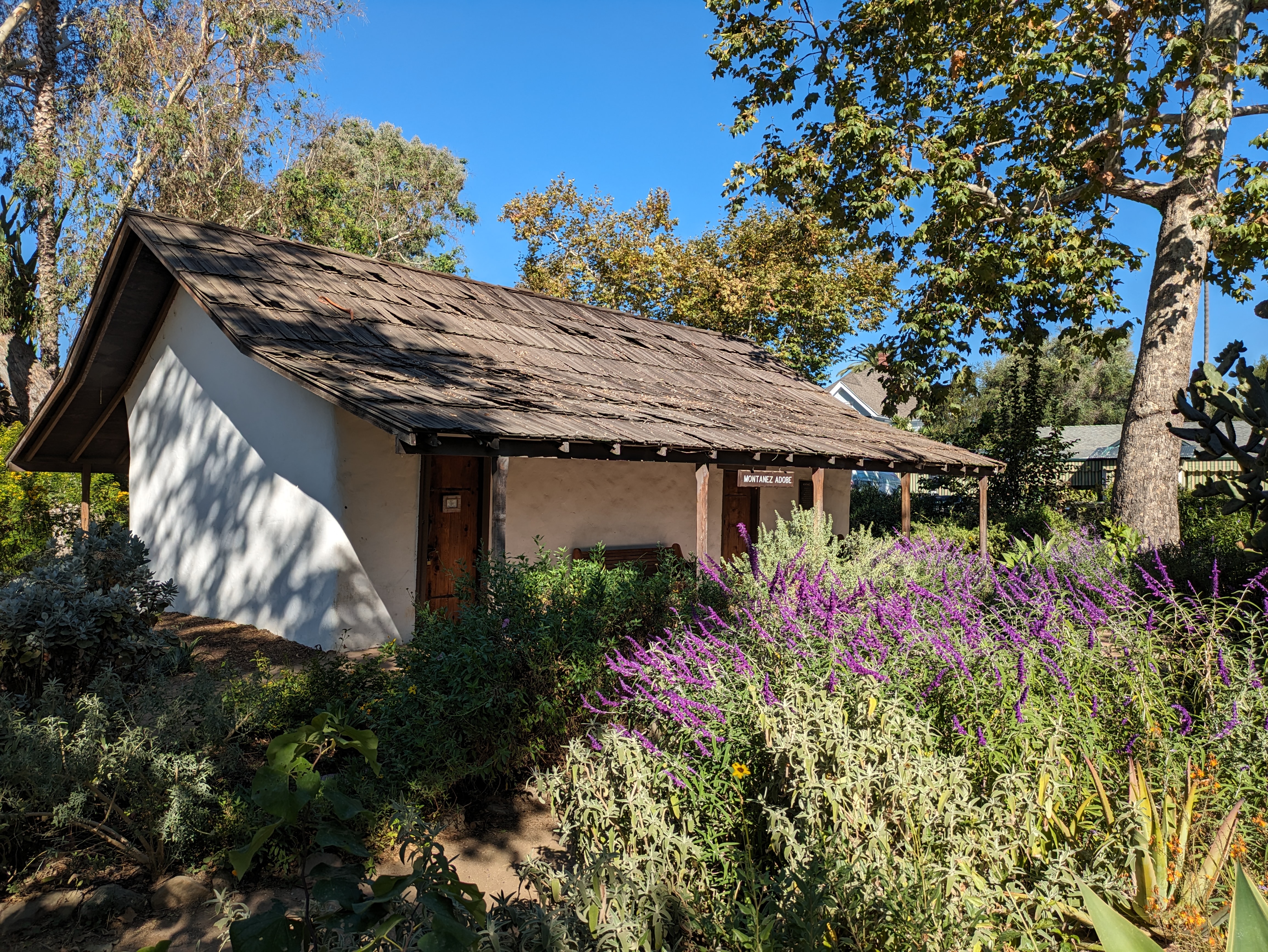 Returning to the train station and heading up Los Rios Street the other way, perhaps the best feature of the neighborhood is Los Rios Park, a public park that stretches from Los Rios all the way back to Trabuco Creek, a channelized stream running through town. At the entrance to the park is a small preserved adobe, the Montanez Adobe, that’s one of the oldest existing buildings in town and is surrounded by a lush butterfly garden filled with fragrant native flowers.