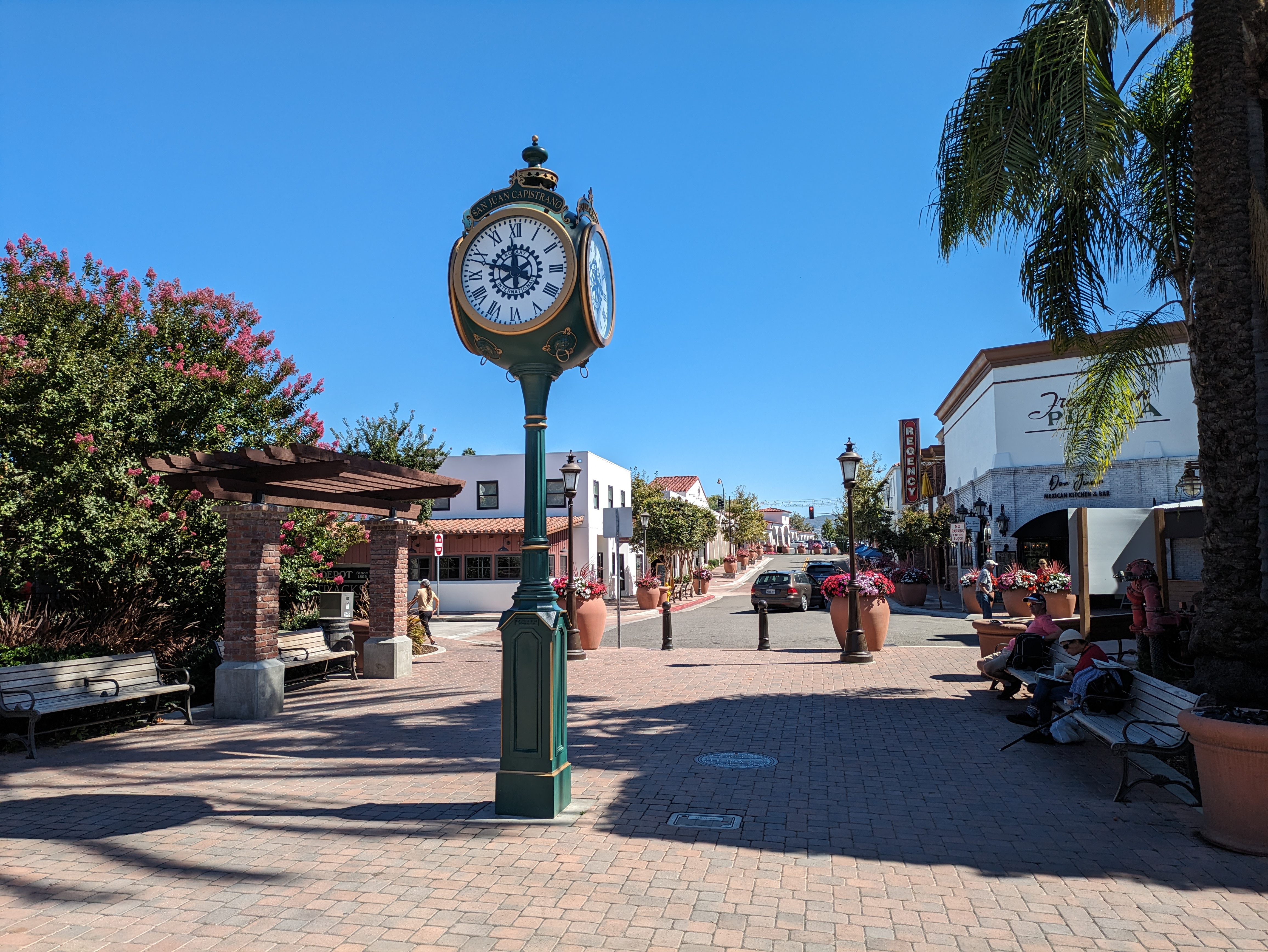 Returning to the train station and crossing the tracks, you’ll enter “Downtown” San Juan Capistrano, with its mixture of genuinely old buildings and newer lookalikes. It’s extremely compact; walk about three blocks in any direction and you’ll hit the typical strip malls and fast food restaurants of Orange County suburbia. Feel free to grab a map from the small info booth in front of the clock tower.