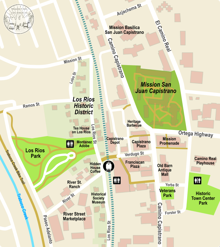 San Juan Capistrano is a small town at the southern end of Orange County, built around one of the original Spanish California missions, which is now a popular tourist attraction. In fact, the whole neighborhood surrounding the mission has become a tourist attraction, given that it is one of the oldest neighborhoods in California. And right in the middle of it is a perfectly placed train station just an hour and a half’s ride from Union Station.