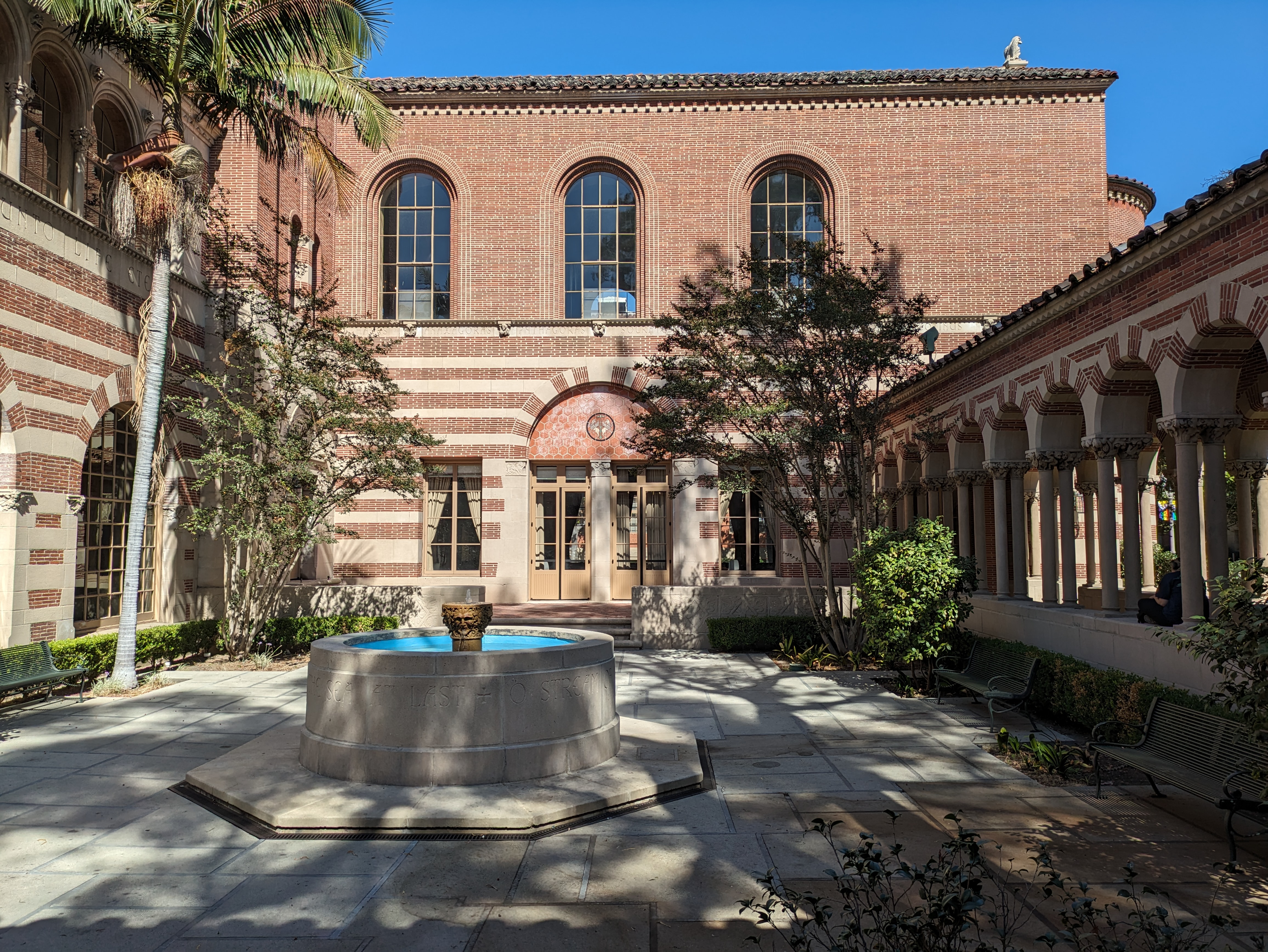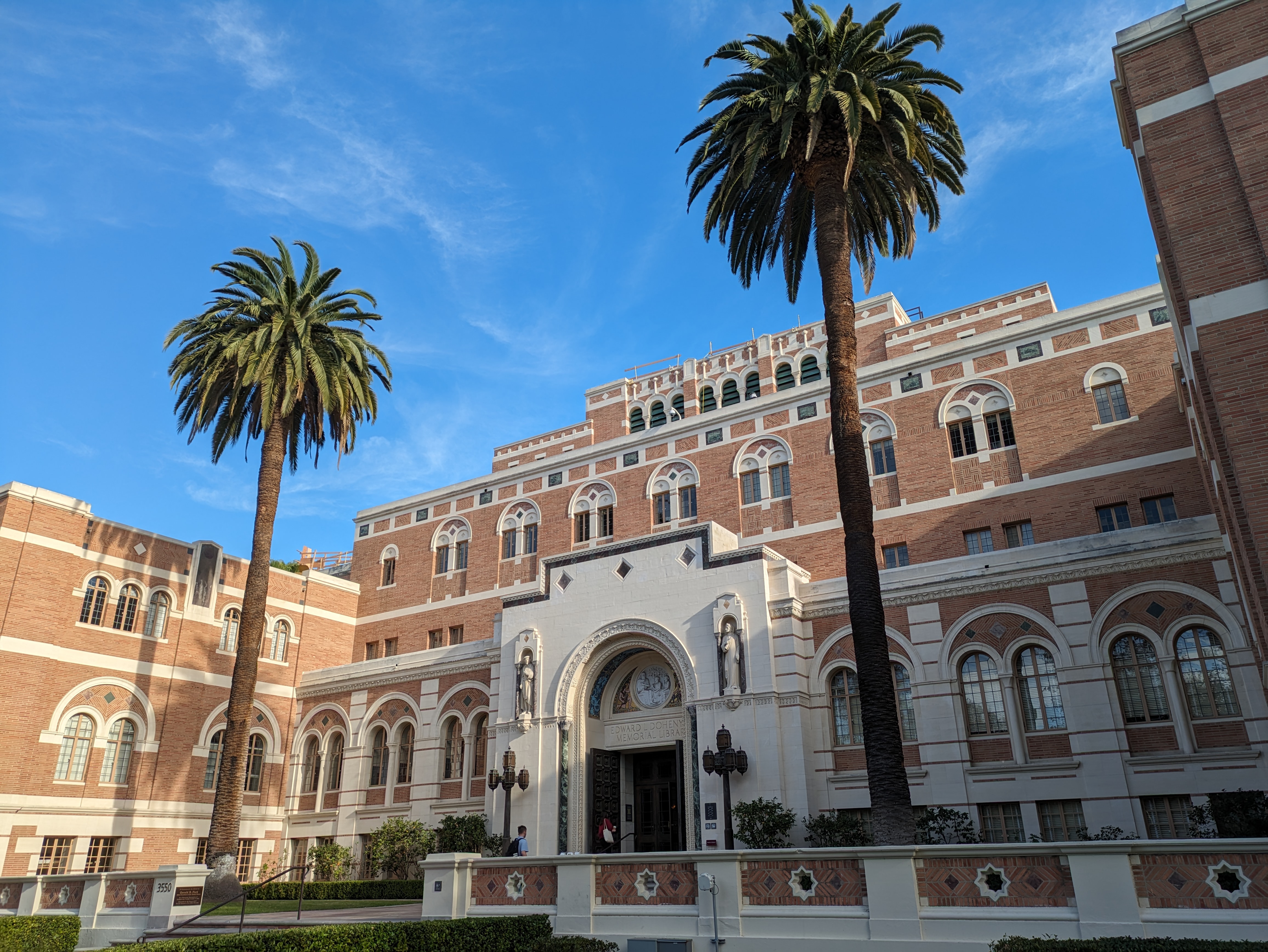 USC occupies a pristine and compact urban campus, situated between Exposition Blvd on the south, Jefferson Blvd on the north, Vermont Avenue on the west, and Figueroa on the east. The architecture has a very uniform red brick style, though this varies from older Italianate-style buildings to blockier, modernist buildings. Though overall very pleasant, the uniformity of the architecture means that there are only a handful of standout buildings. Fortunately, we’ll be starting off with one of the best.
