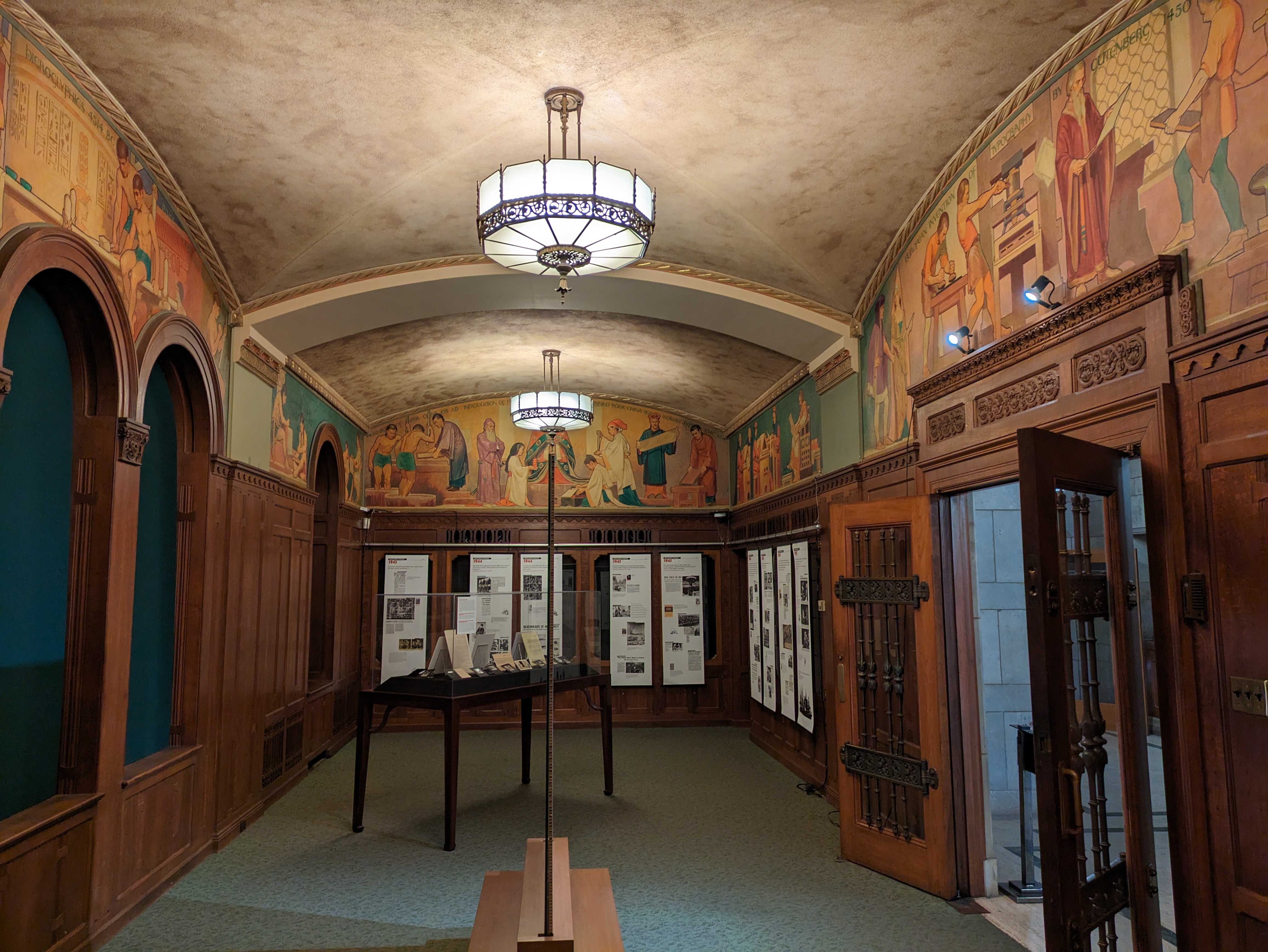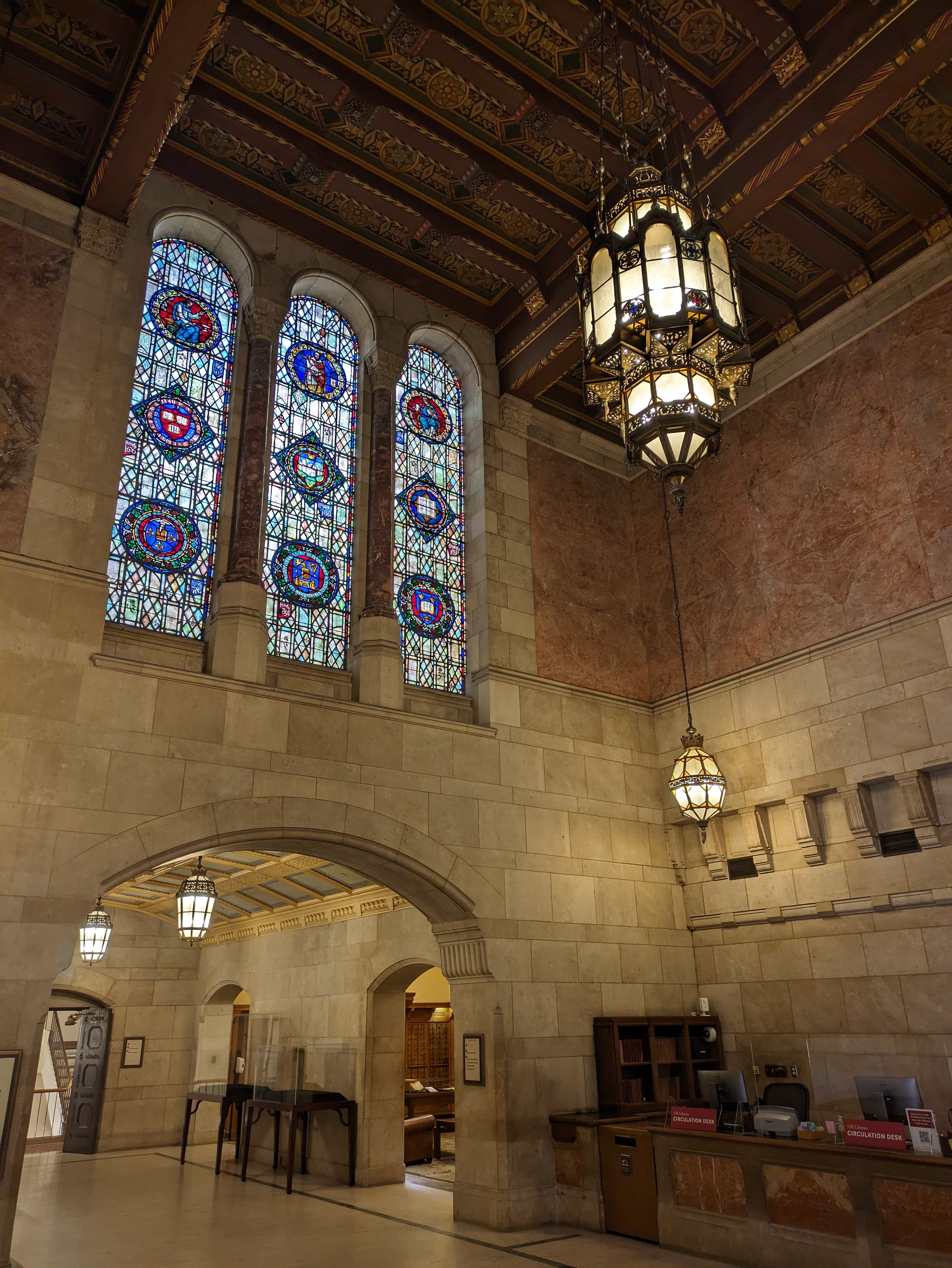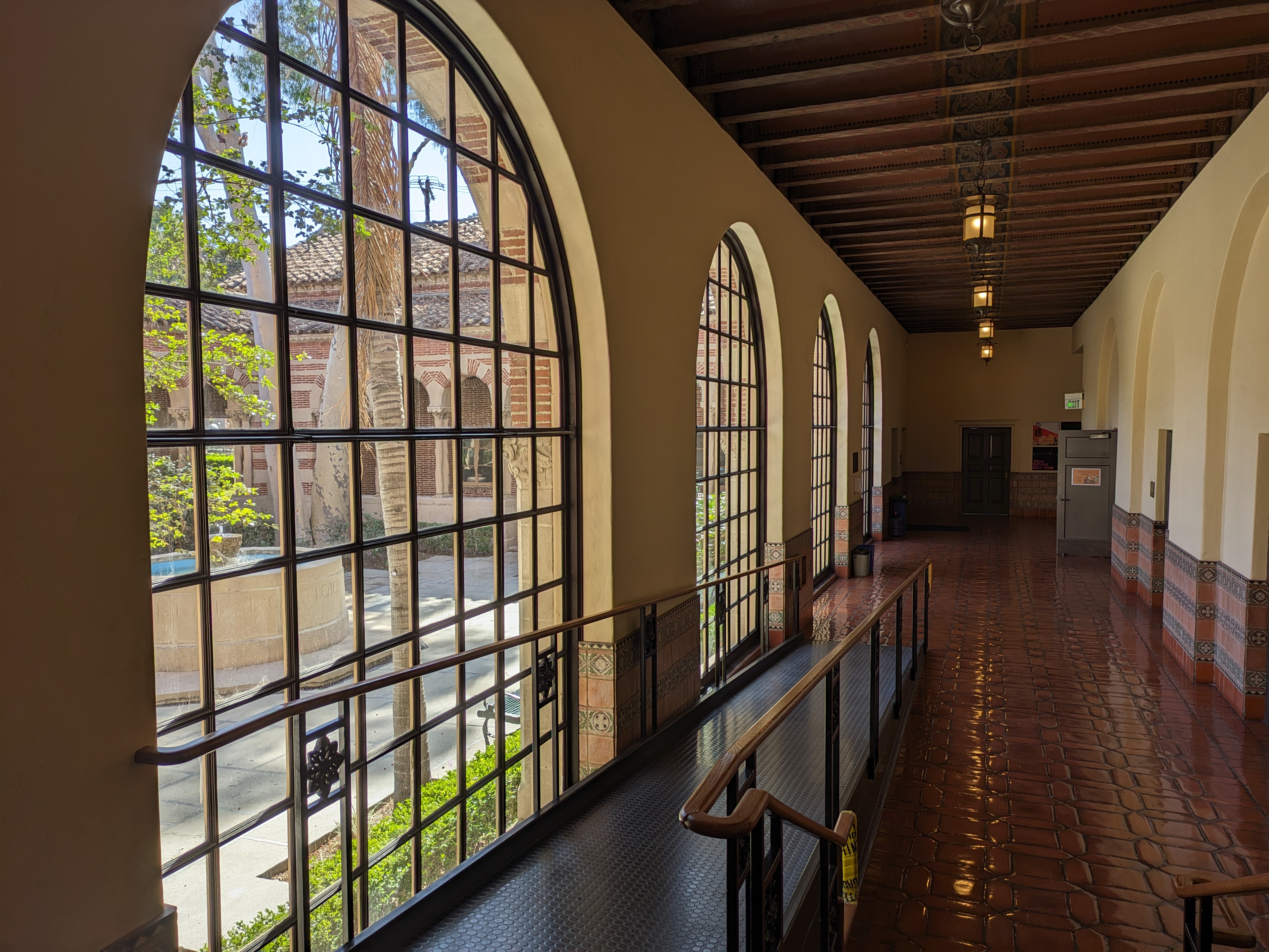 Continuing across the square, Doheny Library sits directly across facing the Bovard Building. Security will ask you to present a photo ID when you enter, but it’s worthwhile to see the architecture inside. A small exhibit hall called the Treasure Room is located down the hallway to your right, which hosts changing displays related to Southern California history and has some interesting murals to admire.