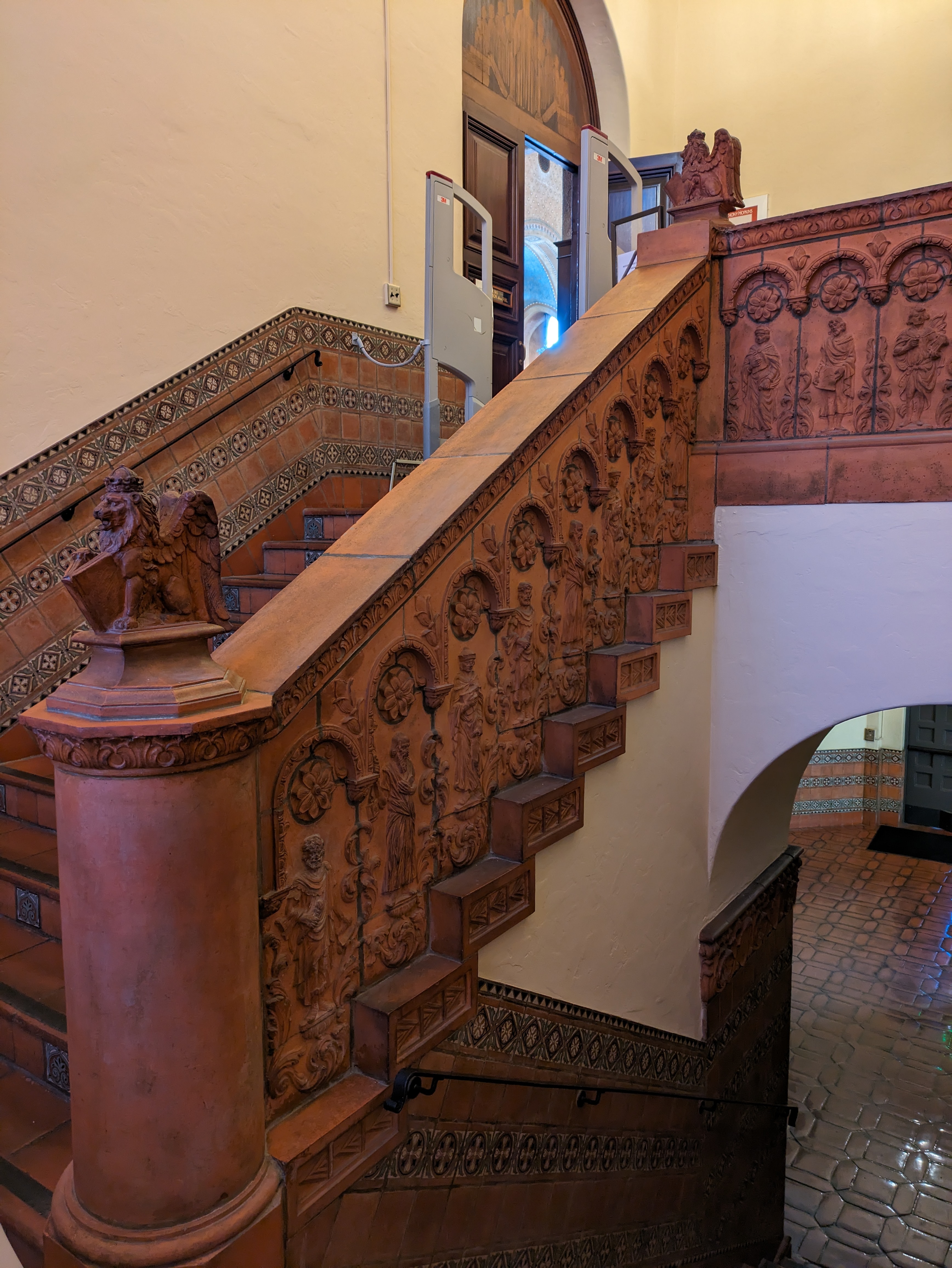You’ll be in awe as soon as you step inside the library, with its arched columns reaching to the high ceiling. Between the stacks, tall windows allow sunlight to pour in, with tile mosaics depicting famous philosophers. At one end of the room is an array of beautiful stained glass windows, while at the other end is a brick fireplace with plush armchairs that would look right at home in a Harry Potter film (unsurprisingly, this room has indeed been used in a bunch of movies). Even the staircase leading up to the library is impressive, with its tile steps and intricately carved banister.