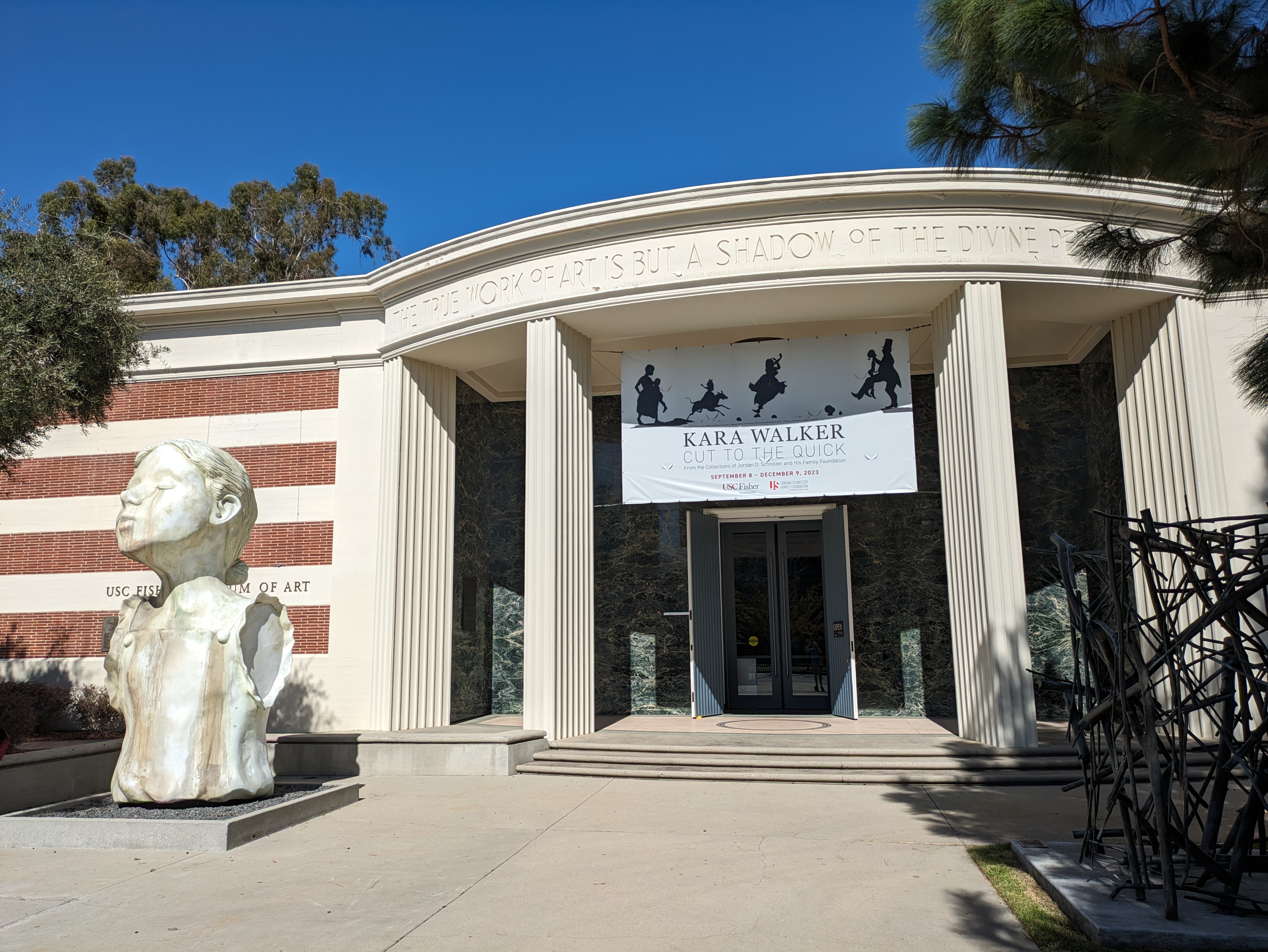 Next door, directly behind Mudd Hall, is the USC Fisher Museum of Art, which credits itself as the first museum in Los Angeles devoted exclusively to art. The museum is located within the art building, but it has a prominent entrance facing Exposition Boulevard; you just have to walk around the corner from Mudd Hall, where a small sculpture garden will greet you at the entrance to the museum.