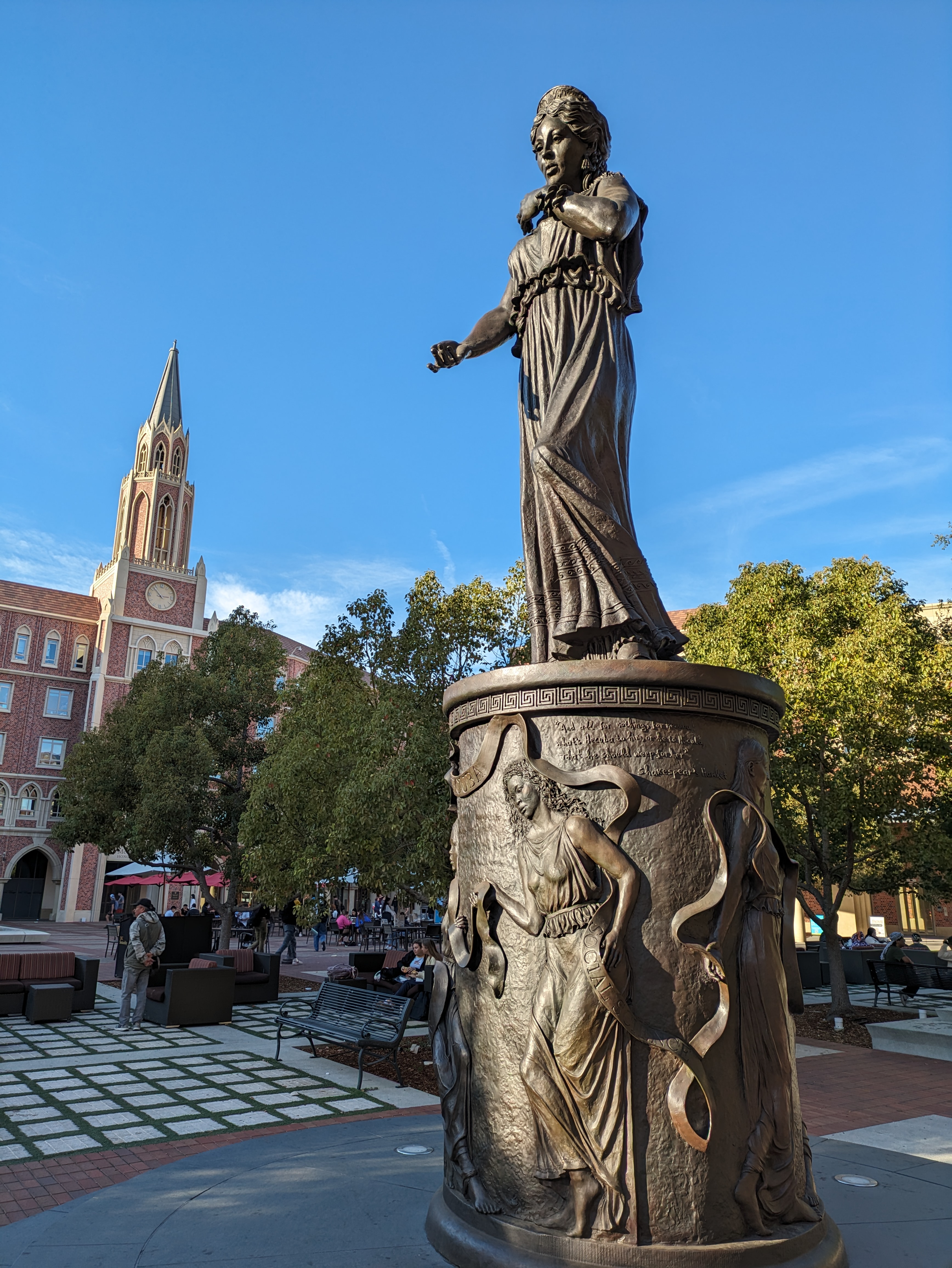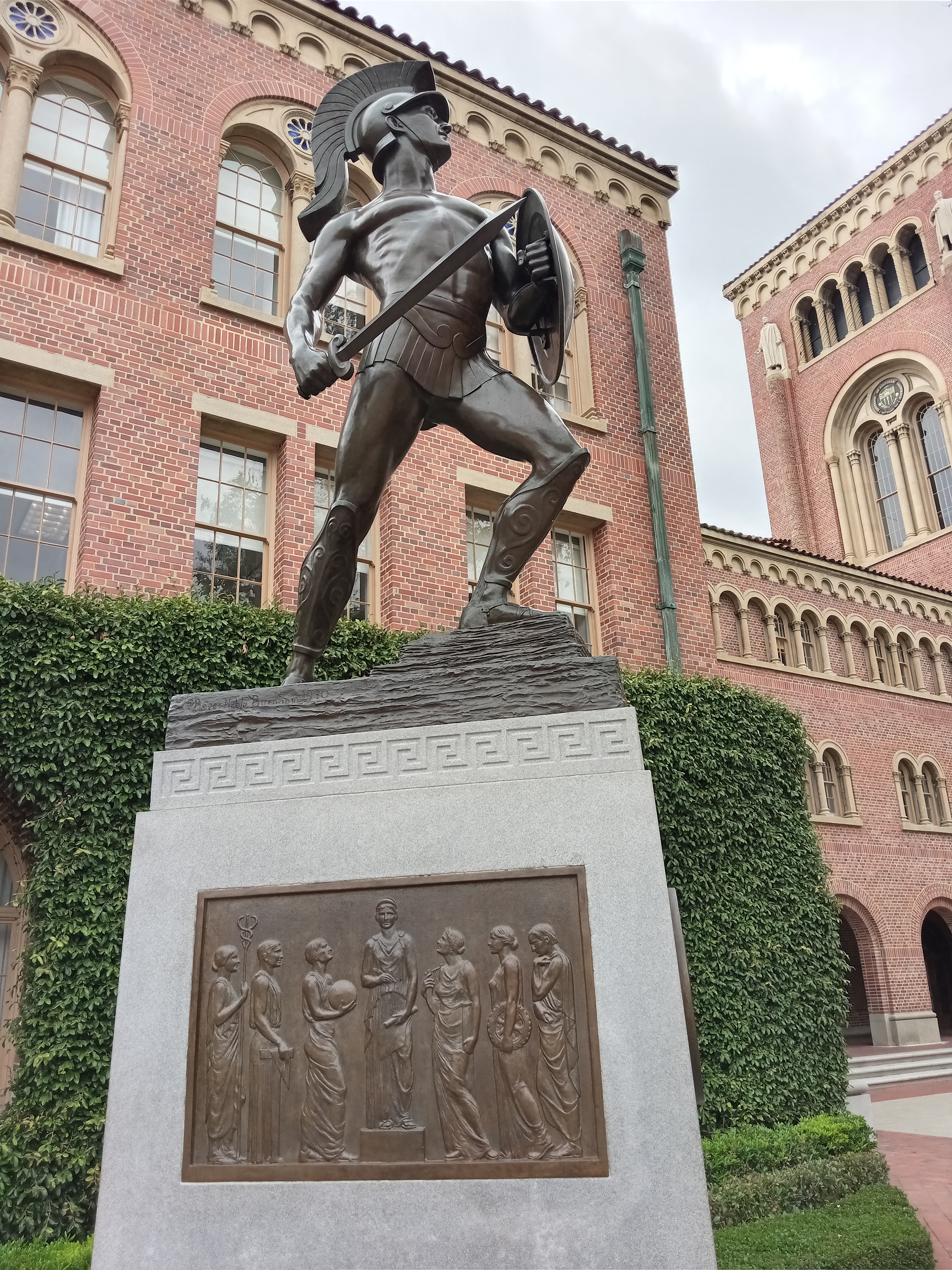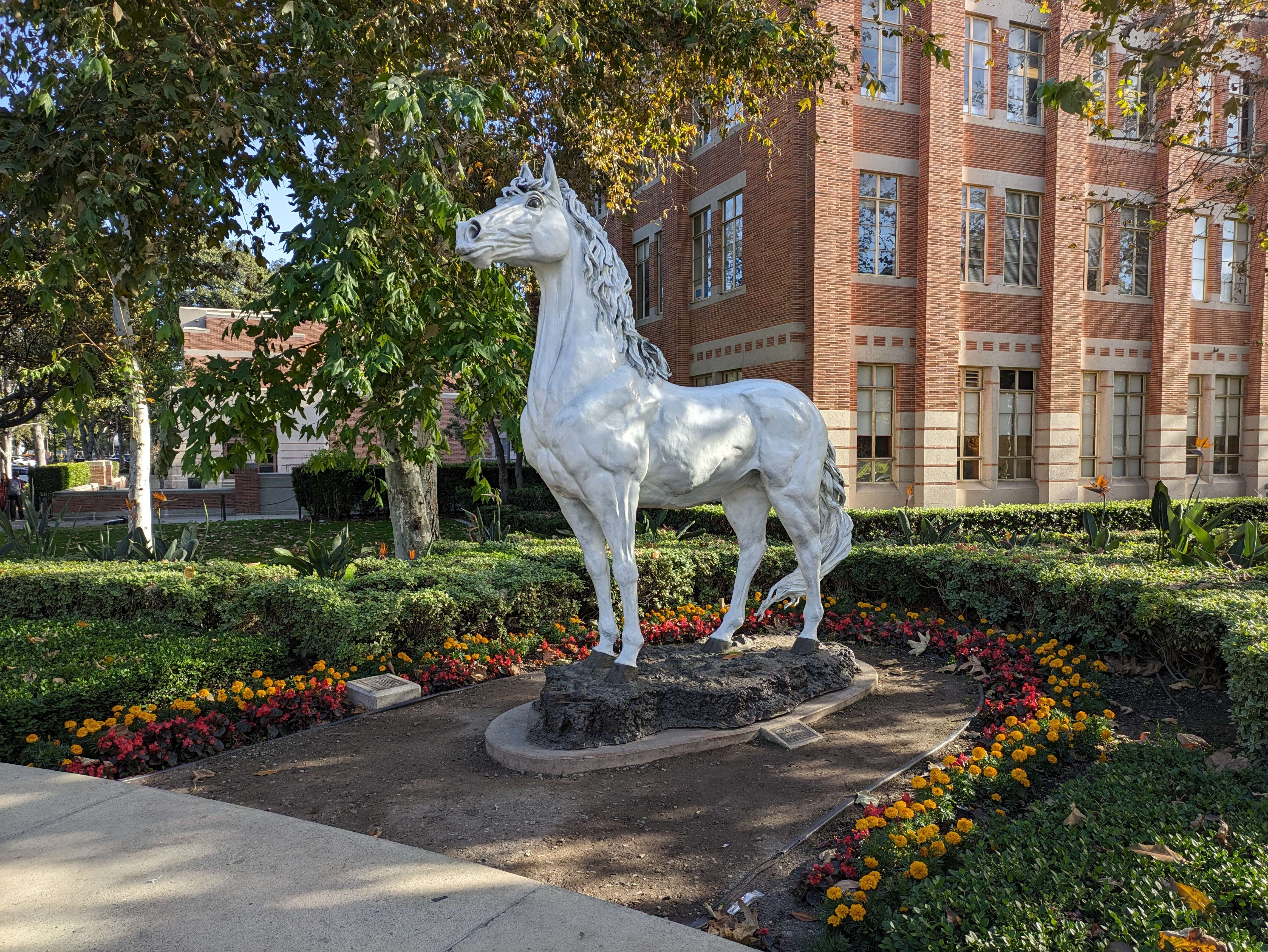 The plaza itself has two notable landmarks: a lovely fountain overlooked by a rather stunning, gleaming white statue of Traveler the Horse, USC’s animal mascot since the 1960s, who rides into football games with a trojan soldier on his back. The other landmark is a statue of Tommy Trojan, the university’s most popular mascot, in front of the Bovard Building, which serves as a common meeting spot as well as the target of various school pranks and hijinks.