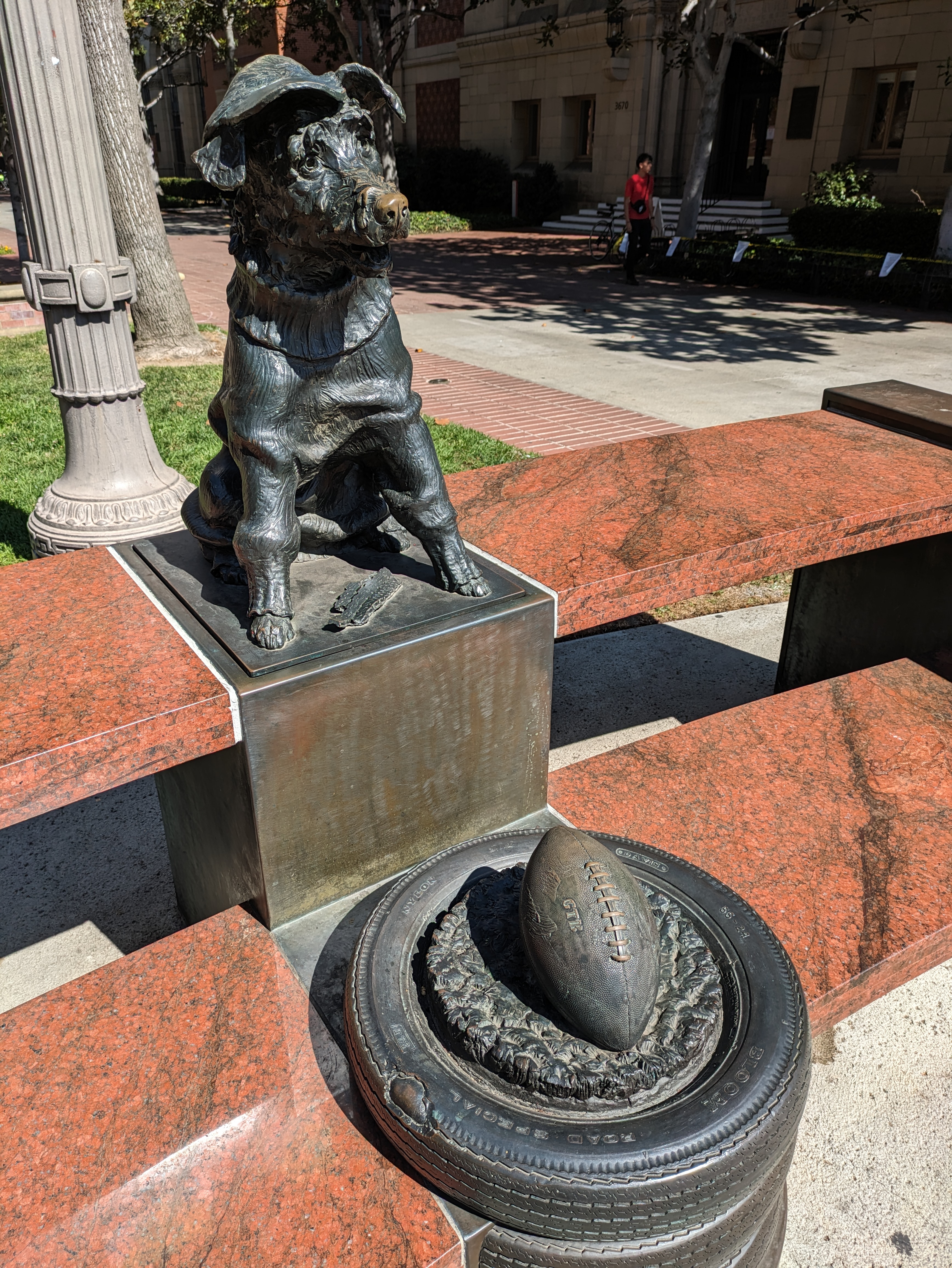 Returning to Mudd Hall, you can start up Trousdale Parkway, the main walkway that leads you into the heart of campus. Right in the center at the start of the parkway is a statue of a shaggy dog dubbed George Tirebiter, a stray dog on campus so named because he apparently loved chasing cars and biting the tires. After being taken in by the students, he became a beloved mascot at USC football games in the 1940s and ’50s.