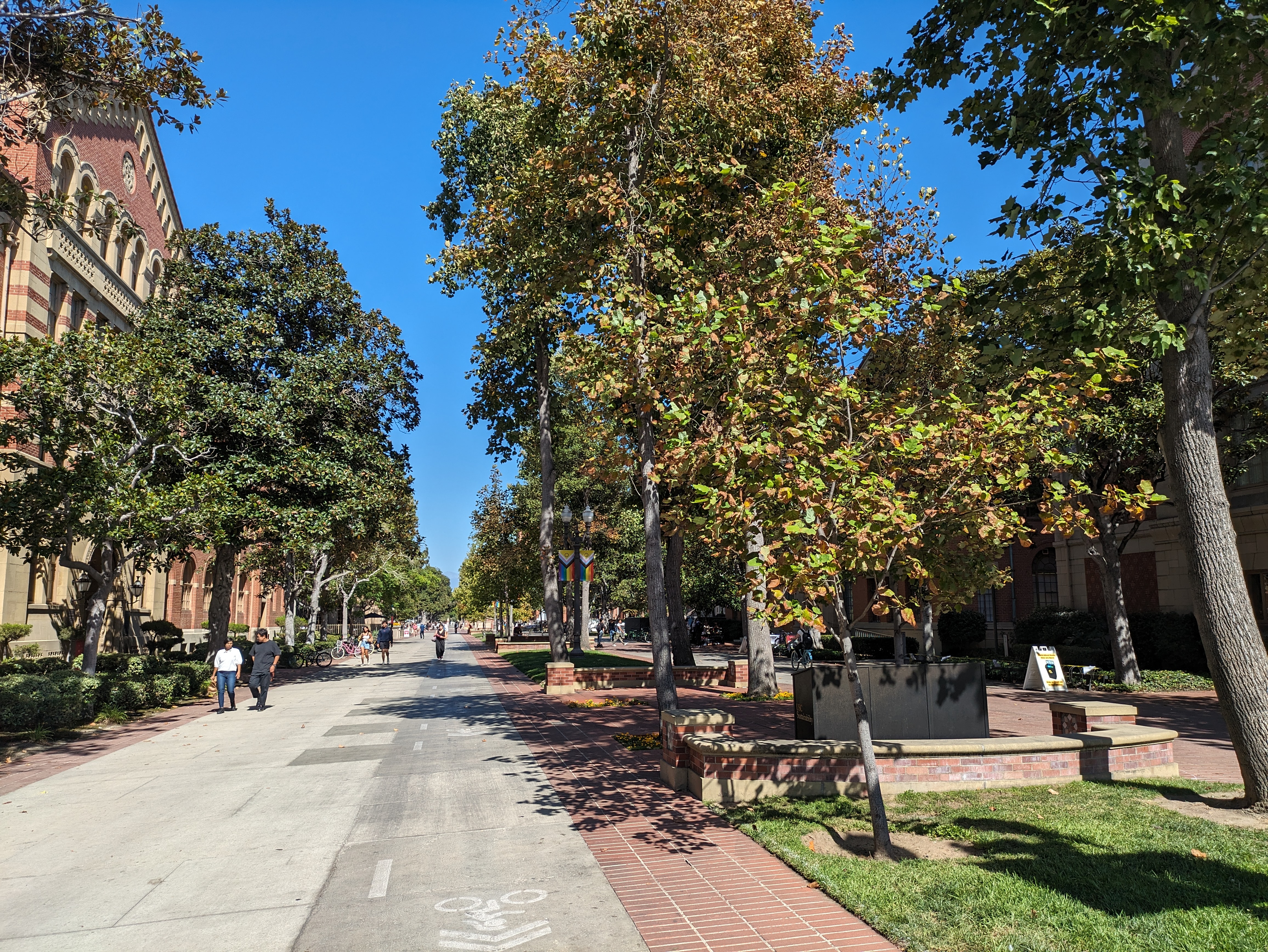 This stretch of the parkway is very manicured, planted with shade trees and beds of flowers in the school colors. Past the first couple sets of buildings, you’ll enter Hahn Plaza, the very heart of the campus, surrounded by some of its most prominent buildings: the student union and the campus center (with various student functions and a food court) to the southwest, the Bovard Administration Building to the northwest (also a bit of an architectural landmark), and the main library just across the public square to the east.