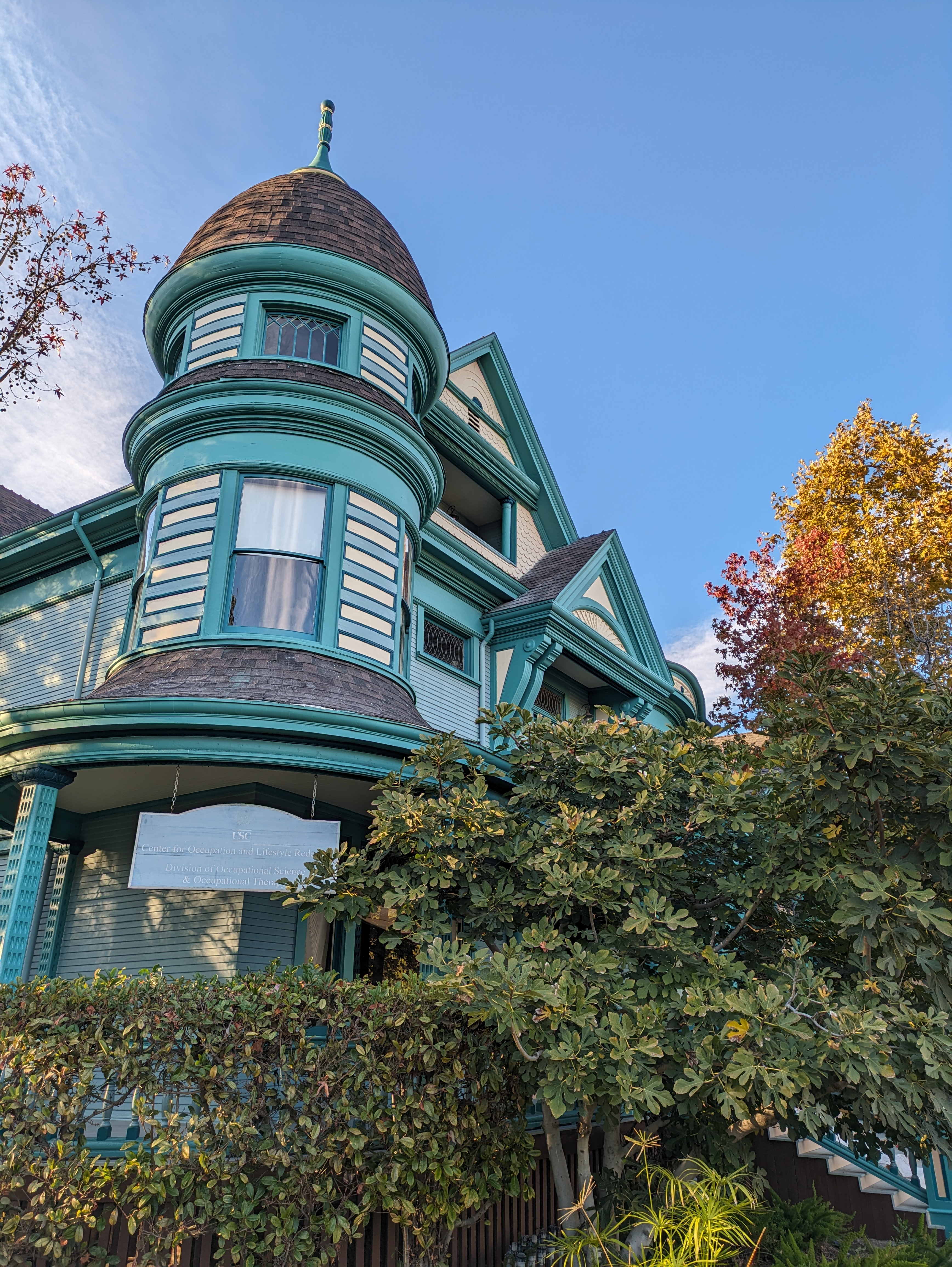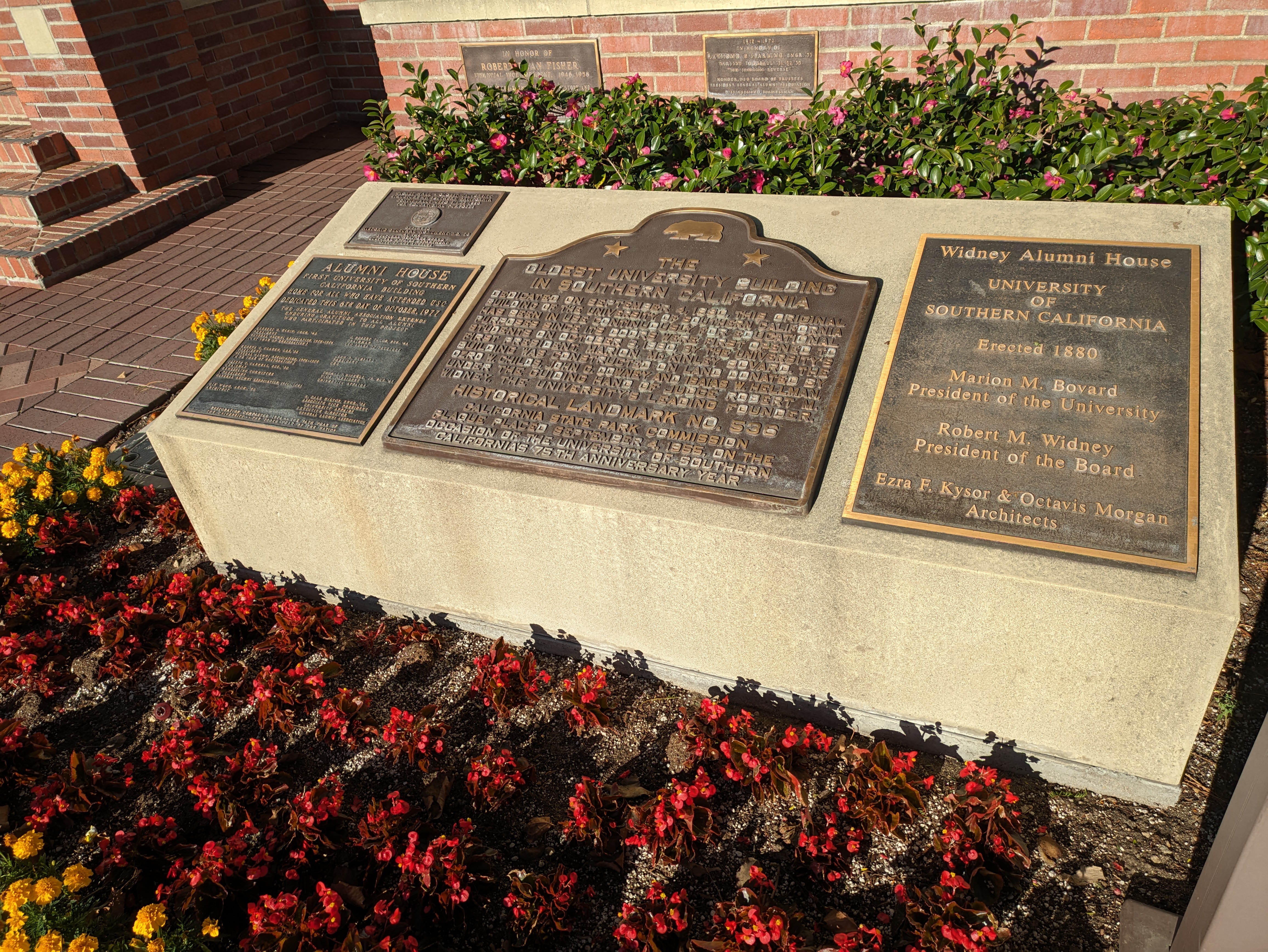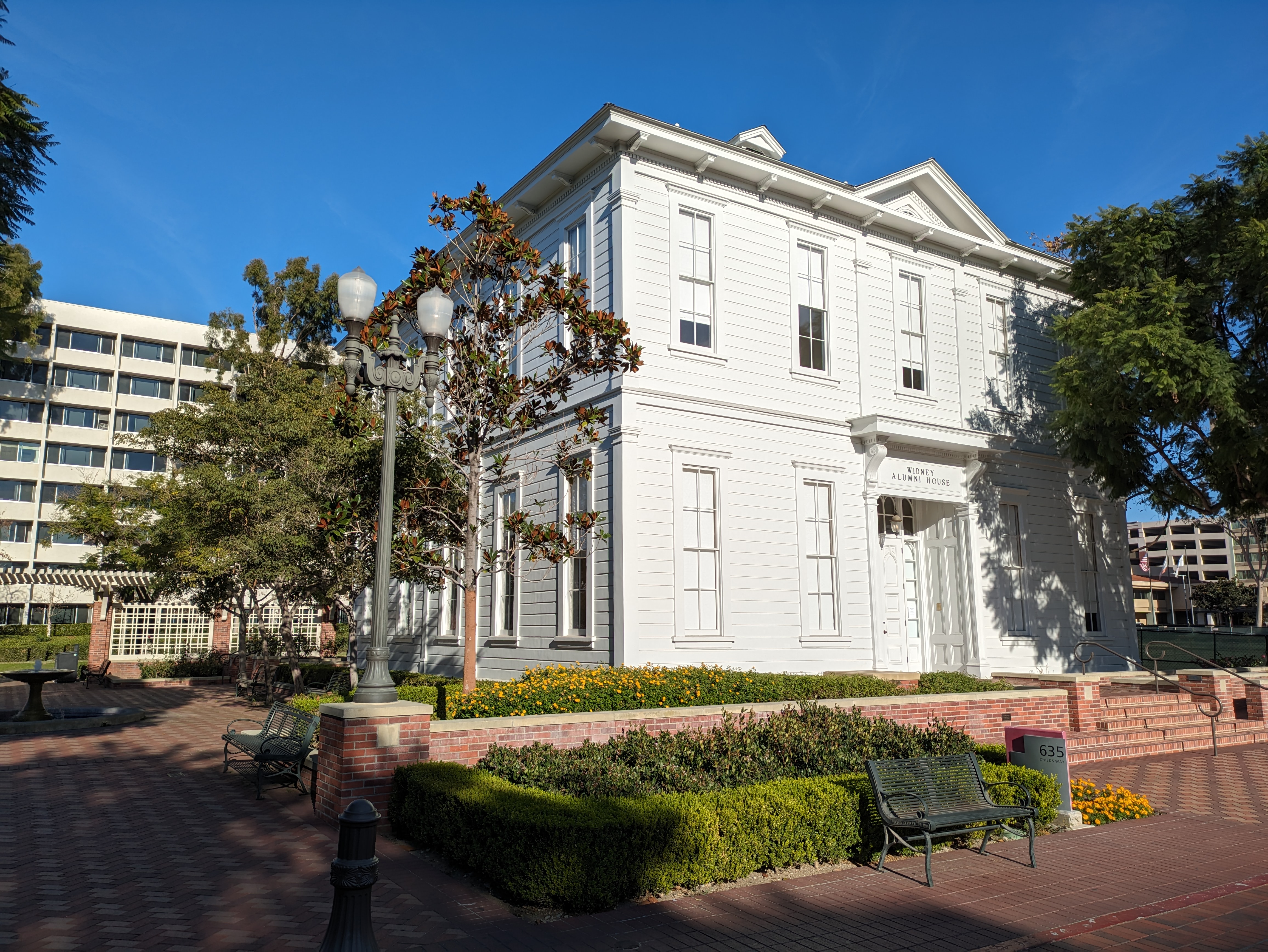 Directly behind the Doheny Library is a small rose garden adjacent to a wooden, white-painted house that stands out for looking nothing at all like USC’s normal palette of red brick and concrete. This is the Widney Alumni House, dedicated in 1880 and not just the oldest building on campus, but the oldest existing university building in all of Southern California. This was USC’s first building, and it has been moved several times to accommodate the expansion of the campus. Today it houses the alumni association, and has an elaborate plaque out front explaining the history of the building.