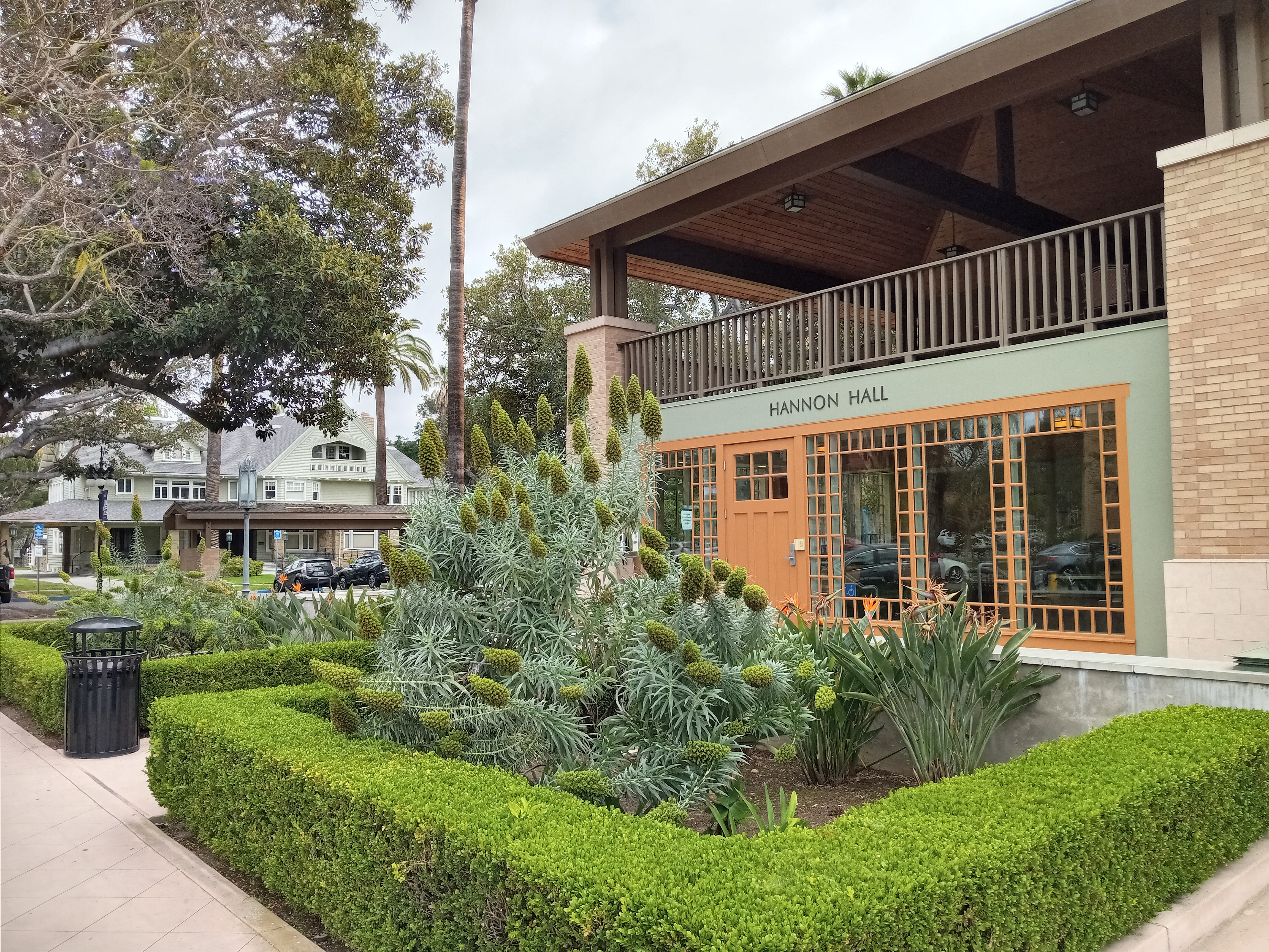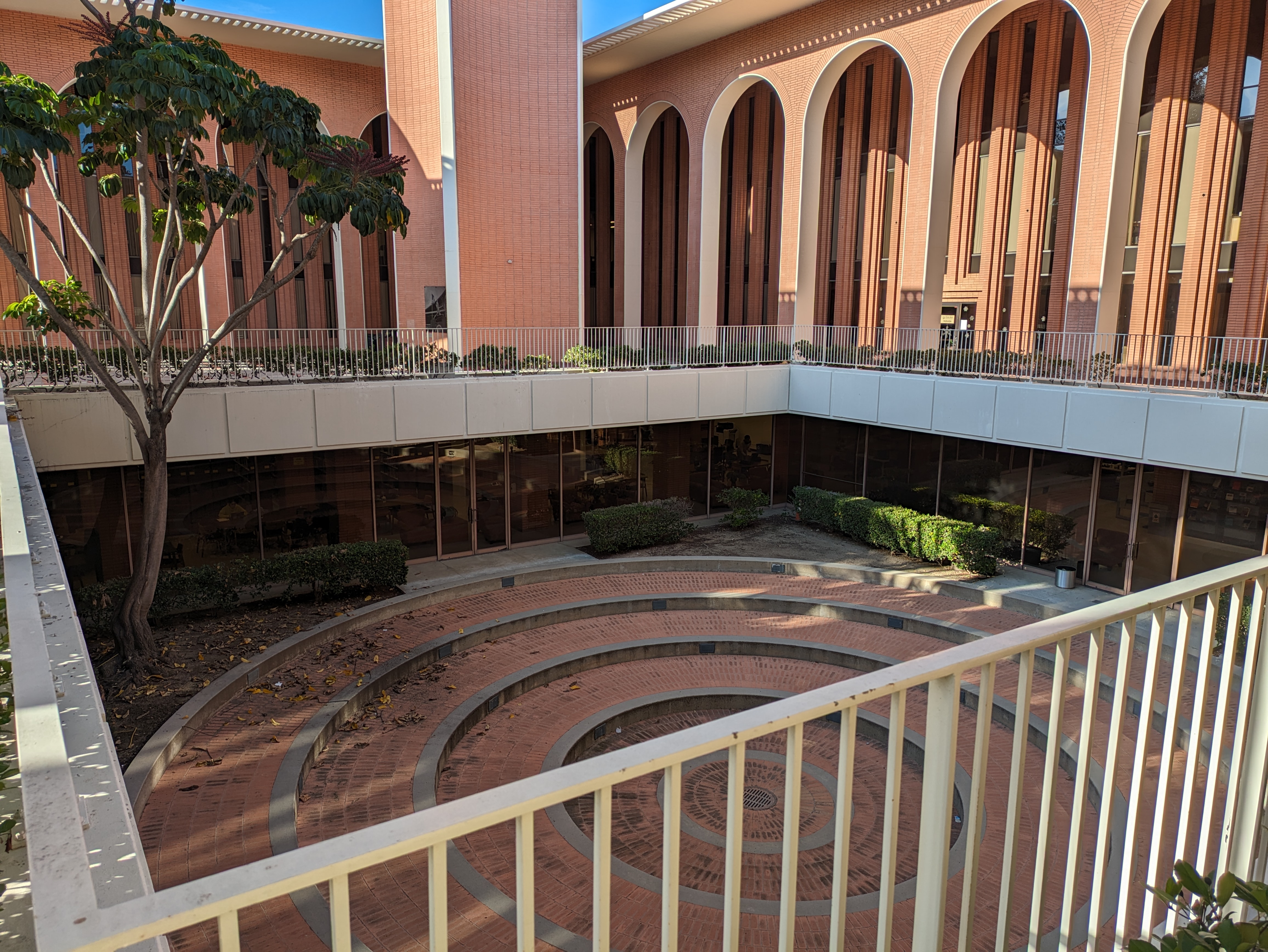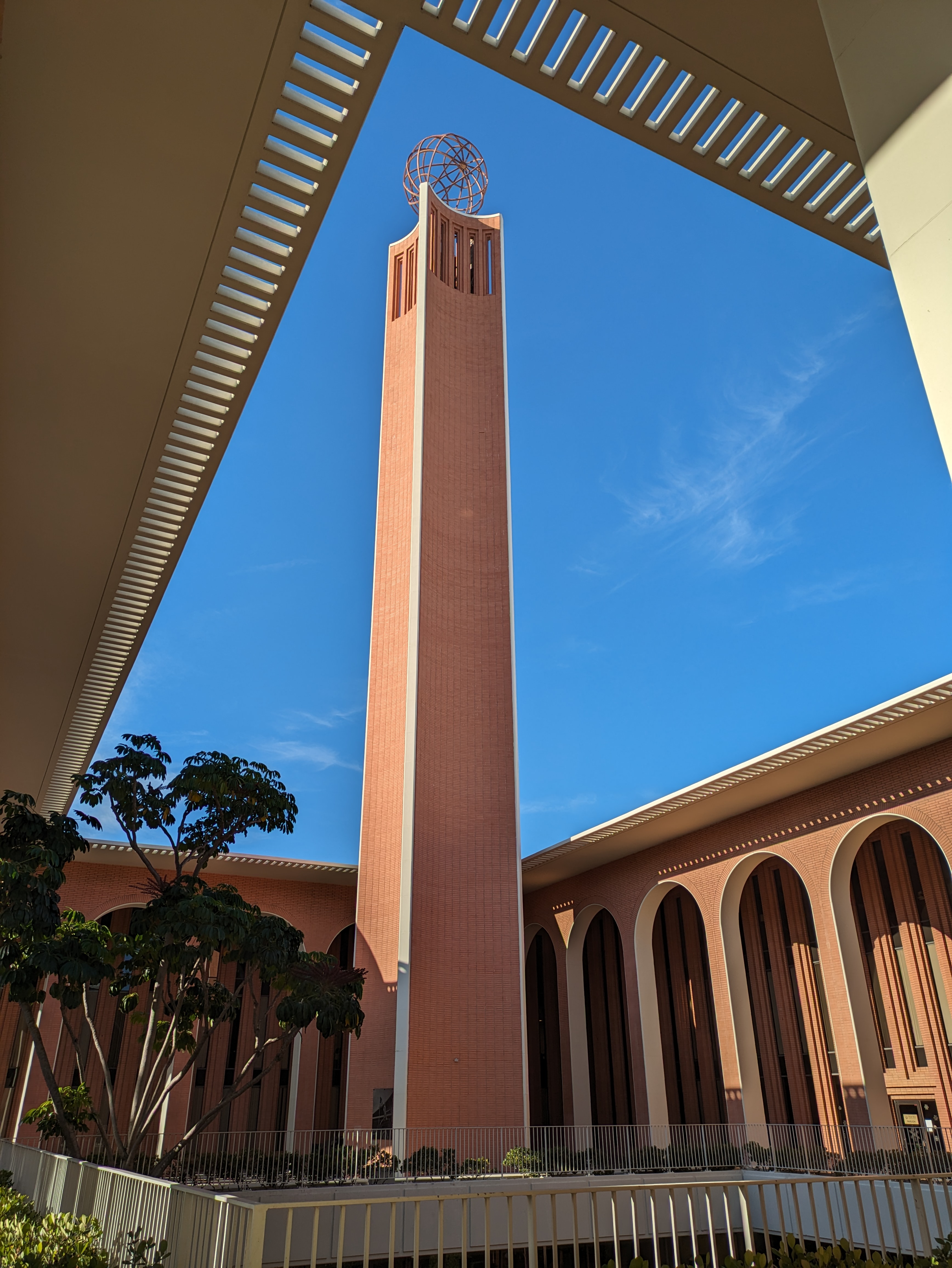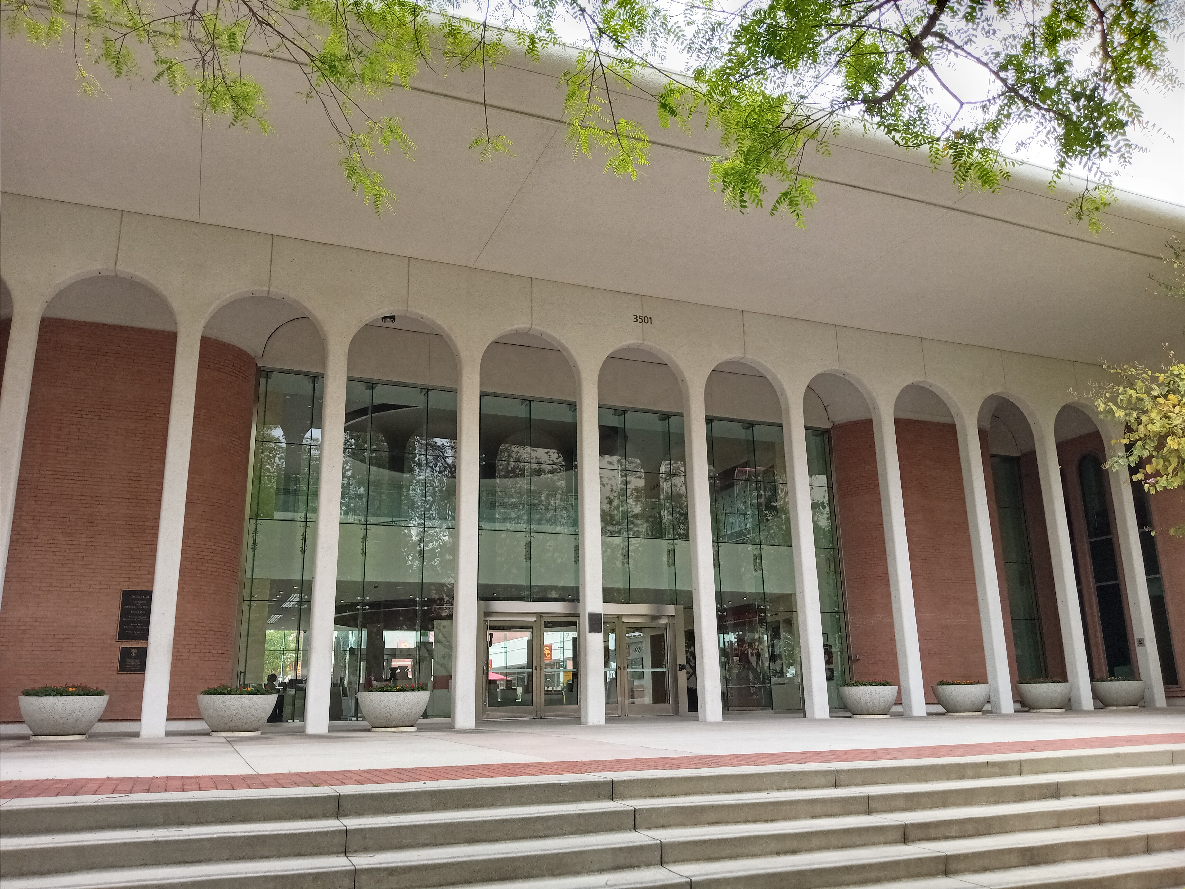Going north around the back of Doheny Library leads you into McCarthy Quad, a large lawn that plays host to major campus events as well as the weekly Trojan Farmers Market, which takes place every Wednesday from 11am-3pm during the fall and spring semesters. On the west side of the quad is the Center for International and Public Affairs, a fairly iconic building on campus that is immediately recognizable by its lofty tower topped with a globe. Built in 1964, the building was designed by Edward Durell Stone, a prolific modernist architect who designed many notable buildings, including MoMA in New York City, the JFK Performing Arts Center in Washington, D.C., and the U.S. Embassy in India. This is probably his most recognizable building in L.A., although he also designed university buildings for Caltech and in Claremont.