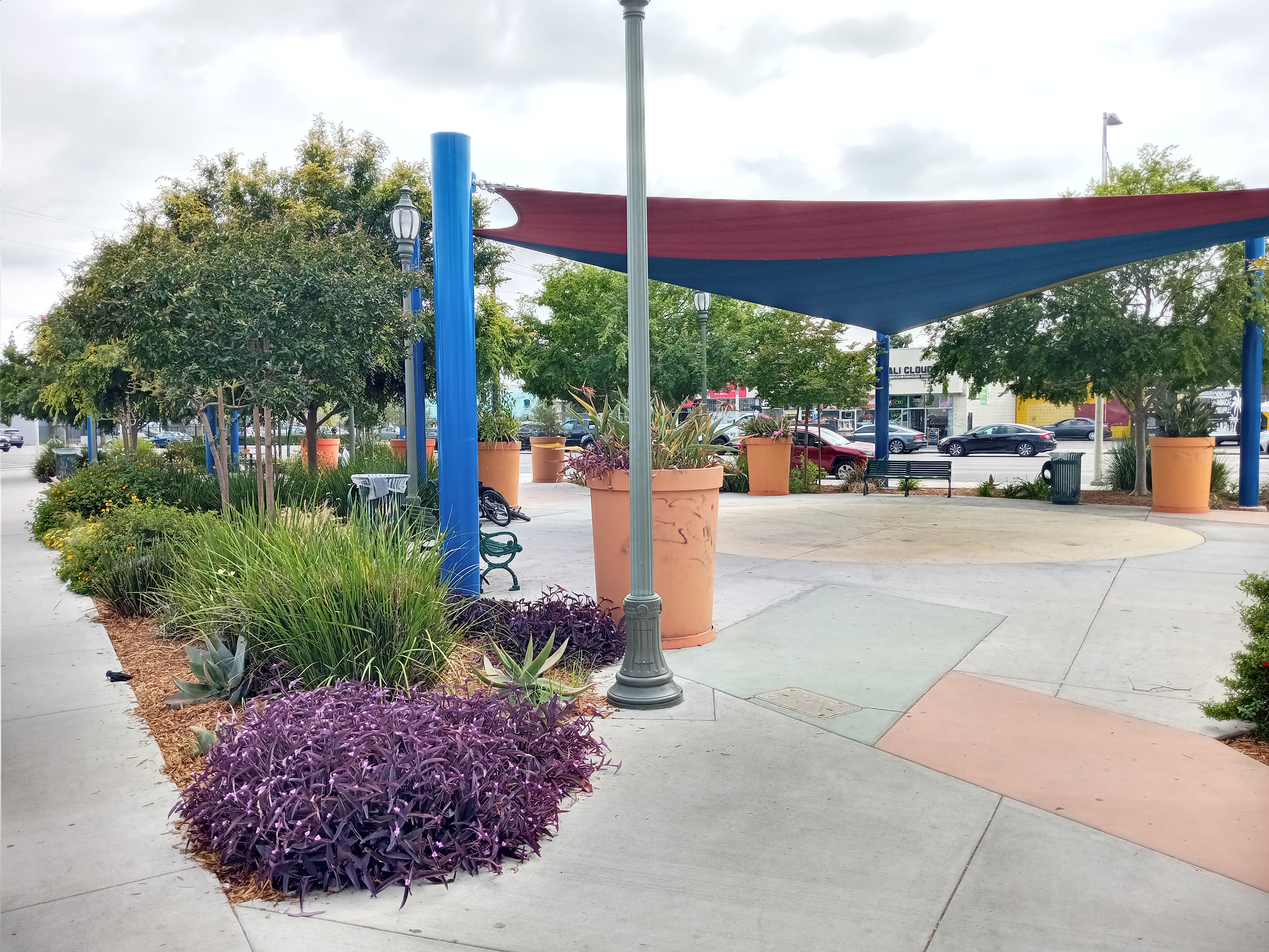 Continuing our walk around University Park, there’s a nice little public square across Hoover from the Velaslavasay Panorama, situated in the triangle formed by Hoover, 23rd Street, and Union Avenue. This little park is surrounded by a collection of storefronts with some nice coffee shops and restaurants. From here, we’ll continue east to the neighborhood’s other notable park, St. James Park, which sits on St. James Place halfway between Adams Blvd and 23rd Street, a few blocks east of Hoover. Though it’s a fairly plain lawn with some weathered planters today, at one point St. James was one of the most desirable neighborhoods in the city, a wealthy enclave at the turn of the century filled with Victorian houses, many of which still survive.