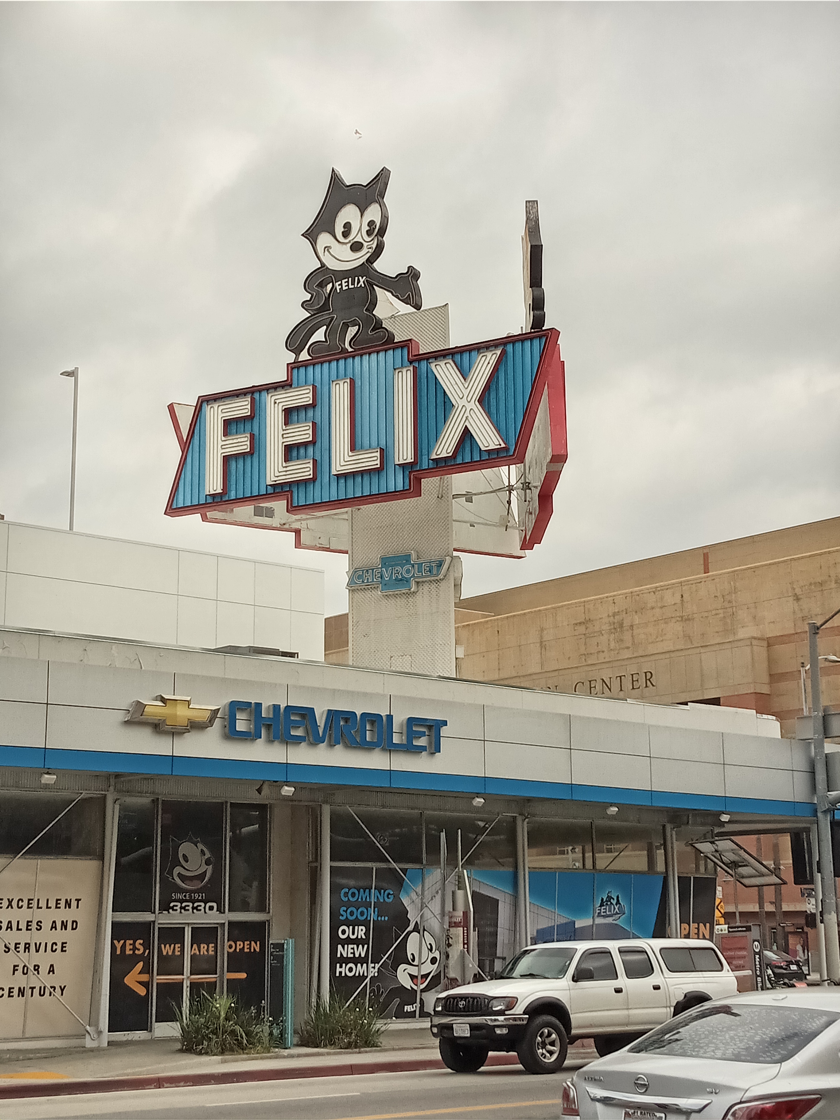 Returning to the campus via Figueroa, there’s one more neighborhood landmark to take in. At the intersection of Jefferson and Figueroa, across the street from the Galen Center basketball arena, is one of L.A.’s most iconic signs. Local car dealer Winslow B. Felix opened Felix Chevrolet in 1921, just two years after the introduction of Felix the Cat, which quickly became one of the most popular animated characters in history. Felix (the car dealer) became friends with Felix the Cat’s creator and was granted the right to use licensed images of the character to promote his dealership. In 1957, a giant three-sided neon sign was added to make the business visible from the newly-constructed 110 freeway. A massive parking garage has since been added to the back of the dealership, blocking the view of the sign from the freeway, but the sign still towers over Figueroa and remains an iconic symbol of the city’s car culture to this day.