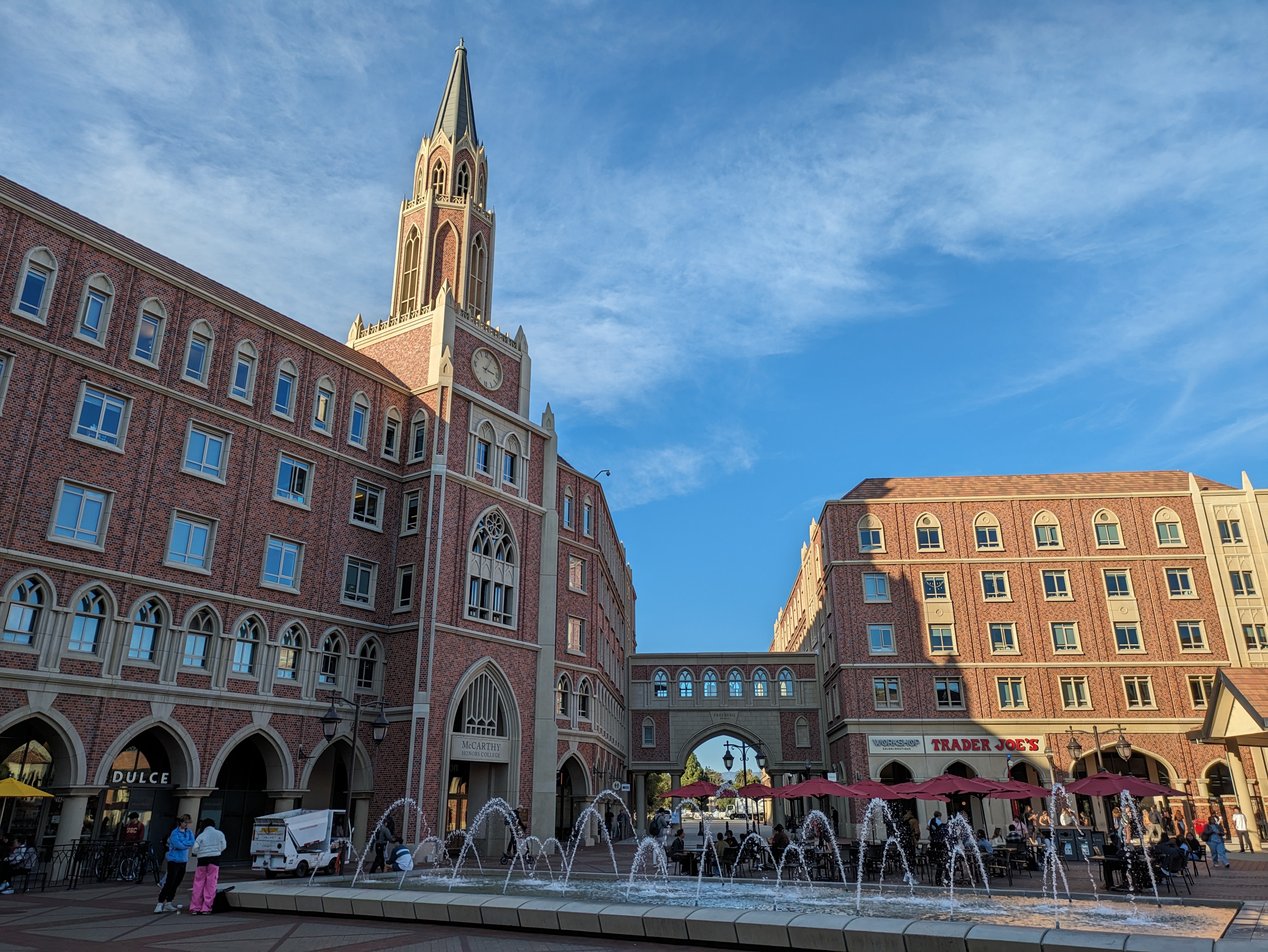 Returning to the northern gateway of campus and crossing the scramble crosswalk at Jefferson and Hoover, you’ll enter USC Village, a massive housing and retail complex built to serve the student population. When classes are out, this becomes arguably the center of activity on campus, with swarms of students running errands, grabbing something to eat, or just relaxing in the massive Italianate piazza adorned with a statue of Hecuba, the mythical queen of Troy. There are plenty of great places to eat here, or you can grab a coffee from the immensely popular location of Cafe Dulce.