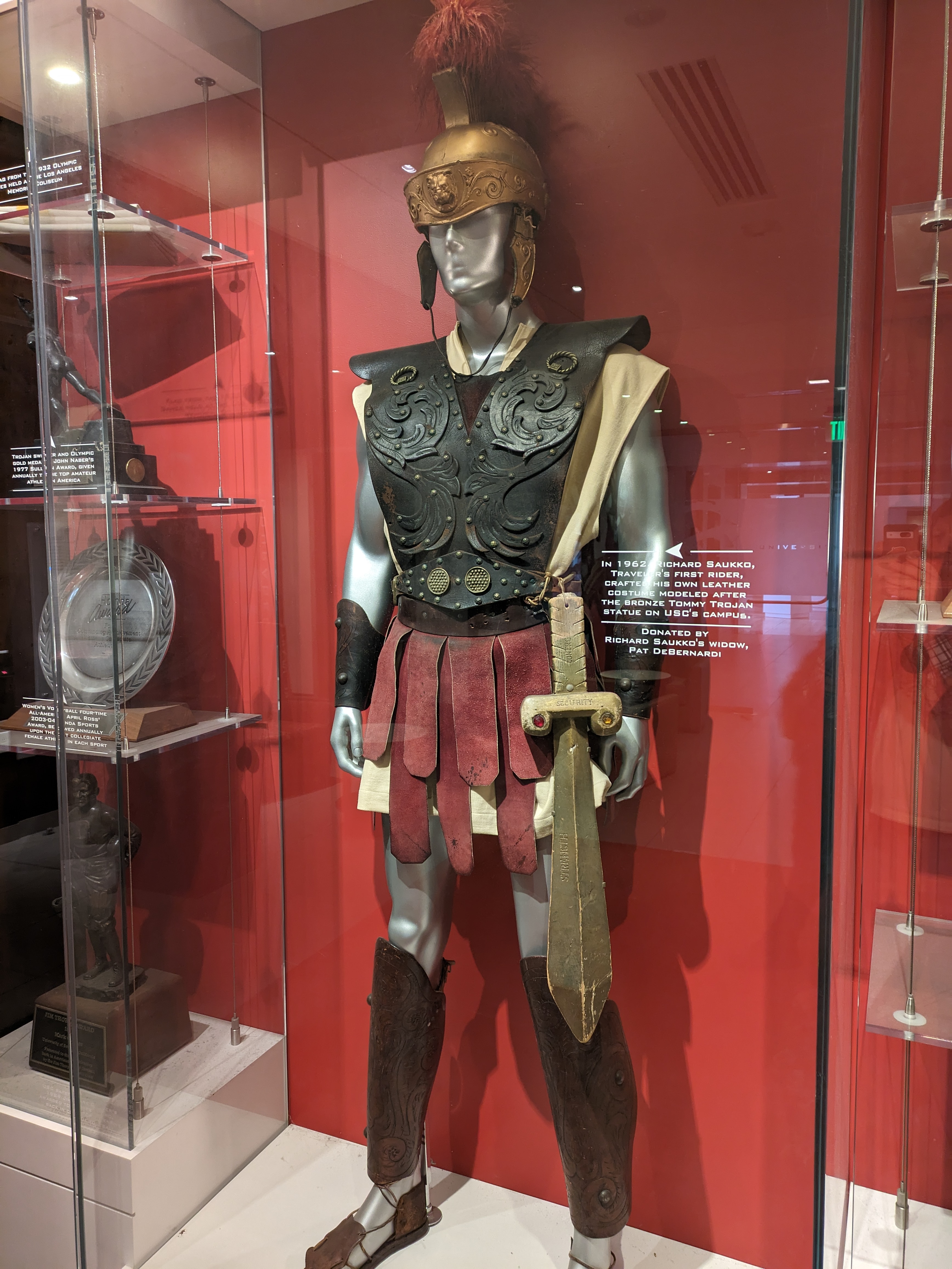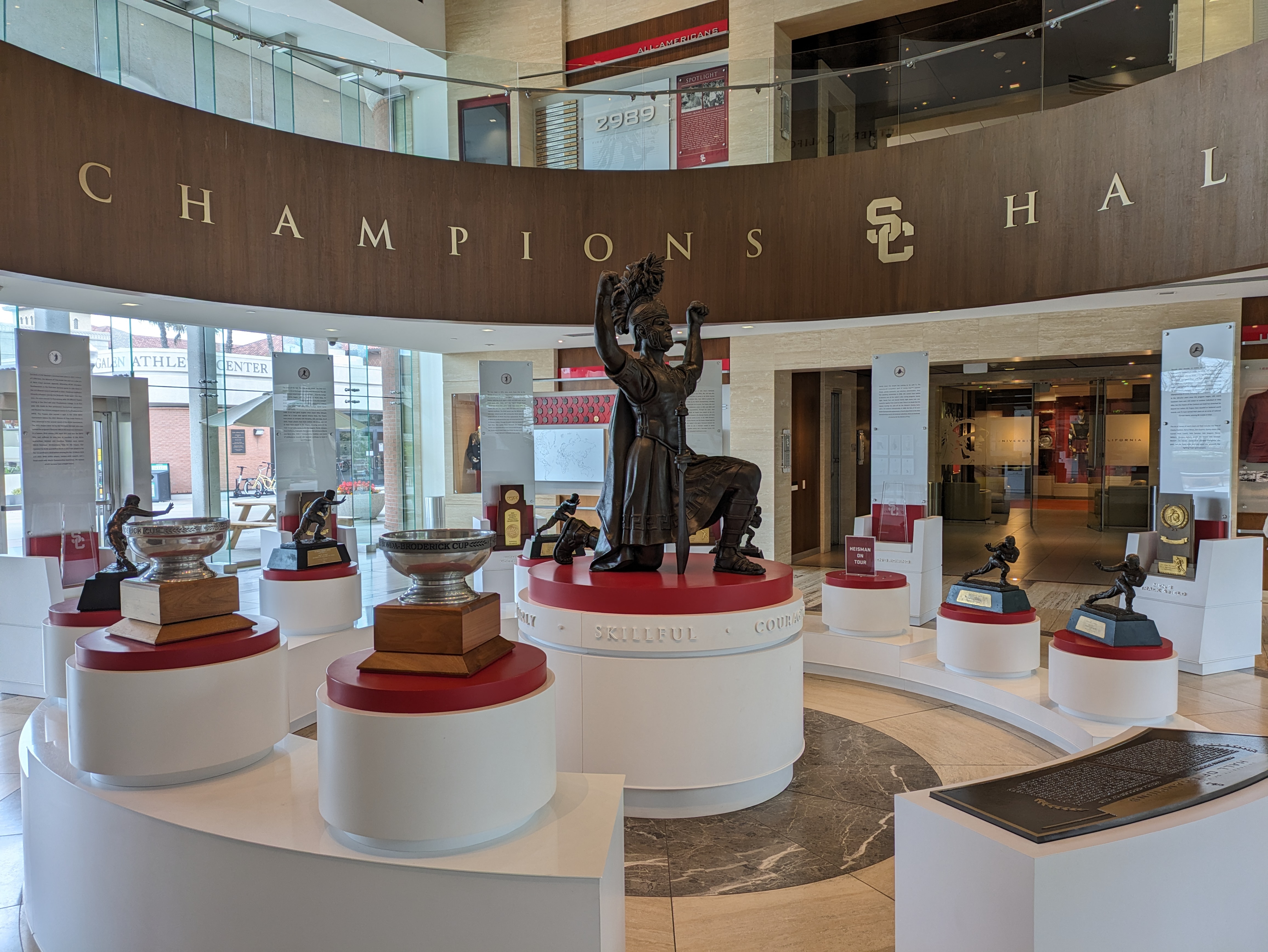 Past the theaters is the Heritage Hall, which serves as the gateway to the athletics center and sports fields on the west side of campus. The building itself holds a little museum celebrating the USC athletics division, with a “Hall of Champions” full of trophies and awards in the lobby and more artifacts in an adjacent gallery. Even for non-sports fans, there’s some fun stuff to look at in here, like an old Trojan mascot costume and a room for a big trophy cup that gets swapped between the winner of last year’s USC-UCLA rivalry.