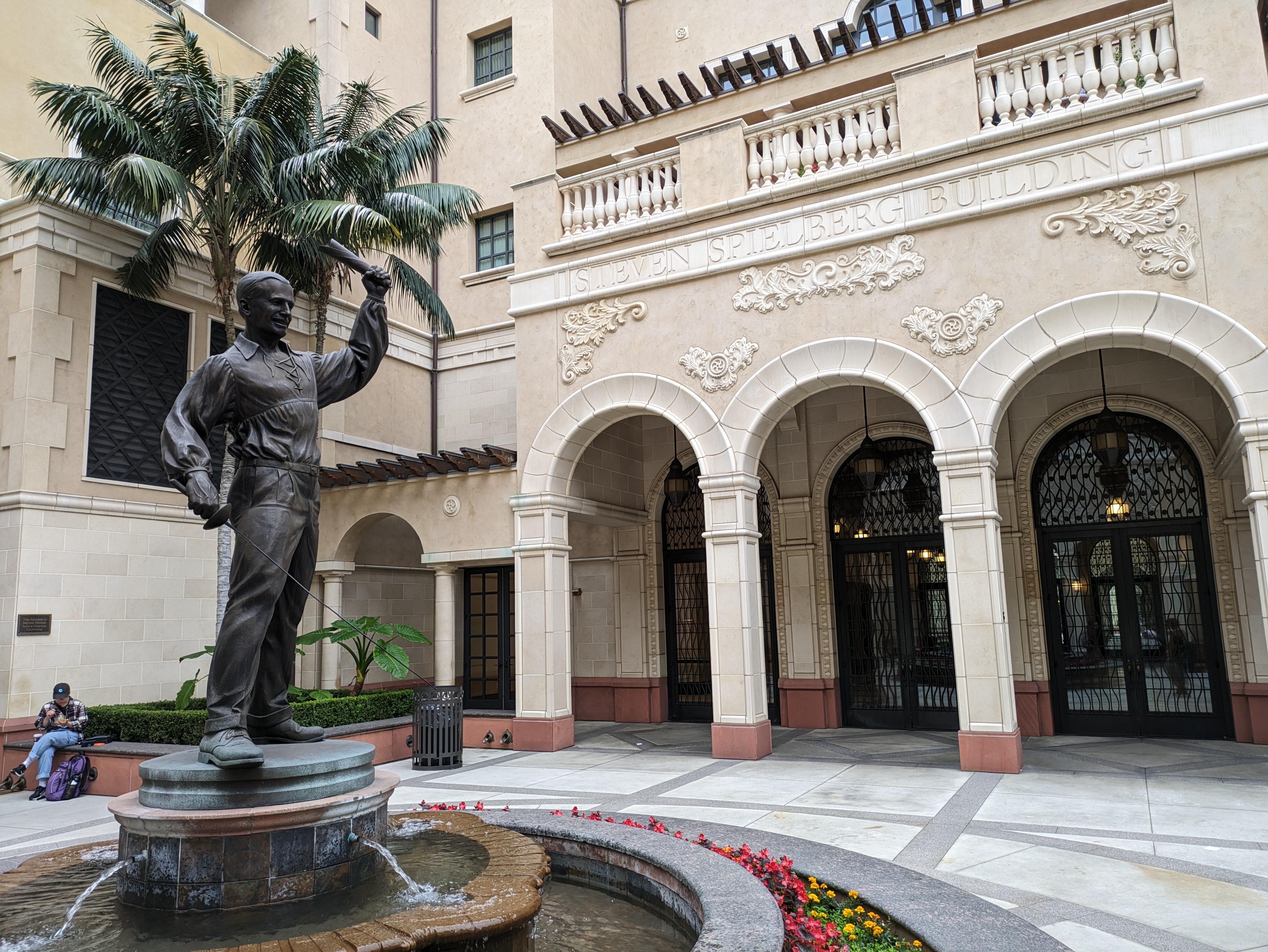 Just to north of Heritage Hall is one of the crown jewels of the university, the School of Cinematic Arts. It’s hard to overstate the level of influence this school has had on Hollywood; this is one of the oldest and most prestigious film schools in the country, with an alumni list to match. The two wings of the main building are named for Stephen Spielberg (who did not attend USC; he was rejected by the film school and attended Cal State Long Beach instead, which he dropped out of to intern at Universal Studios) and arguably USC’s most famous alum: George Lucas. Separating the two wings is a lovely Mediterranean style courtyard with a bronze statue of silent film legend and “King of Hollywood” Douglas Fairbanks, who had a hand in the development of the school.
