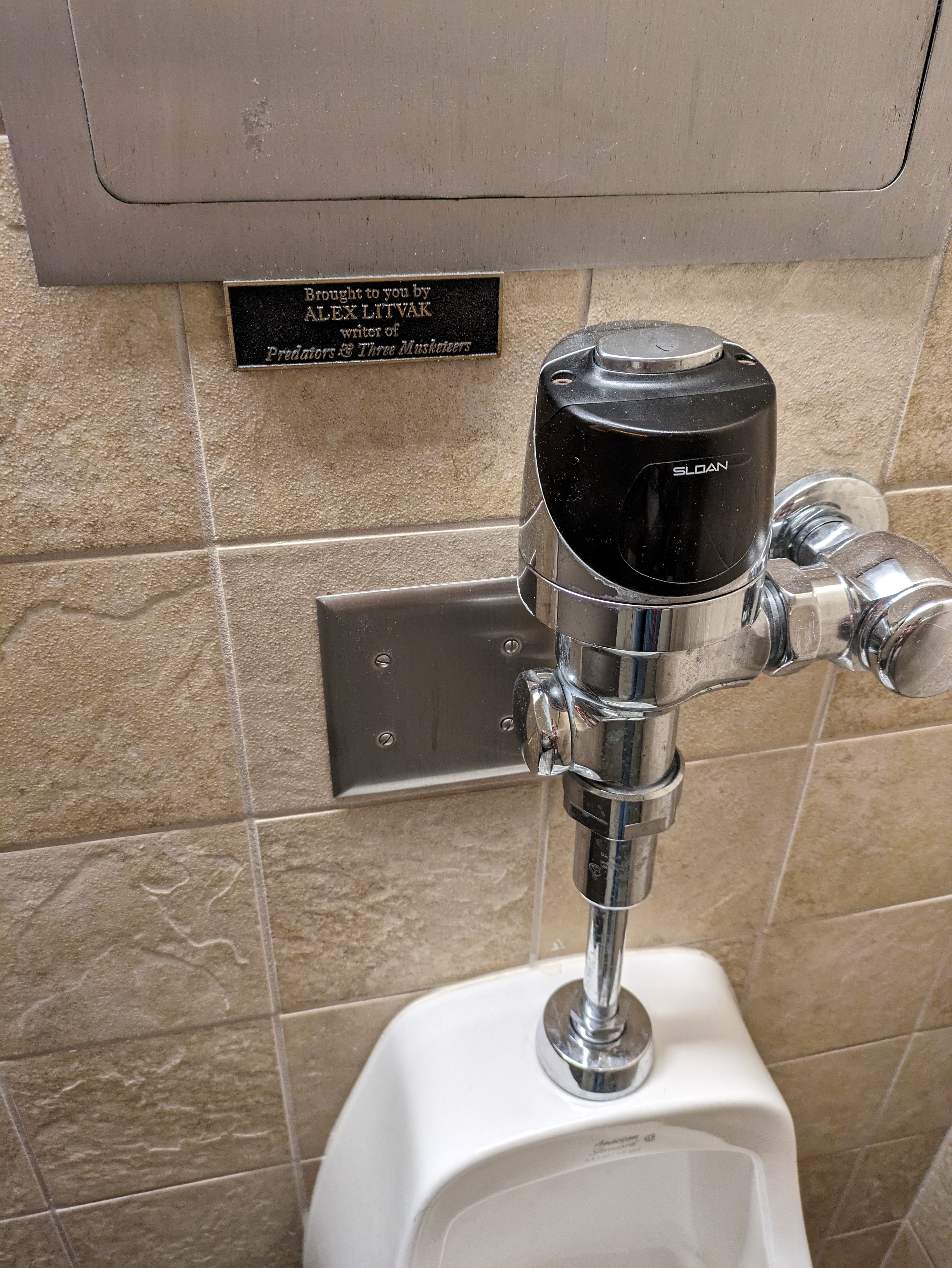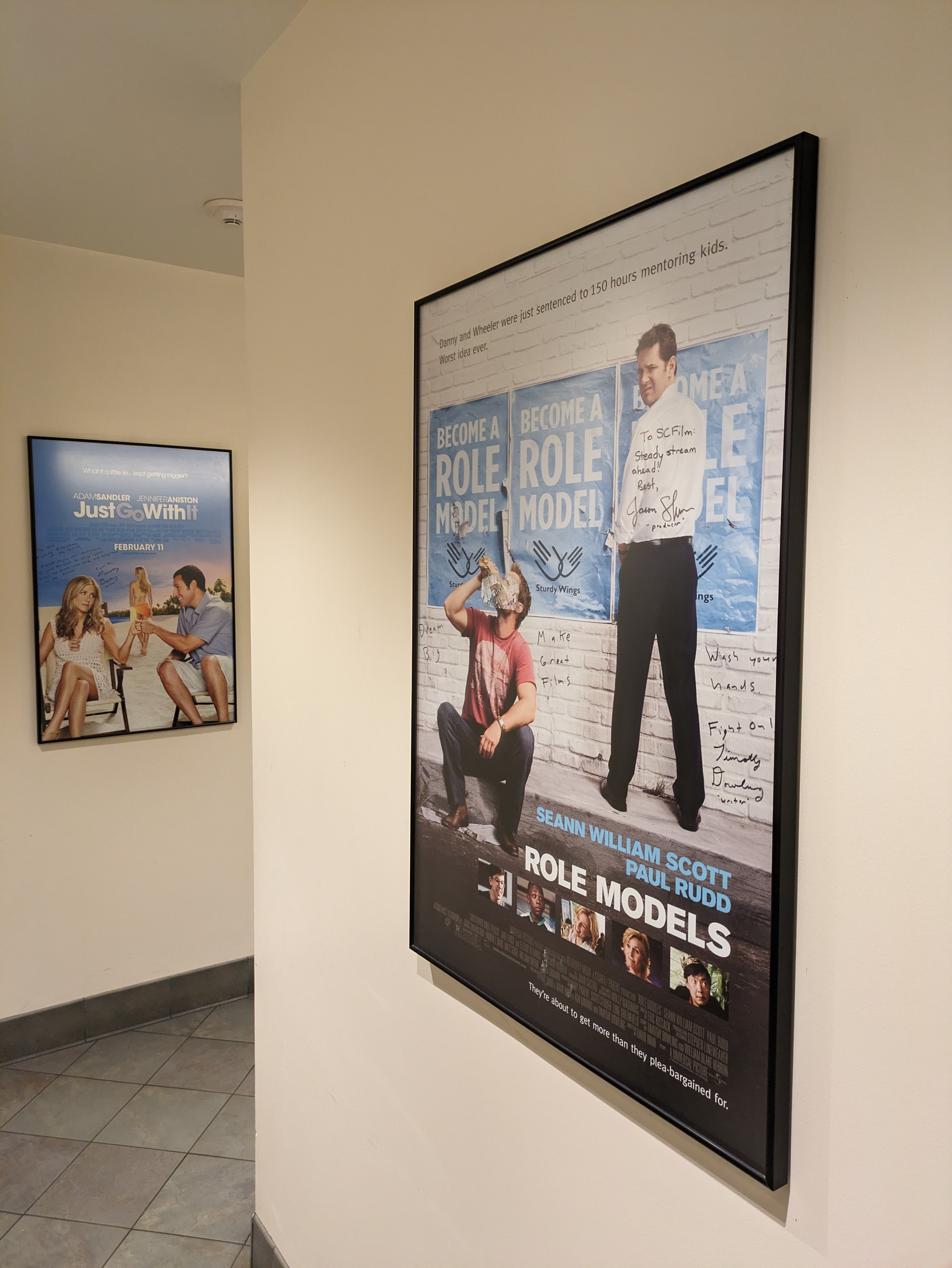 And then there’s the men’s restroom in the Lucas wing, where every single urinal and toilet stall has been sponsored by a film producer or writer, with accompanying signed film posters of the movies they worked on. Fittingly, the movies highlighted here are mostly raunchy comedies of the 2000s and 2010s, starring actors like Paul Rudd and Adam Sandler.