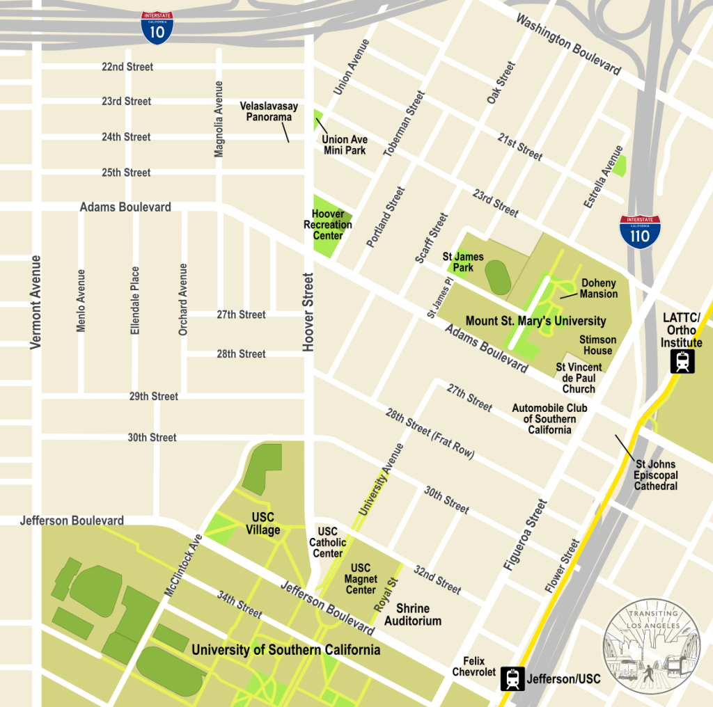 From here, the Jefferson/USC station on the E Line is just a block east, so you can quickly return to the train there, or continue down Figueroa and reenter the USC campus if you want to return to the start.