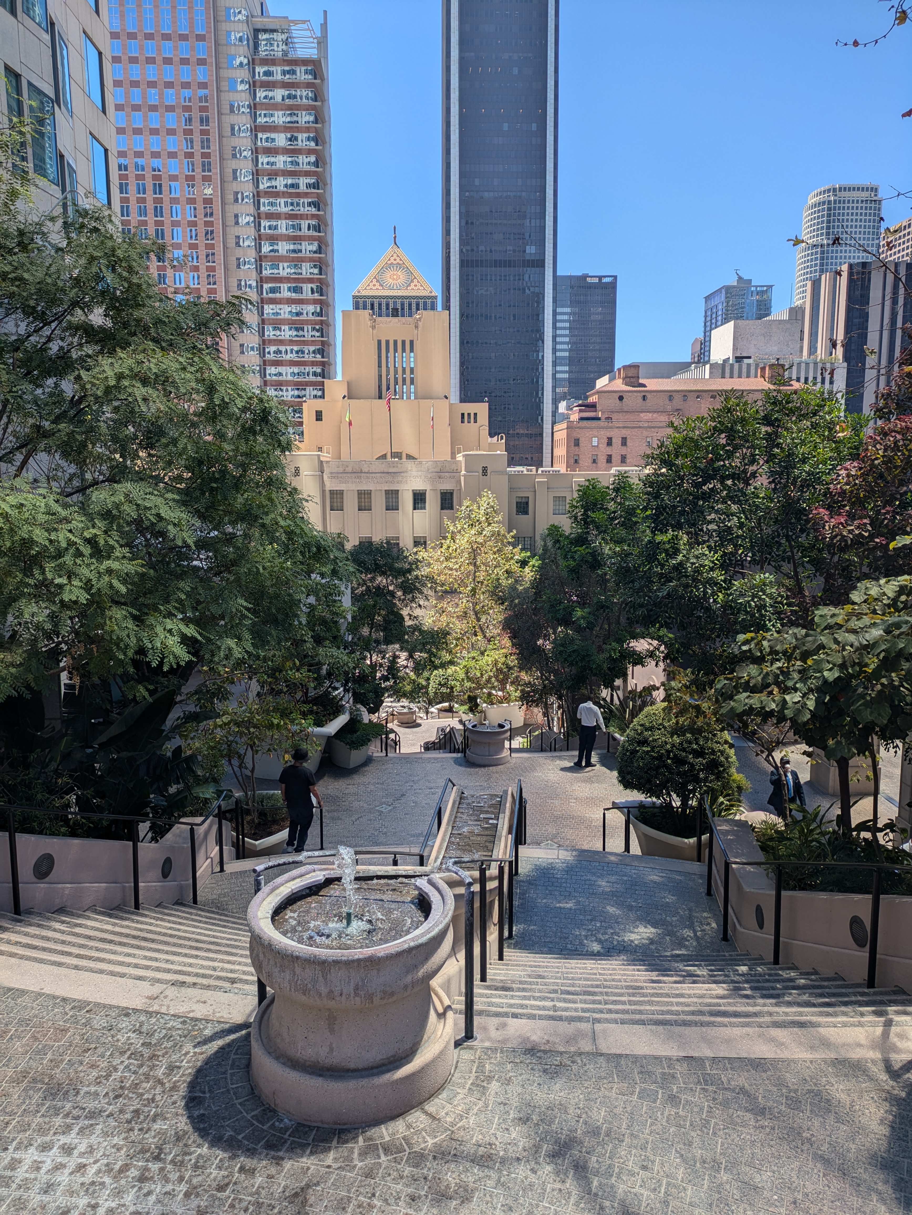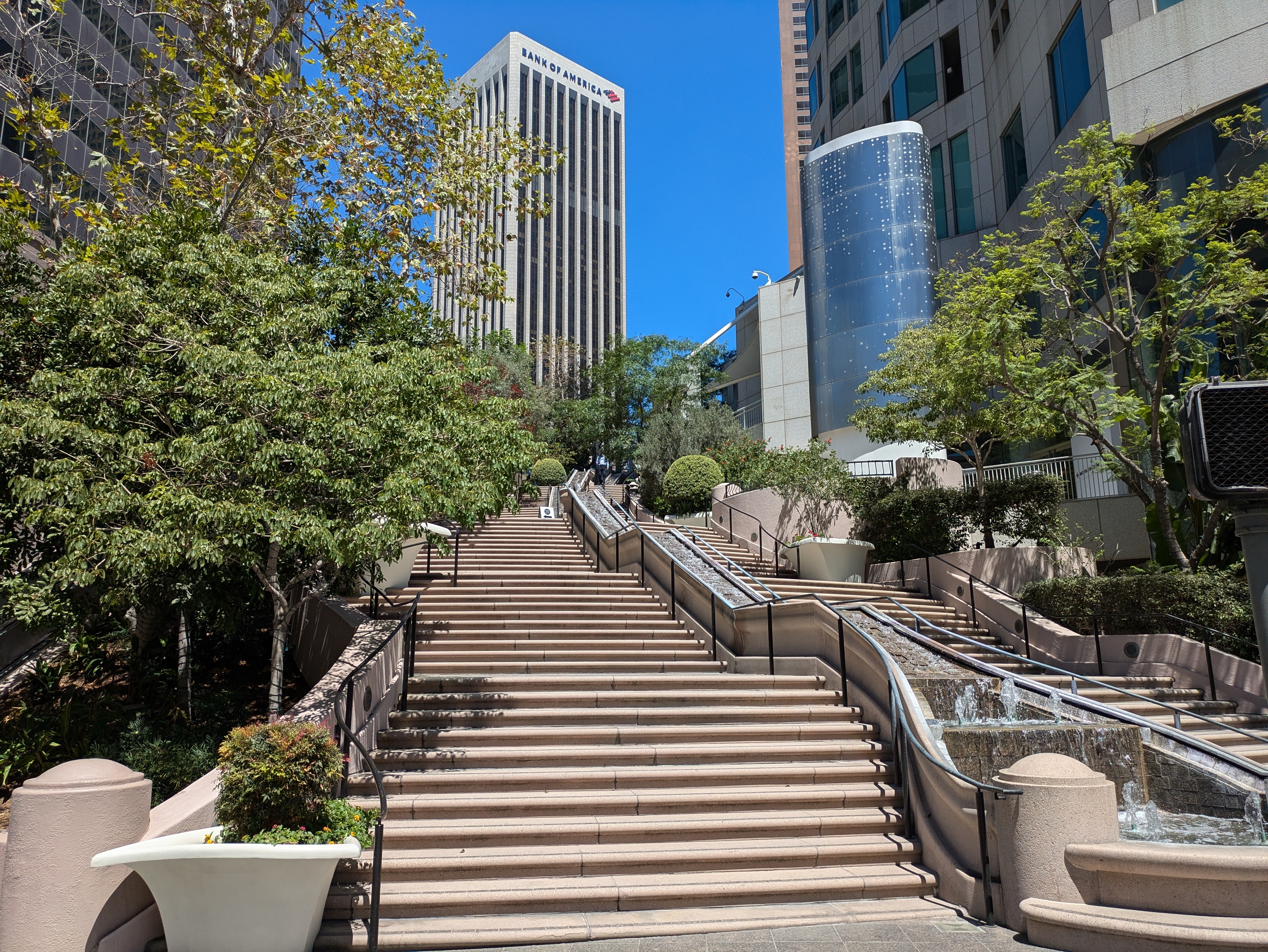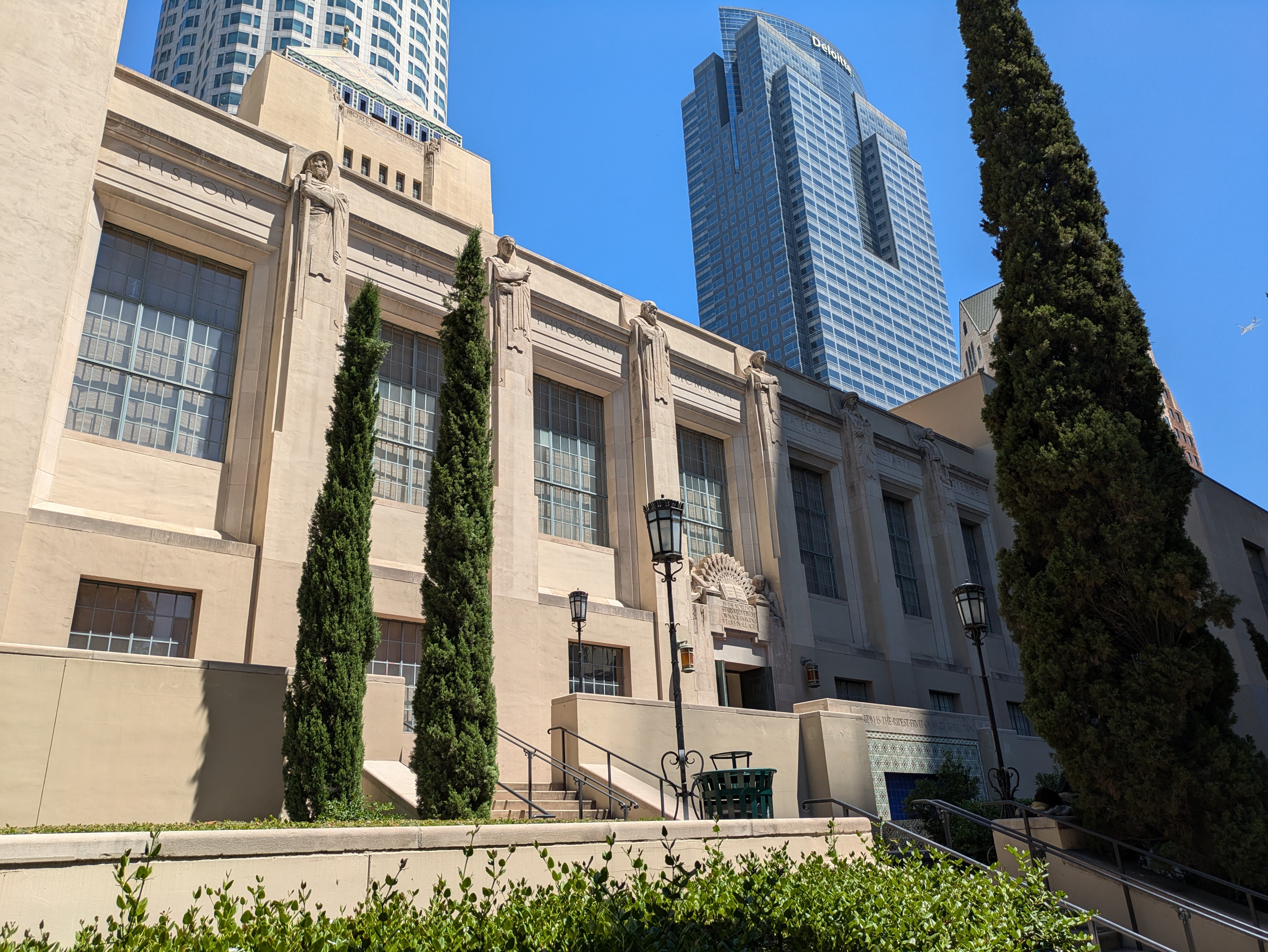If you’re coming from the Grand Avenue/Bunker Hill district, the better option is to walk down Hope Street (one block west of Grand) towards the U.S. Bank Tower (which itself owes its existence in part to the library), then walk down the scenic Bunker Hills Steps down to the 5th Street entrance, enjoying an iconic view of the library on the way down.